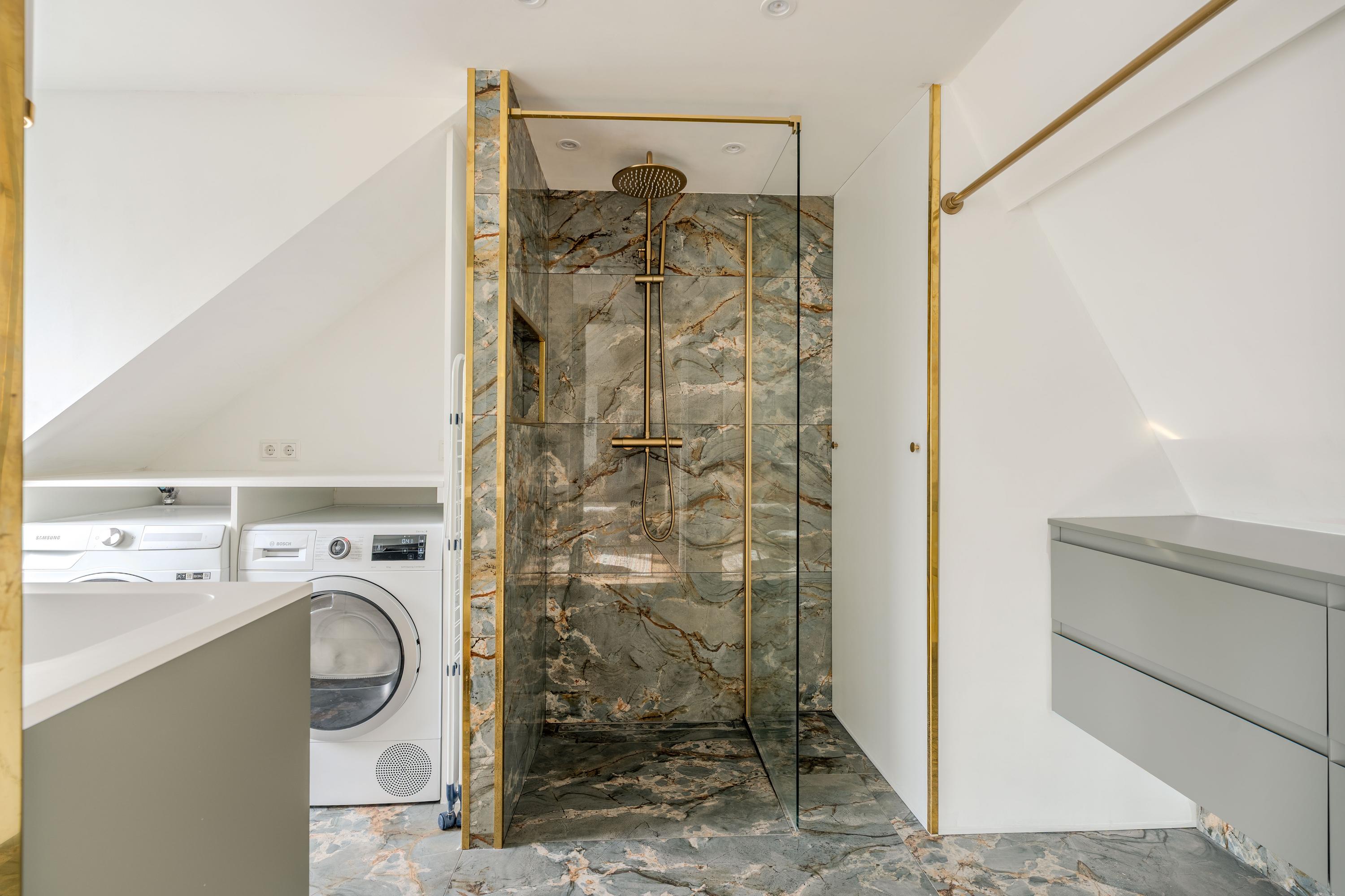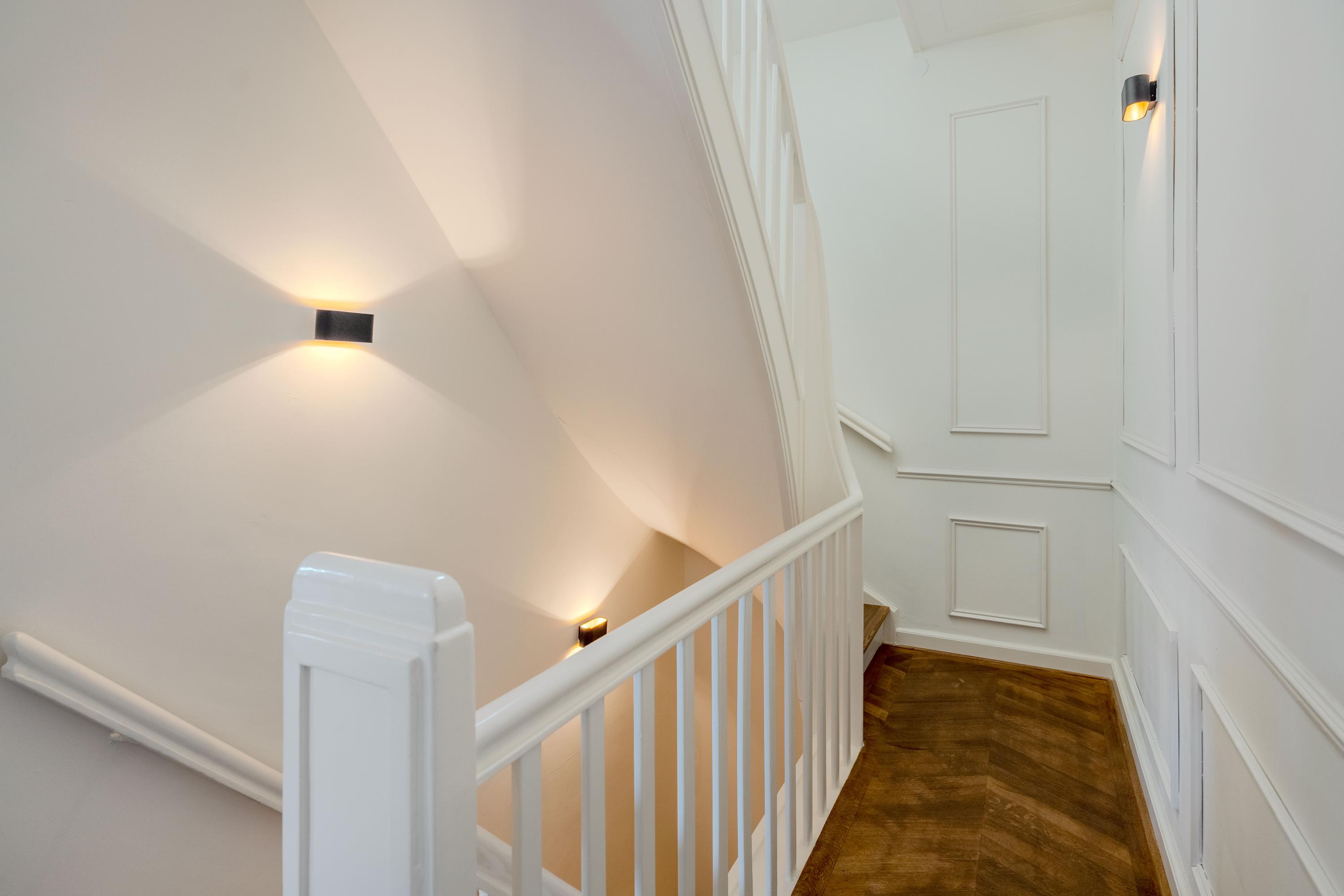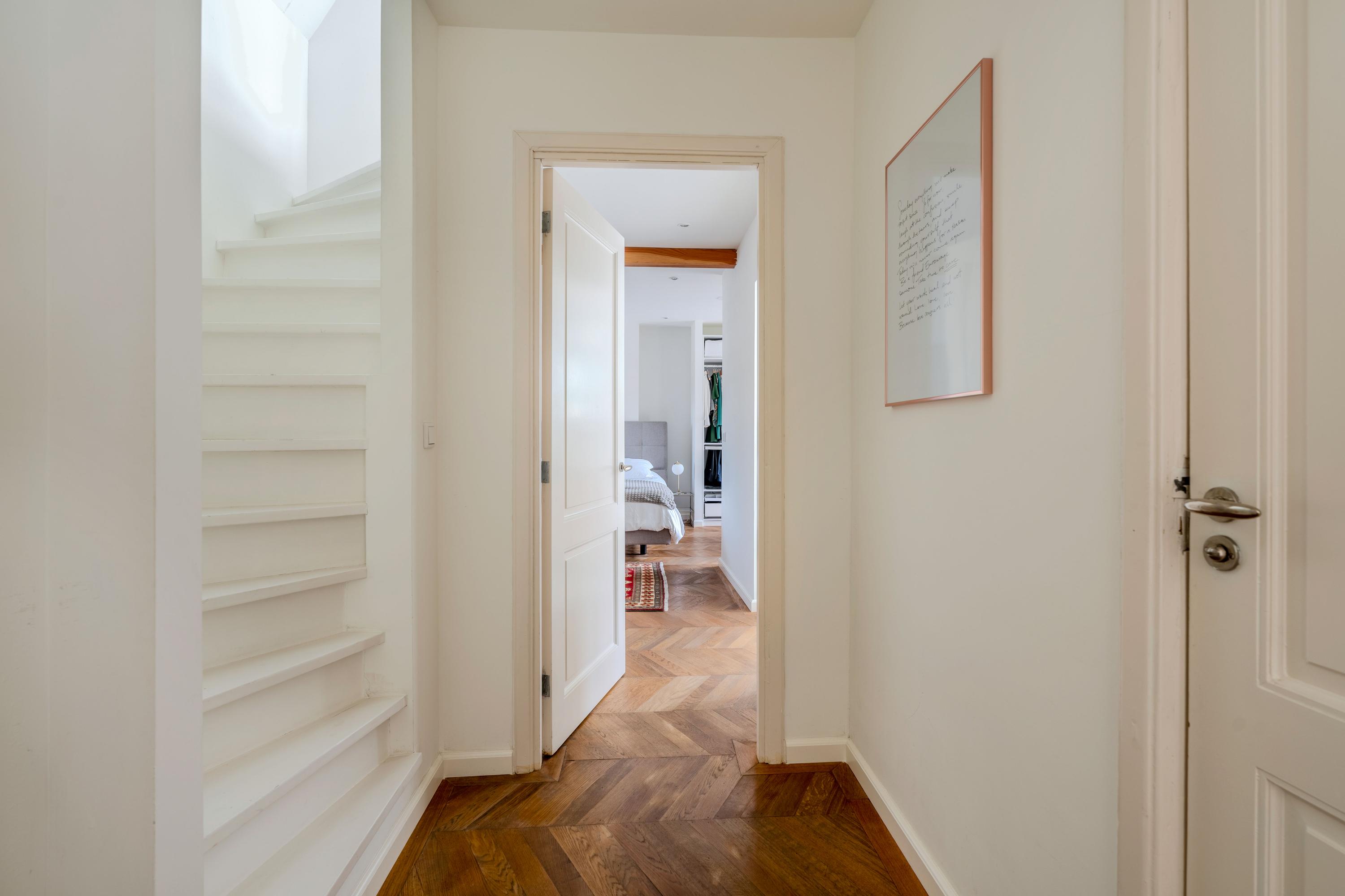 يفتح الطابق الرئيسي مع مدخل خاص وسلم، ليكشف عن منطقة معيشة رحبة مع نافذة بارزة ومدفأة أصلية وخزائن مدمجة مصممة خصيصًا. في الخلف، تم ترتيب مطبخ الطعام الواسع حول جزيرة مركزية، ومزود بأجهزة حديثة تشمل موقد كهربائي وفرن مشترك وثلاجة ومجمد وغسالة أطباق. يضفي بار أنيق مع خزائن نبيذ بحرارة مضبوطة طابعًا عصريًا على المناسبات الاجتماعية، في حين تؤدي الأبواب المنزلقة إلى شرفة هادئة. توفر أربع غرف نوم وثلاثة حمامات الراحة والمرونة للعائلة أو الضيوف. يتميز الطابق العلوي بنافذة جديدة على سطح السقف، تضيف إضاءة طبيعية ومساحة متعددة الاستخدامات مناسبة لغرفة نوم أو استوديو. تتوج الشقة شرفة على السطح بمساحة 43م² حيث يفسح إيقاع المدينة المجال للسماء المفتوحة.