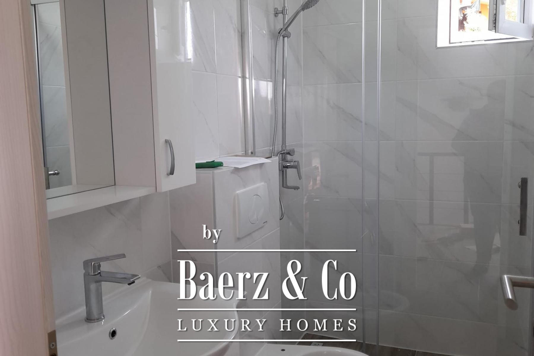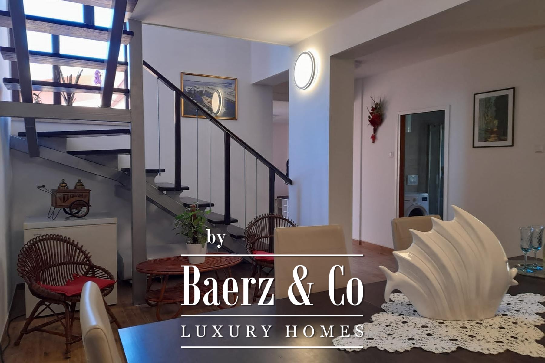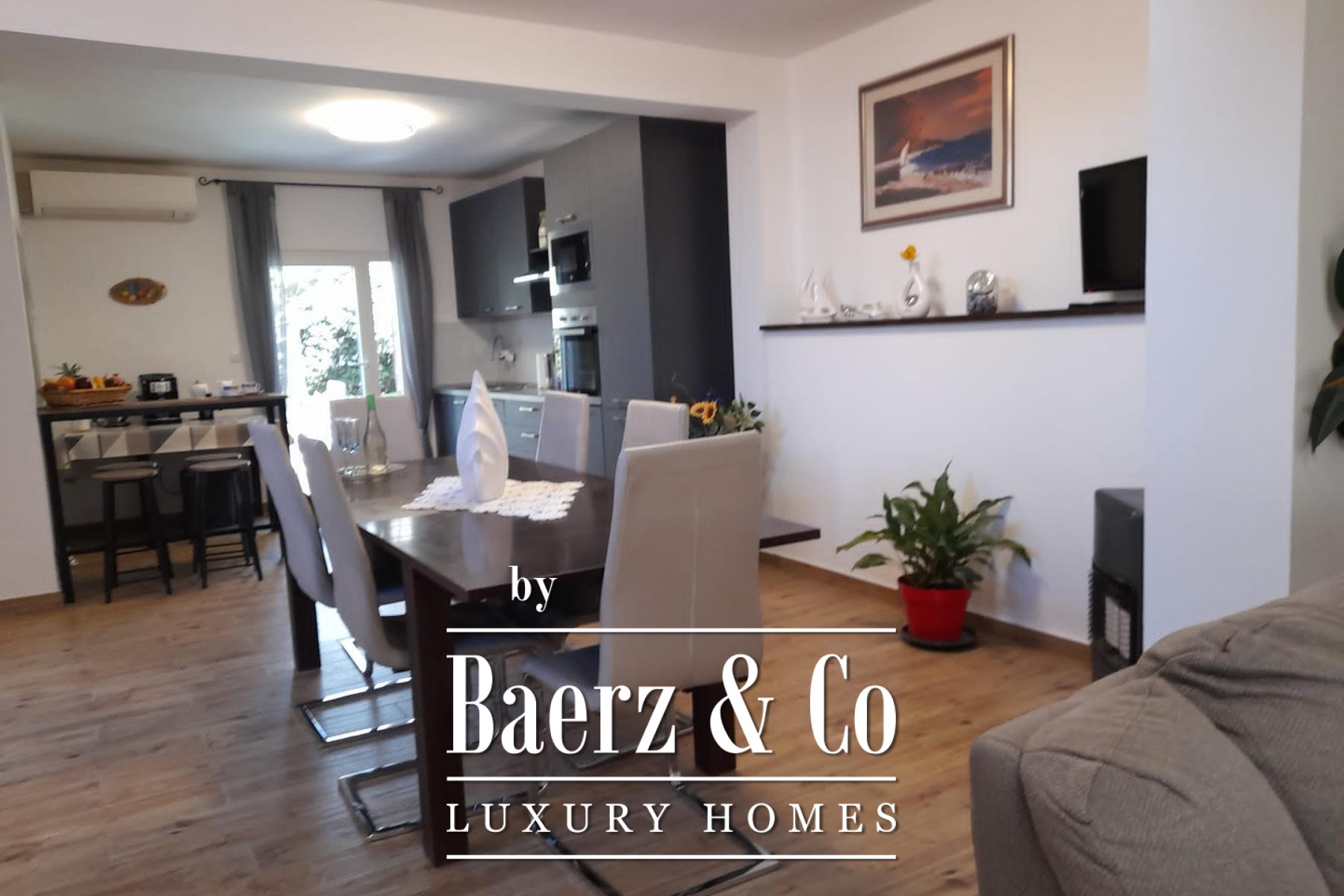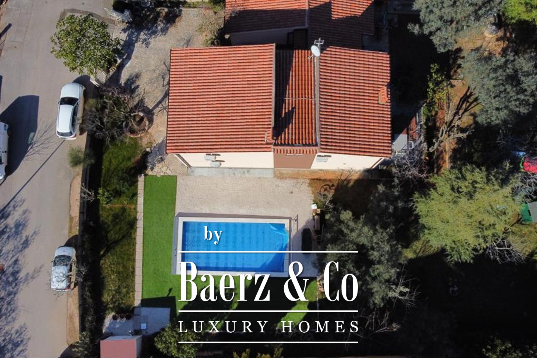 يمتد المنزل على مستويين. ينساب الطابق الأرضي بنور رحب وأحجام مدروسة ضمن مساحة معيشة واسعة، ومطبخ مجهز بالكامل، وحمام، جميعها تتجه نحو التراس والمسبح البالغ مساحته 48 م². تم دمج المرآب بهدوء ضمن إيقاع المكان. تكمّل الحديقة المجاورة للمسبح، والتي تحتضن مدفأة خارجية، التجربة بإبراز ملمح كرواتي رصين.