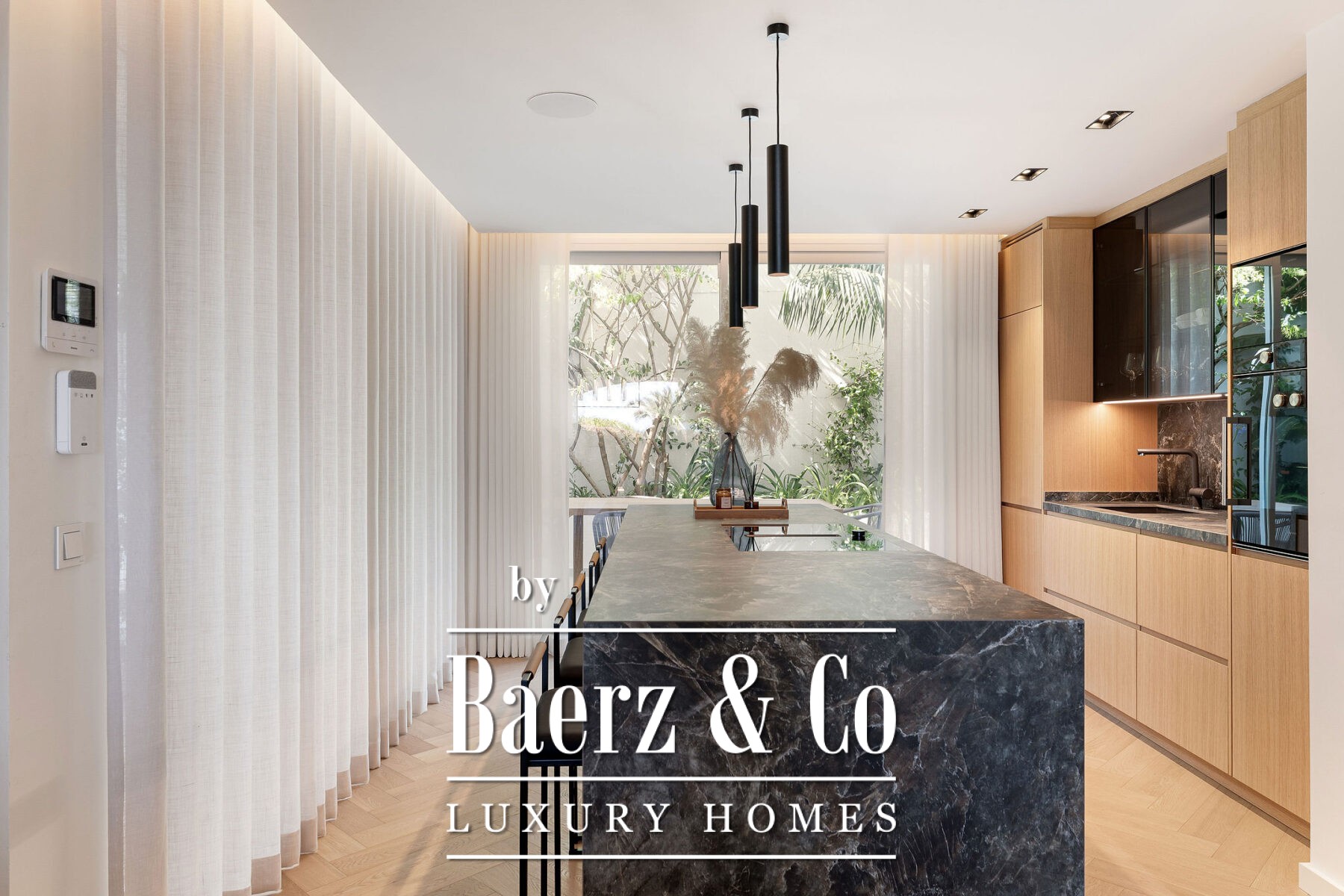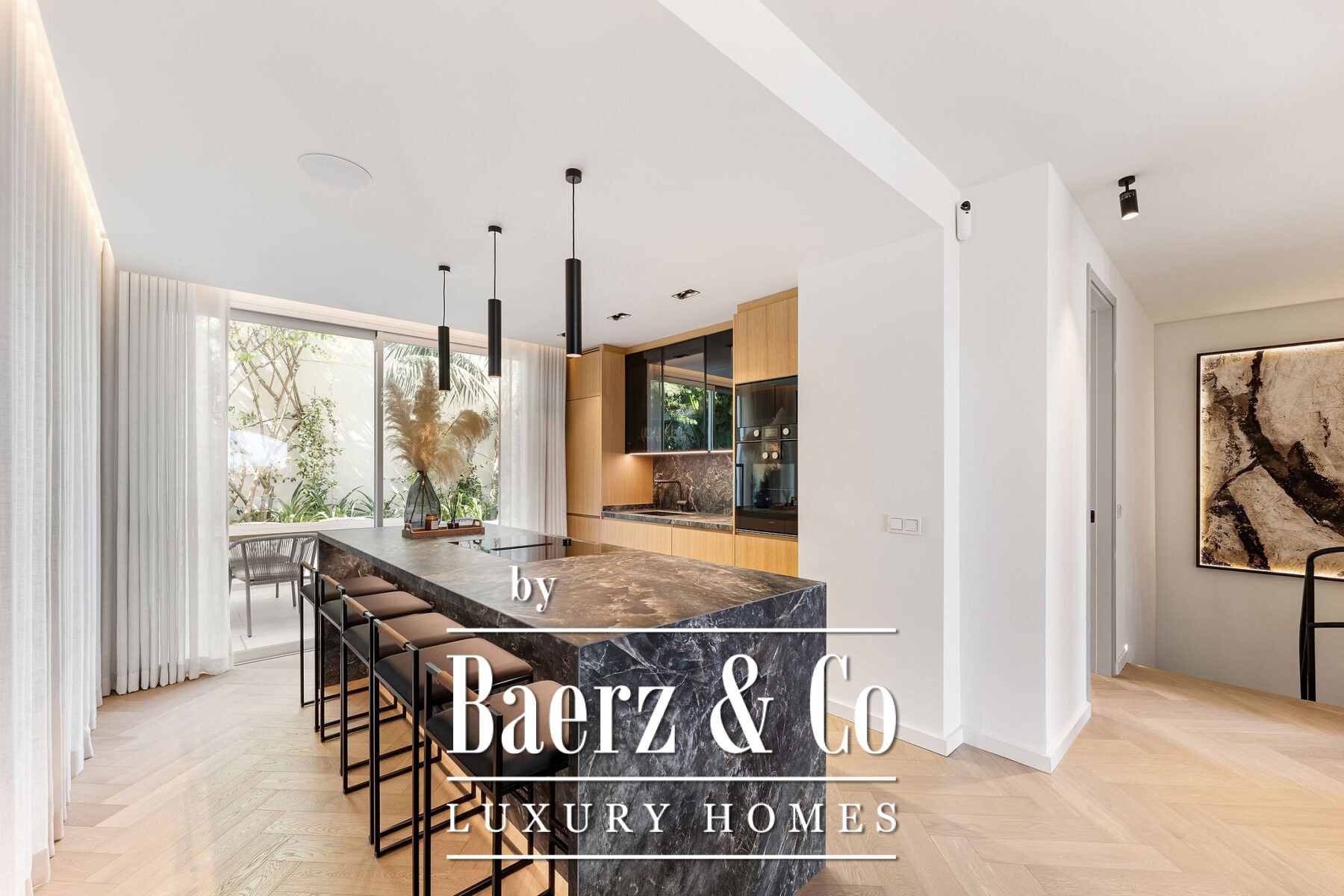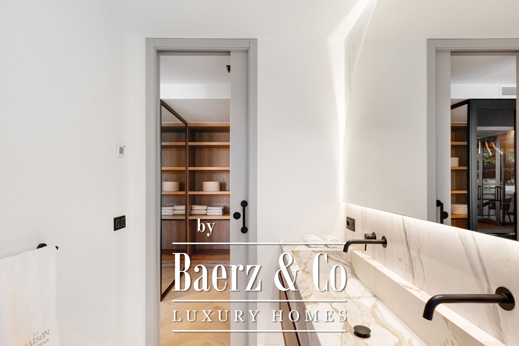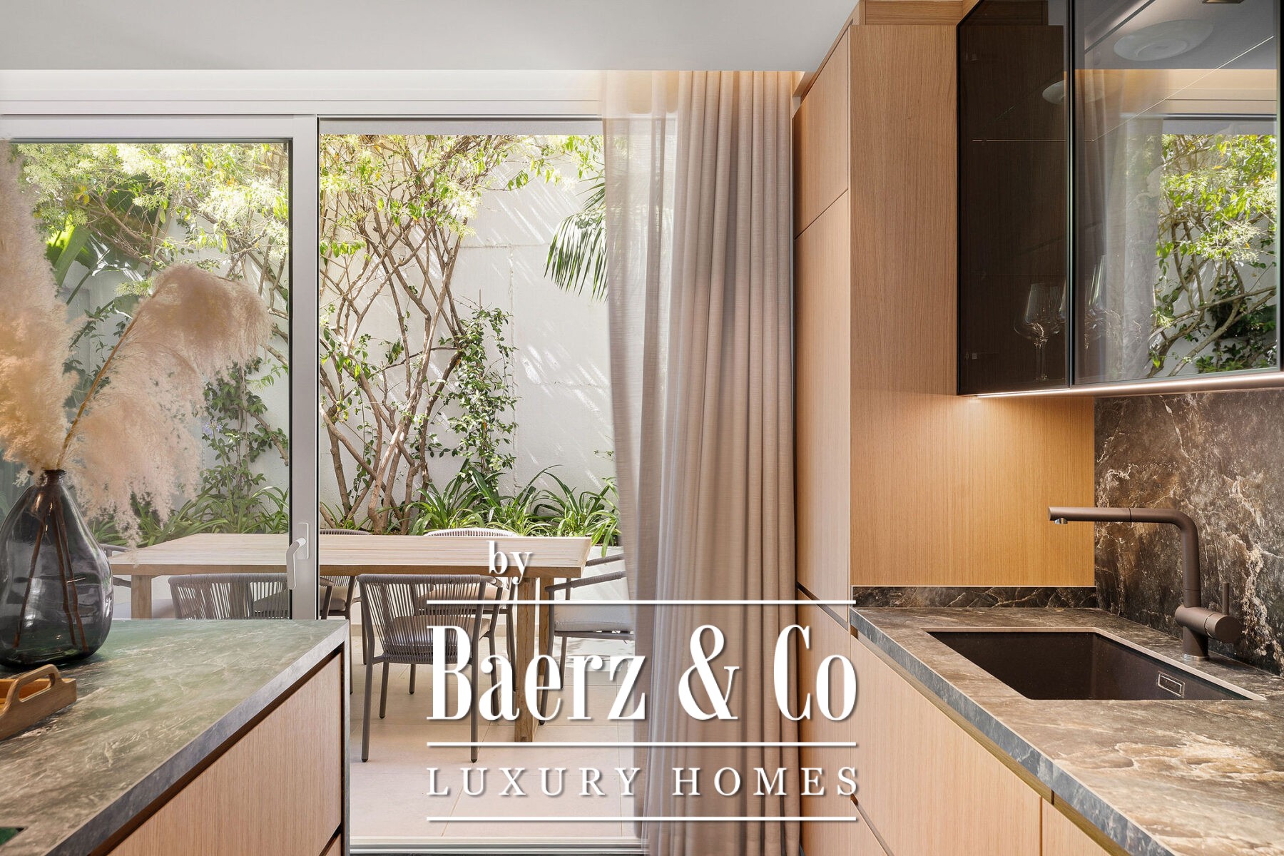 في الطابق الأرضي، تبرز الإضاءة الطبيعية في مساحة المعيشة المفتوحة، ومنطقة الطعام، ومطبخ Gaggenau المتطور، حيث تطغى التشطيبات الخشبية والرخامية الفاخرة. تمنح الأرضيات بنمط عظم السمكة ولوحة الألوان الحيادية دفئاً ورُقياً هادئاً. يفتح الصالون على فناء خاص مثالي لتناول الطعام في الهواء الطلق أو الاسترخاء في جو خاص. الجناح الرئيسي الفخم يضم خزانة ملابس واسعة وحوض استحمام مستقل يطل على التراس، بالإضافة إلى حمام داخلي. يتيح وجود غرفة نوم إضافية في هذا الطابق مرونة الإقامة للعائلة أو الضيوف.