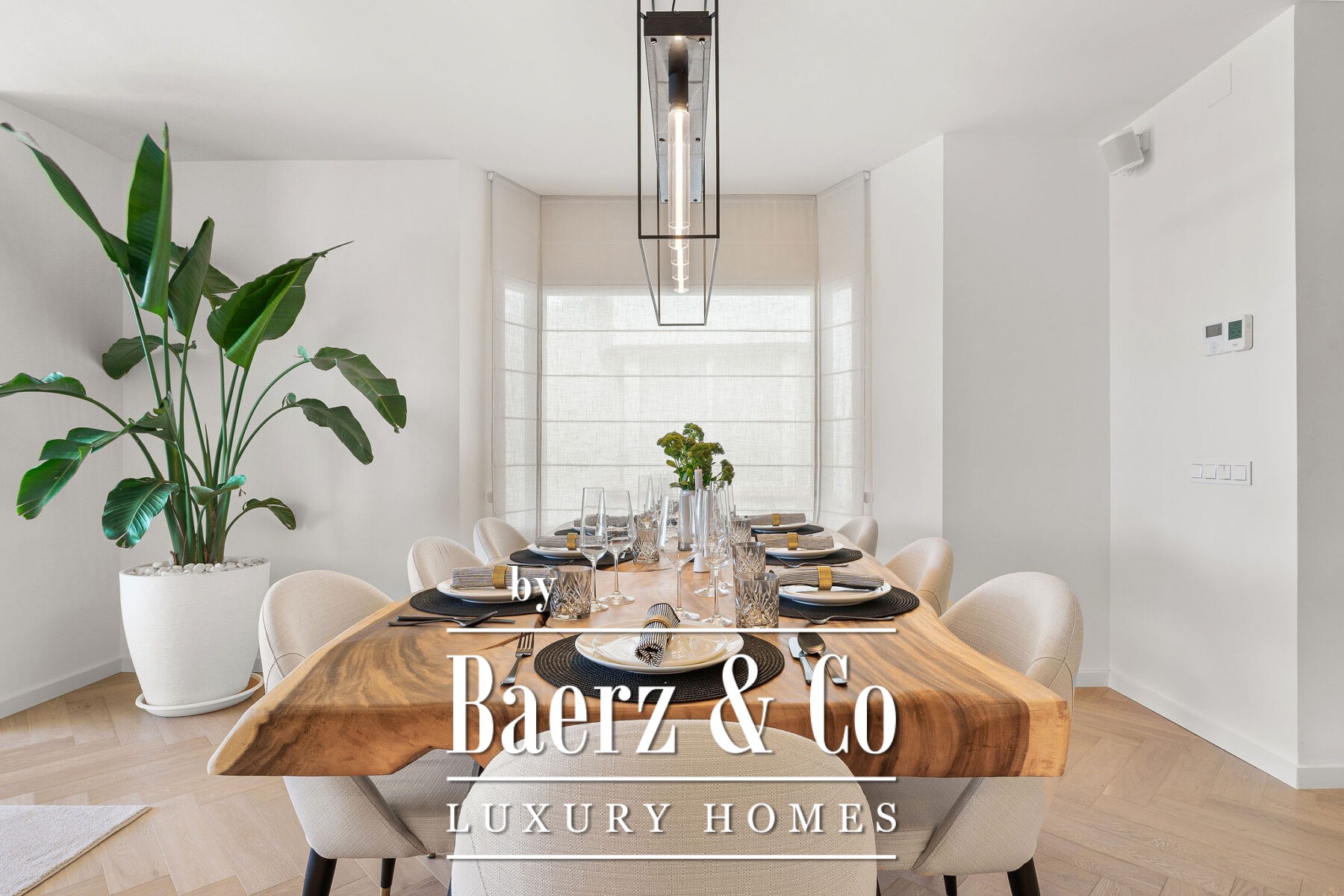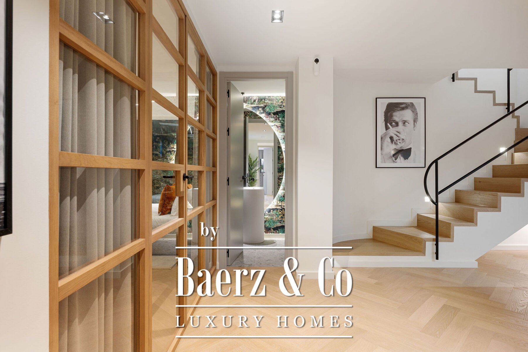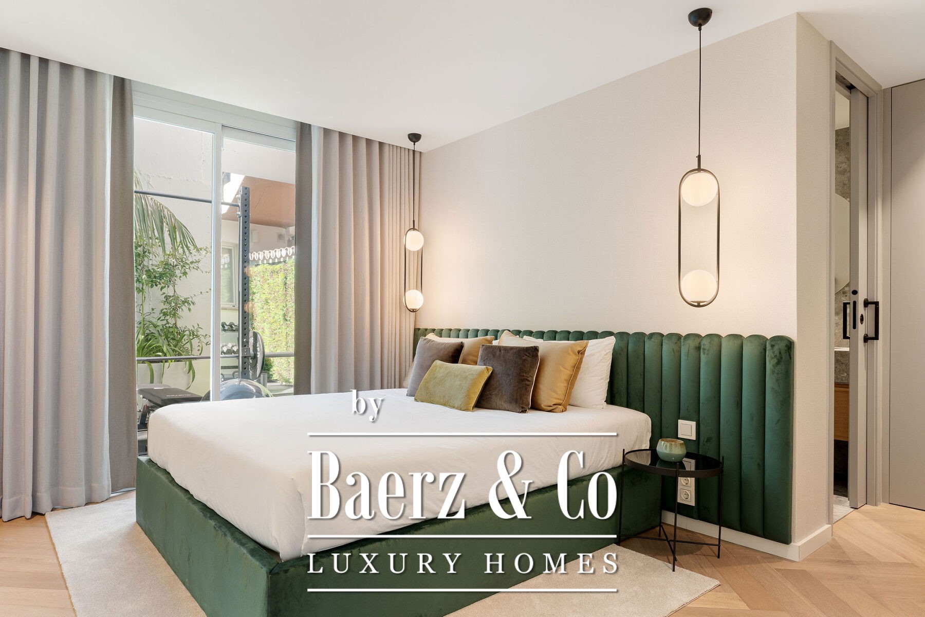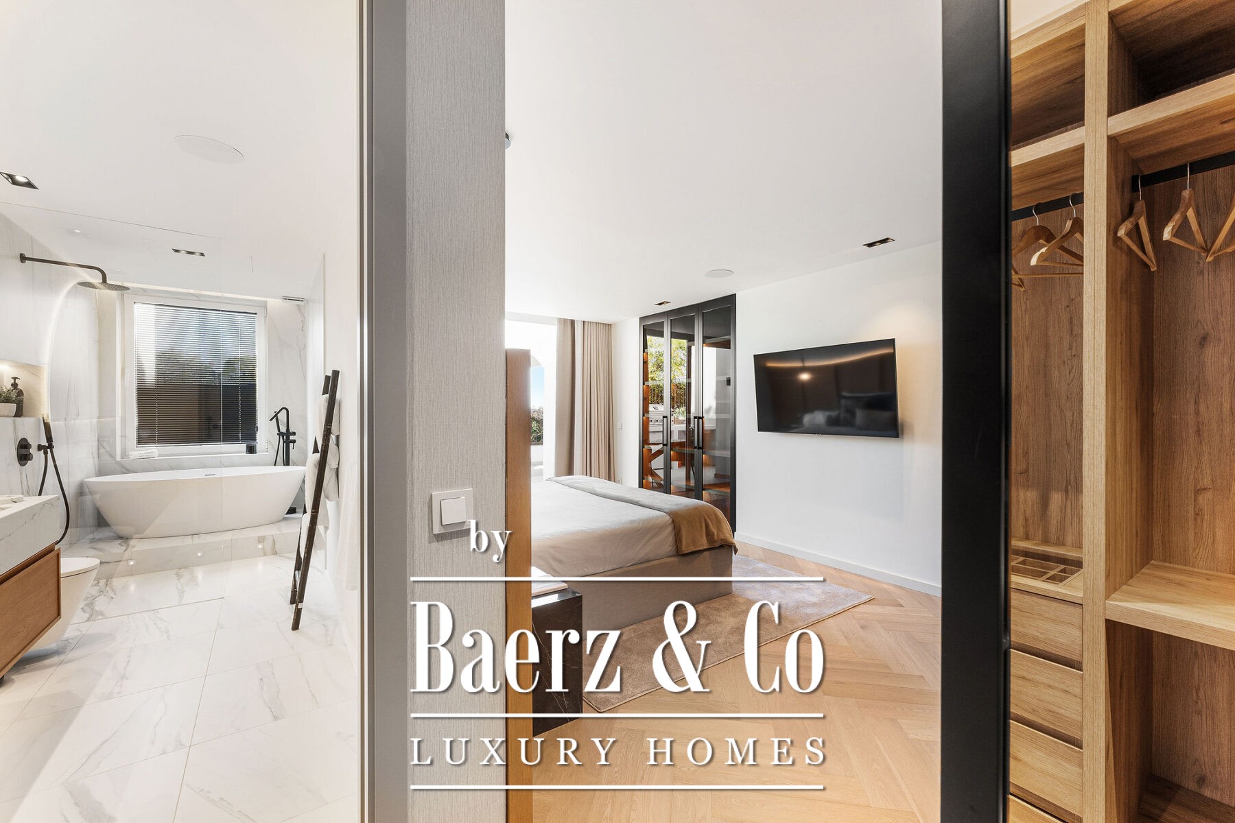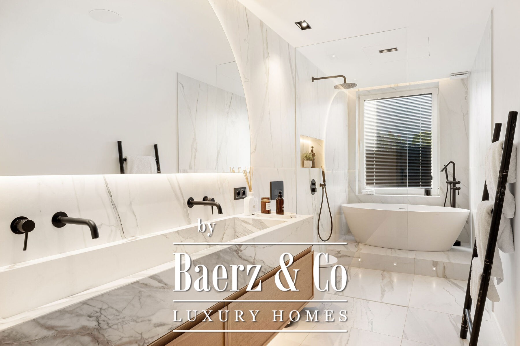 في الطابق الأرضي، تبرز الإضاءة الطبيعية في مساحة المعيشة المفتوحة، ومنطقة الطعام، ومطبخ Gaggenau المتطور، حيث تطغى التشطيبات الخشبية والرخامية الفاخرة. تمنح الأرضيات بنمط عظم السمكة ولوحة الألوان الحيادية دفئاً ورُقياً هادئاً. يفتح الصالون على فناء خاص مثالي لتناول الطعام في الهواء الطلق أو الاسترخاء في جو خاص. الجناح الرئيسي الفخم يضم خزانة ملابس واسعة وحوض استحمام مستقل يطل على التراس، بالإضافة إلى حمام داخلي. يتيح وجود غرفة نوم إضافية في هذا الطابق مرونة الإقامة للعائلة أو الضيوف.