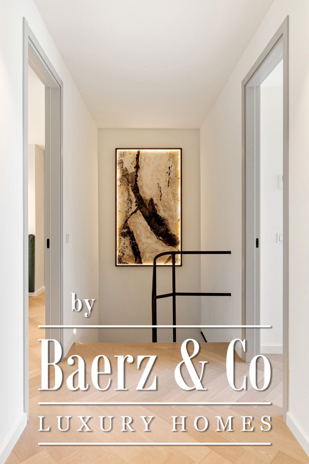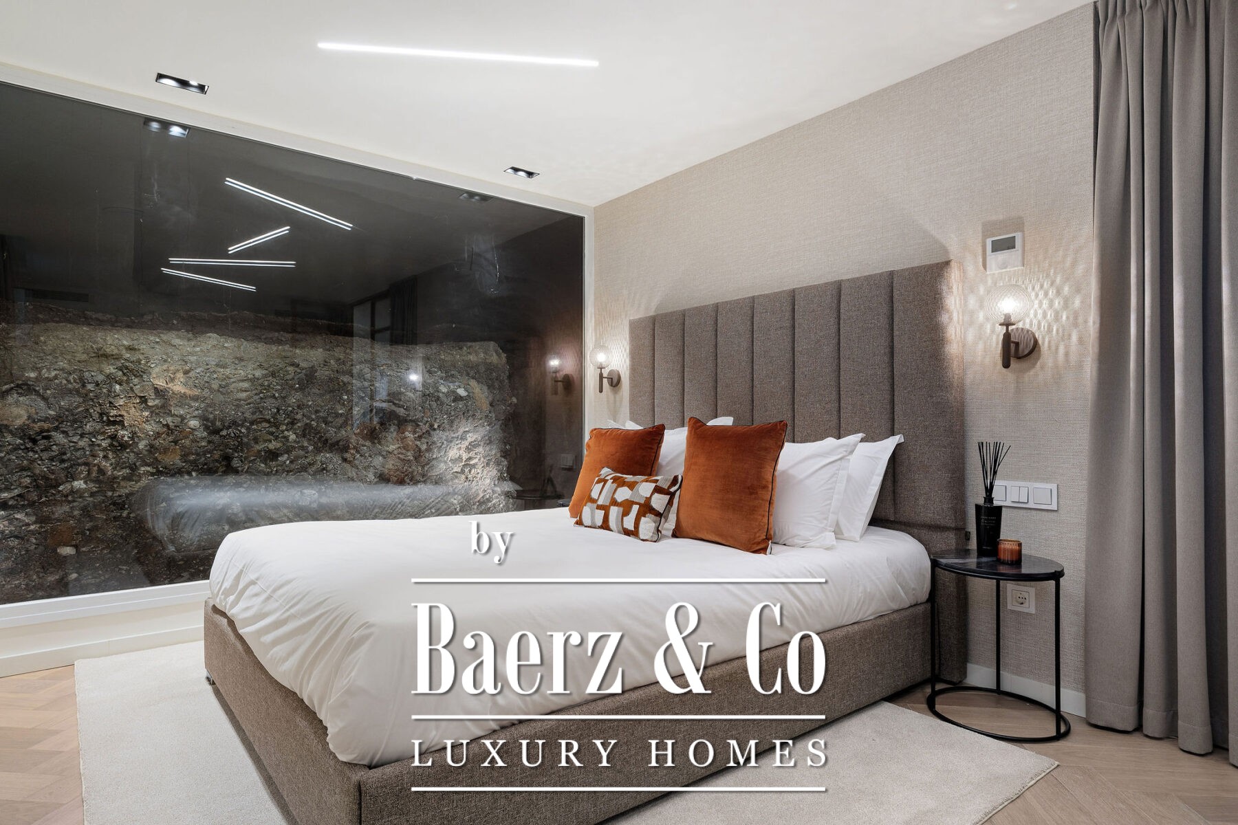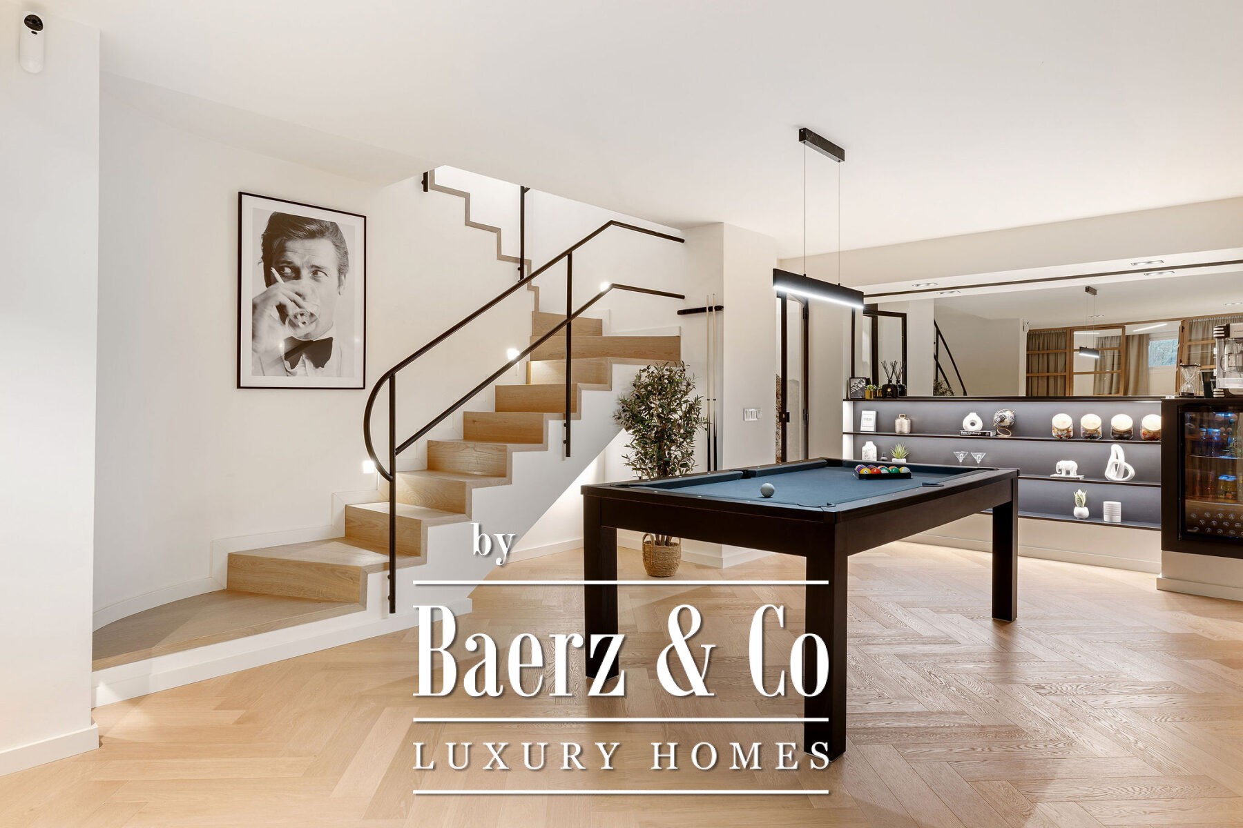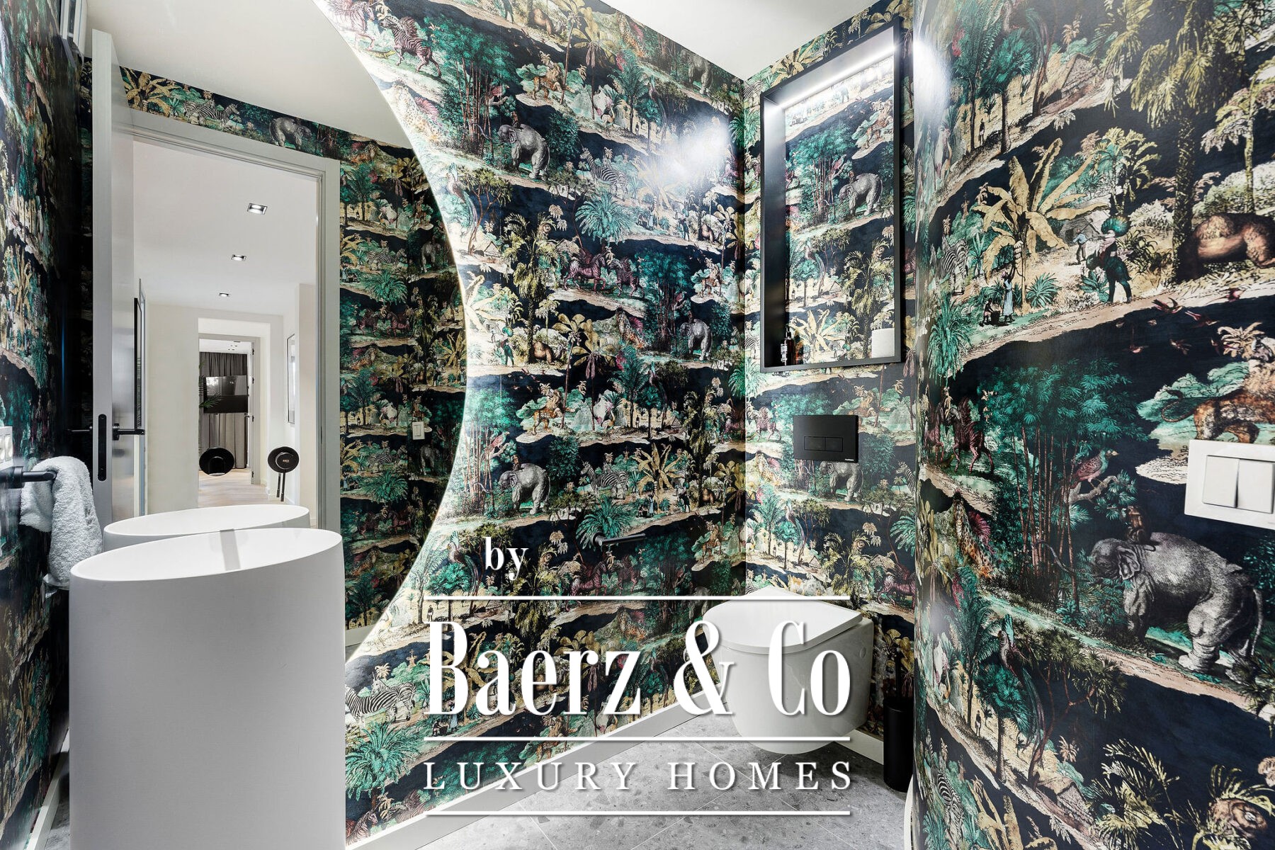 في الطابق الأرضي، تبرز الإضاءة الطبيعية في مساحة المعيشة المفتوحة، ومنطقة الطعام، ومطبخ Gaggenau المتطور، حيث تطغى التشطيبات الخشبية والرخامية الفاخرة. تمنح الأرضيات بنمط عظم السمكة ولوحة الألوان الحيادية دفئاً ورُقياً هادئاً. يفتح الصالون على فناء خاص مثالي لتناول الطعام في الهواء الطلق أو الاسترخاء في جو خاص. الجناح الرئيسي الفخم يضم خزانة ملابس واسعة وحوض استحمام مستقل يطل على التراس، بالإضافة إلى حمام داخلي. يتيح وجود غرفة نوم إضافية في هذا الطابق مرونة الإقامة للعائلة أو الضيوف.