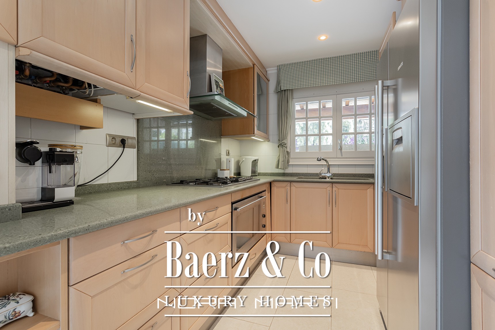 يمتد المنزل على مساحة معيشة تبلغ 346 م² موزعة على أربعة طوابق؛ تضم الطابق الرئيسي صالة معيشة وطعام تفتح بسلاسة على شرفة مغطاة بمساحة 40 م² وحديقة مزودة بمنطقة شواء ومسبح أنيق. المطبخ المستقل مجهز بالكامل، مع غرفة نوم فردية وحمام مزود بدش، توزع المساحات بطريقة عملية ومريحة.