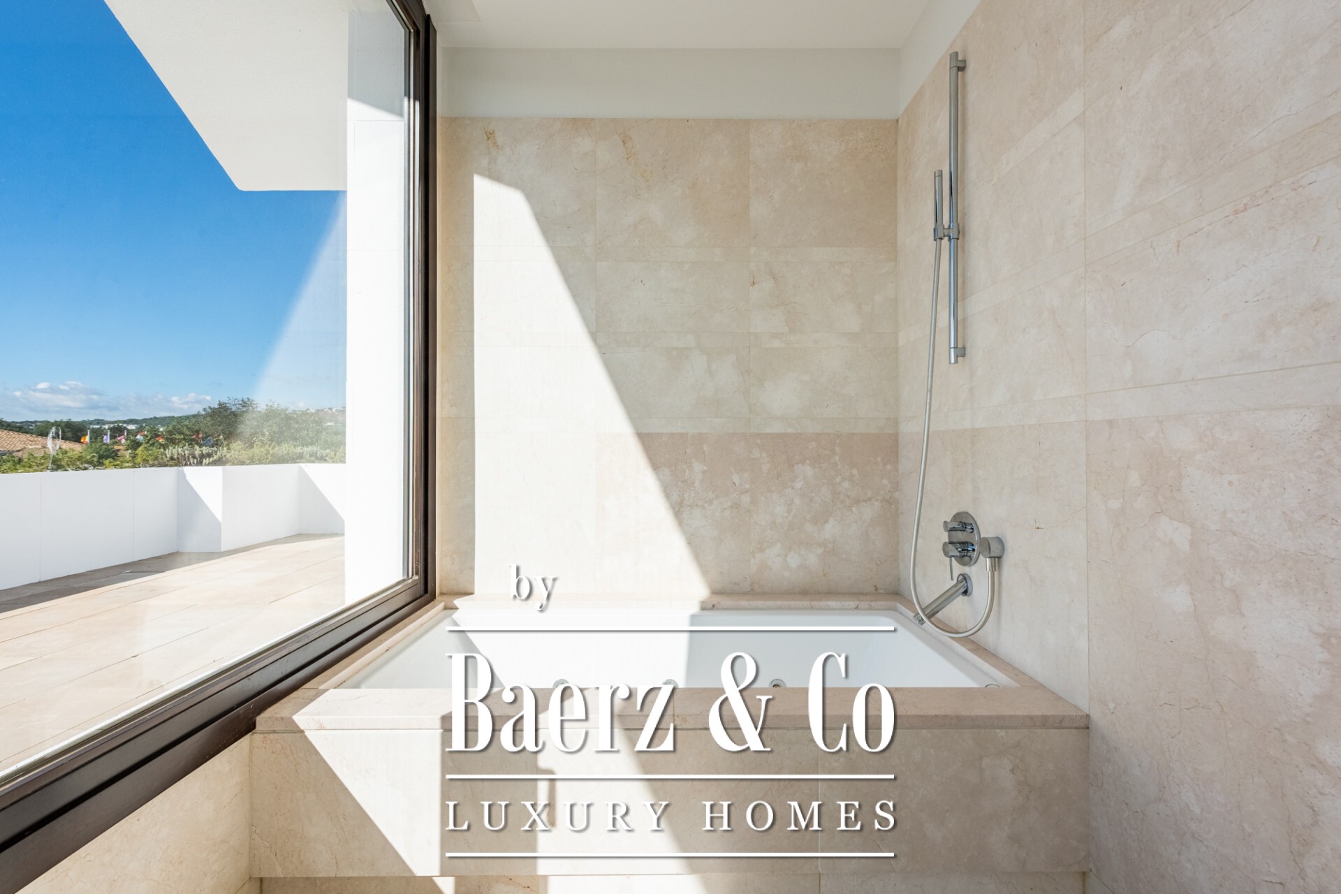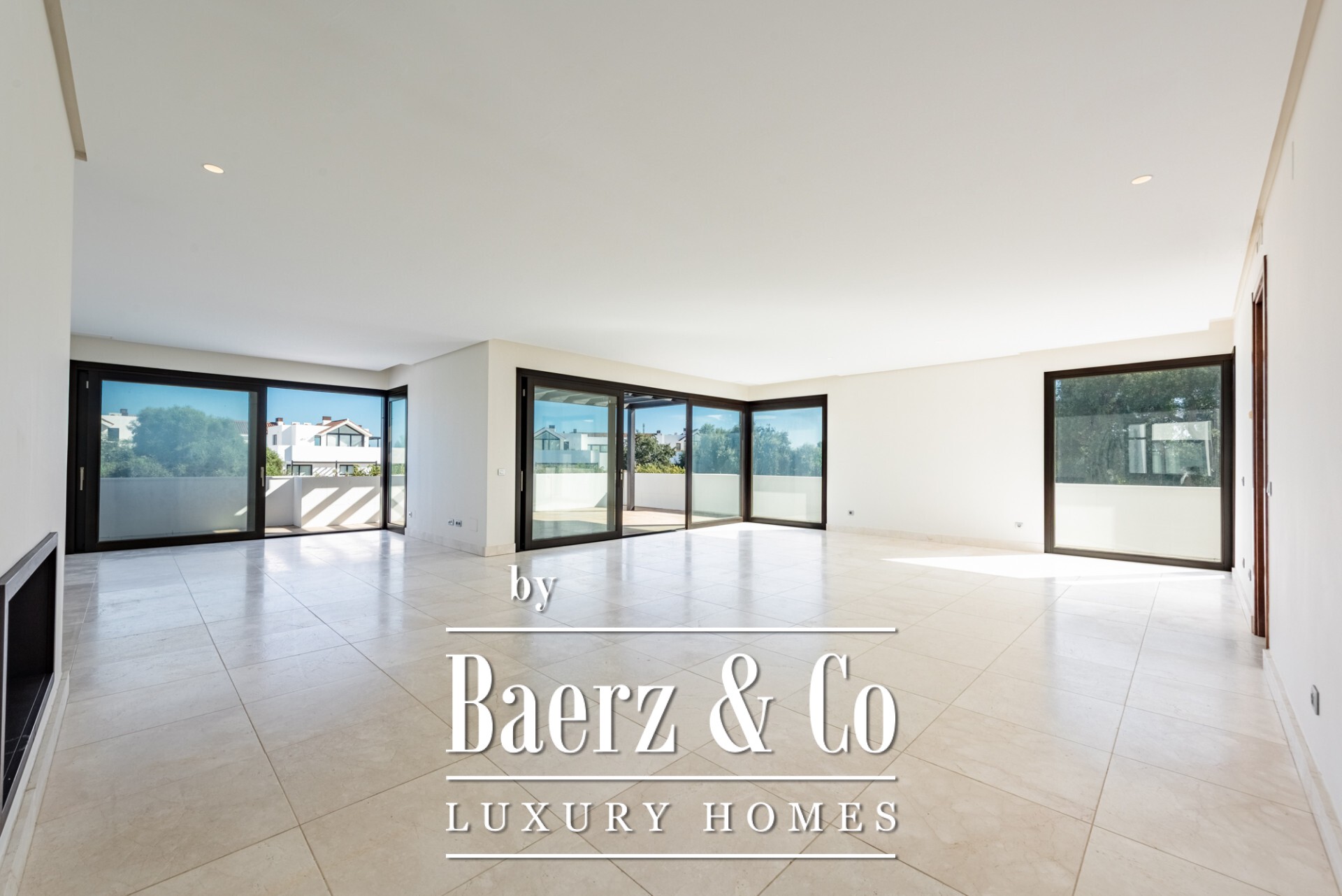 This modern and spacious and bright 4-bedroom apartment stands for luxury living within the esteemed Hacienda Valderrama urbanisation, comprising a private lift, private large garage, and basement, and offers unparalleled convenience and exclusivity. The main floor features three bedroom suites, complemented by expansive living and dining areas, connected to a well-appointed kitchen and utility room. On the upper floor is the master suite which is framed by a terrace. Surrounding these spaces are generous open and covered terraces, perfect for both relaxation and entertaining. The urbanisation of only 34 apartments provides 24hrs security, a large communal swimming pool and beautifully landscaped gardens.