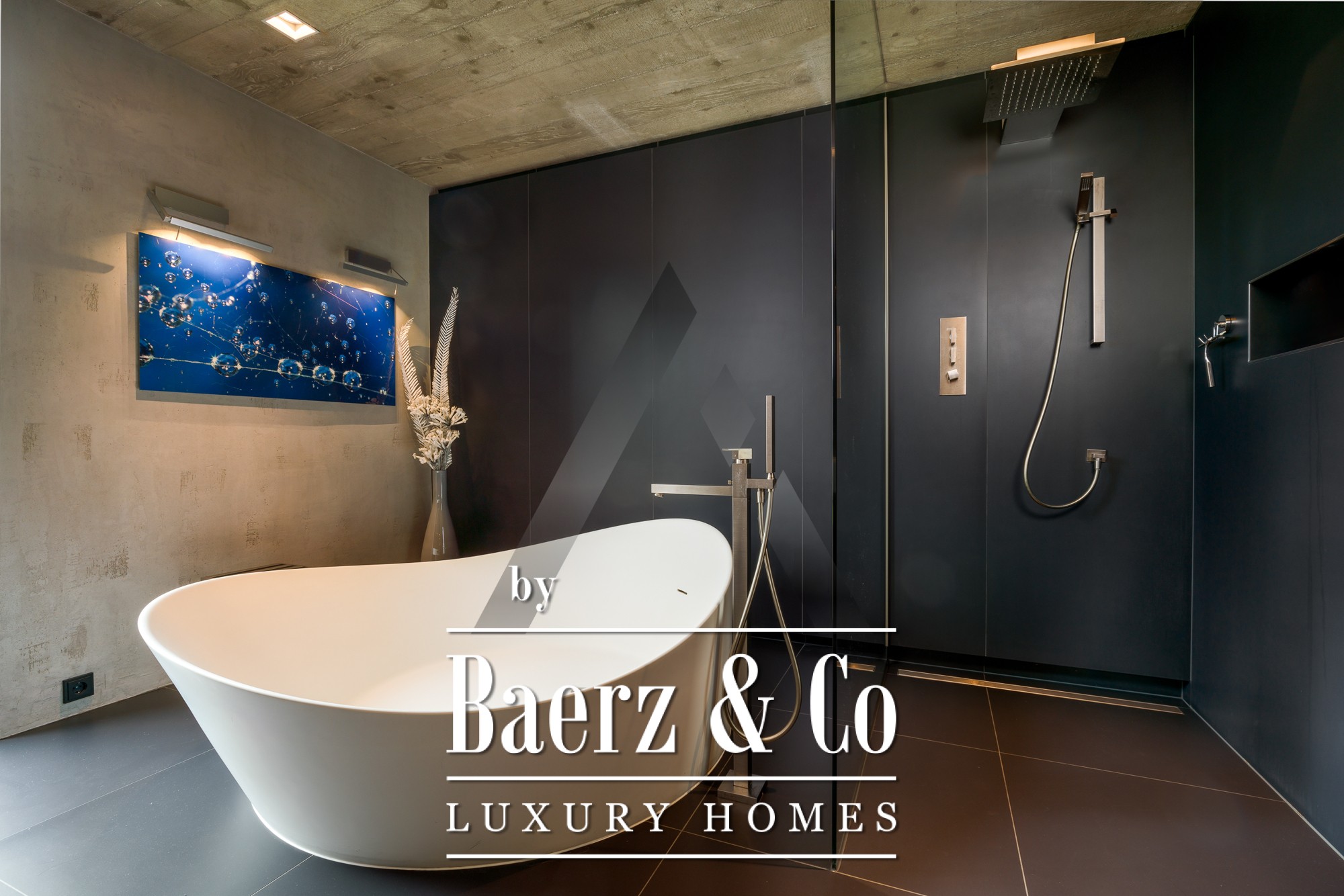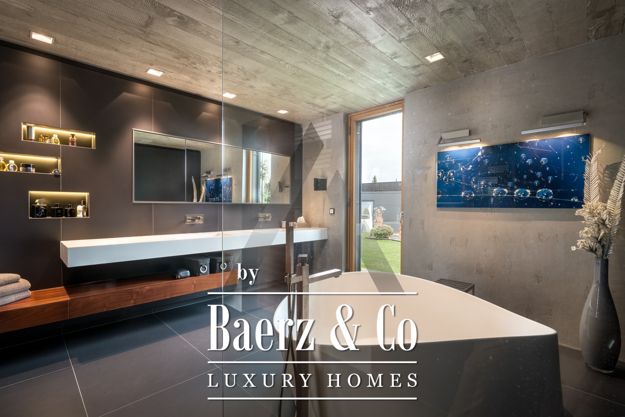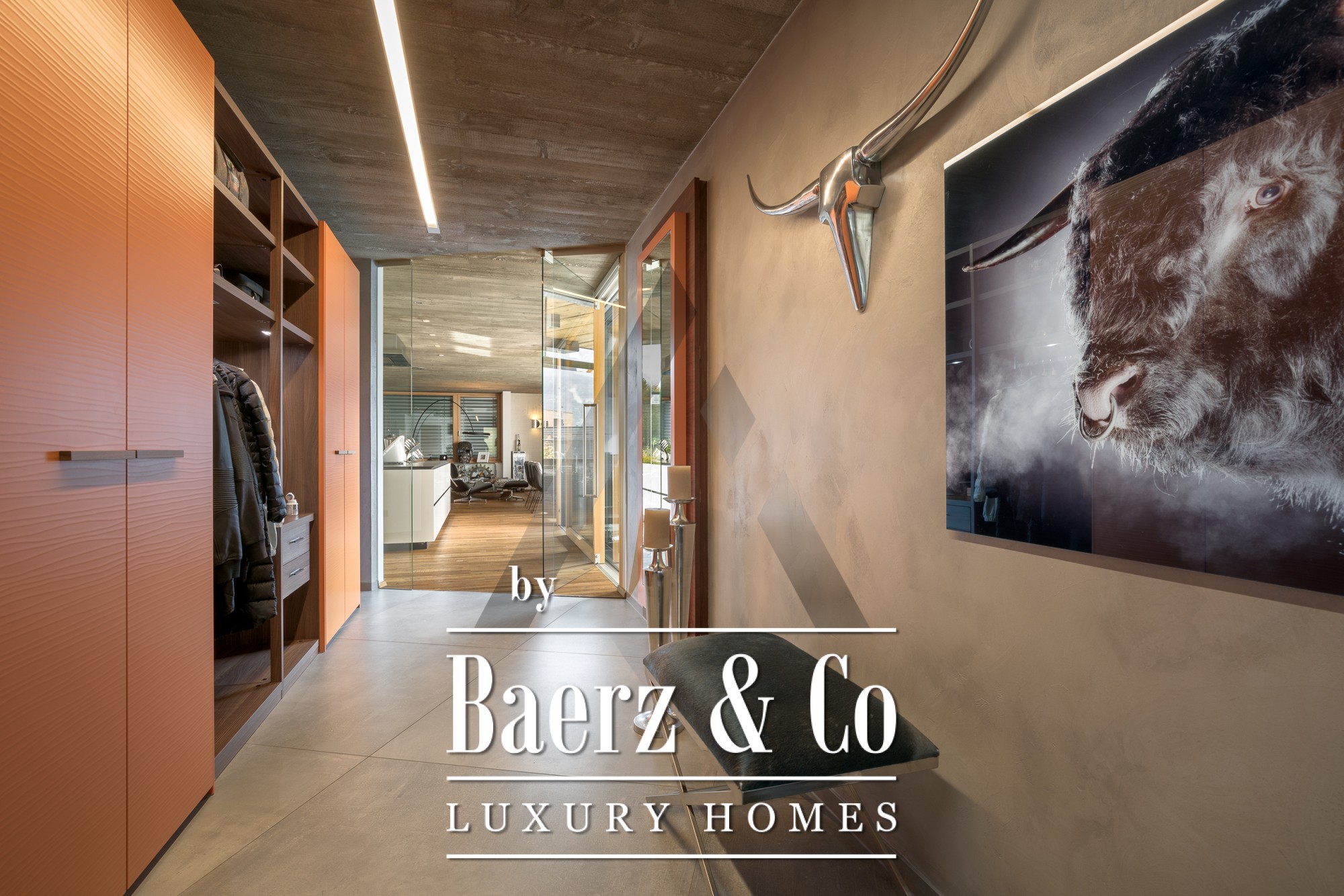 في الداخل، تساهم الأسقف الخرسانية المكشوفة وأرضيات البلوط المعاد تدويرها في خلق أجواء رفيعة الذوق. الطابق الأرضي ذو المساحة المفتوحة يشكل قلب المنزل، حيث تضيء النوافذ البانورامية مساحات المعيشة والطعام ومطبخ Miele المصمم بضوء طبيعي جميل. الطابق الأرضي يضم جناح رئيسي مع غرفة ملابس، غرفة أطفال، حمامات واسعة، ومساحات تخزين عملية. في الطابق العلوي، توجد شقة منفصلة تضم غرفتي نوم، منطقة معيشة مع مدفأة، وتراس على السطح يطل على أفق الجبال. يكمل الطابق العلوي جناح لياقة بدنية بمساحة 18 م²، مكيف بالكامل، ويفتح على تراسه الخاص.