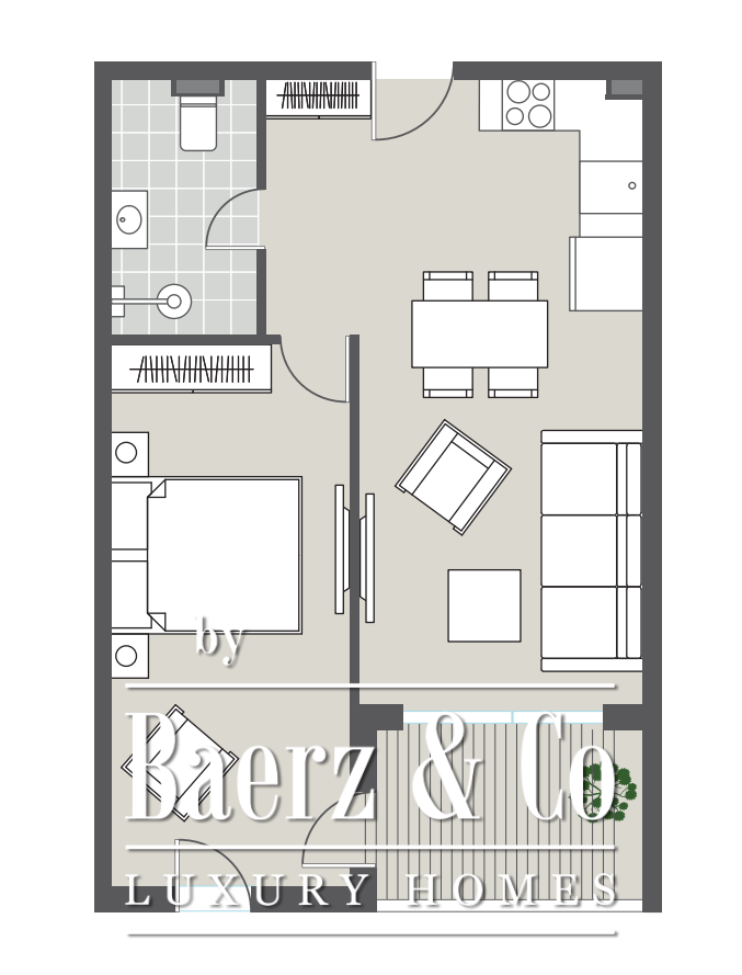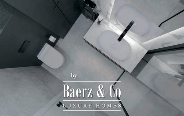 تقع الشقة في الطابق الأول، وتضم غرفة معيشة مشرقة مع مطبخ ومنطقة لتناول الطعام، وغرفة نوم واحدة، وحماماً، وتراساً. وقد تم تنفيذها بتصميم "تسليم المفتاح" مع لمسات داخلية مفصلة بعناية من ANSER & Partners، وأثاث من Old Hara، وتكامل الأجهزة المنزلية الذكية وأنظمة المنزل الذكي. كل التفاصيل، بدءاً من تركيبات Villeroy & Boch وحتى نظام التحكم في المناخ WindFree من سامسونج، صُممت لراحة هادئة وسهولة تكنولوجية عملية.