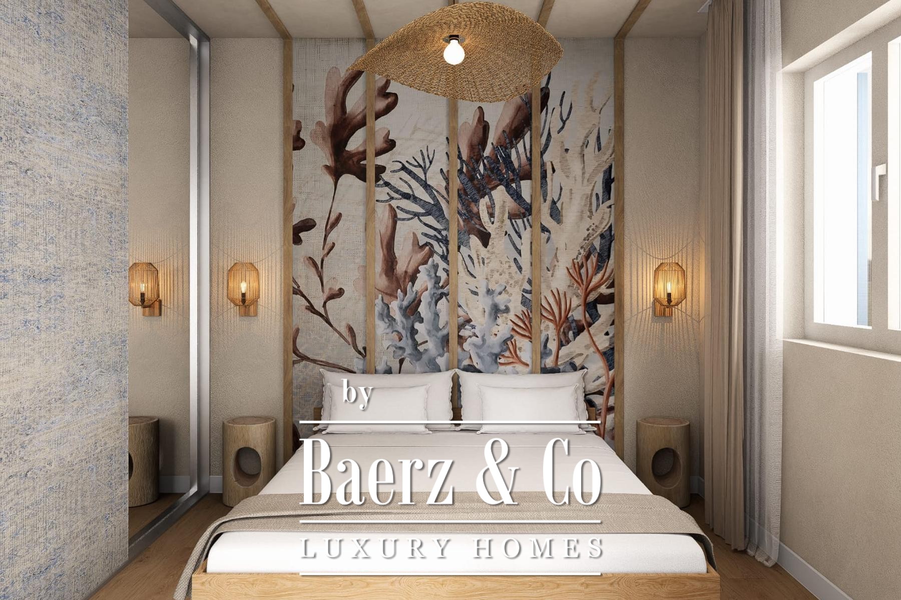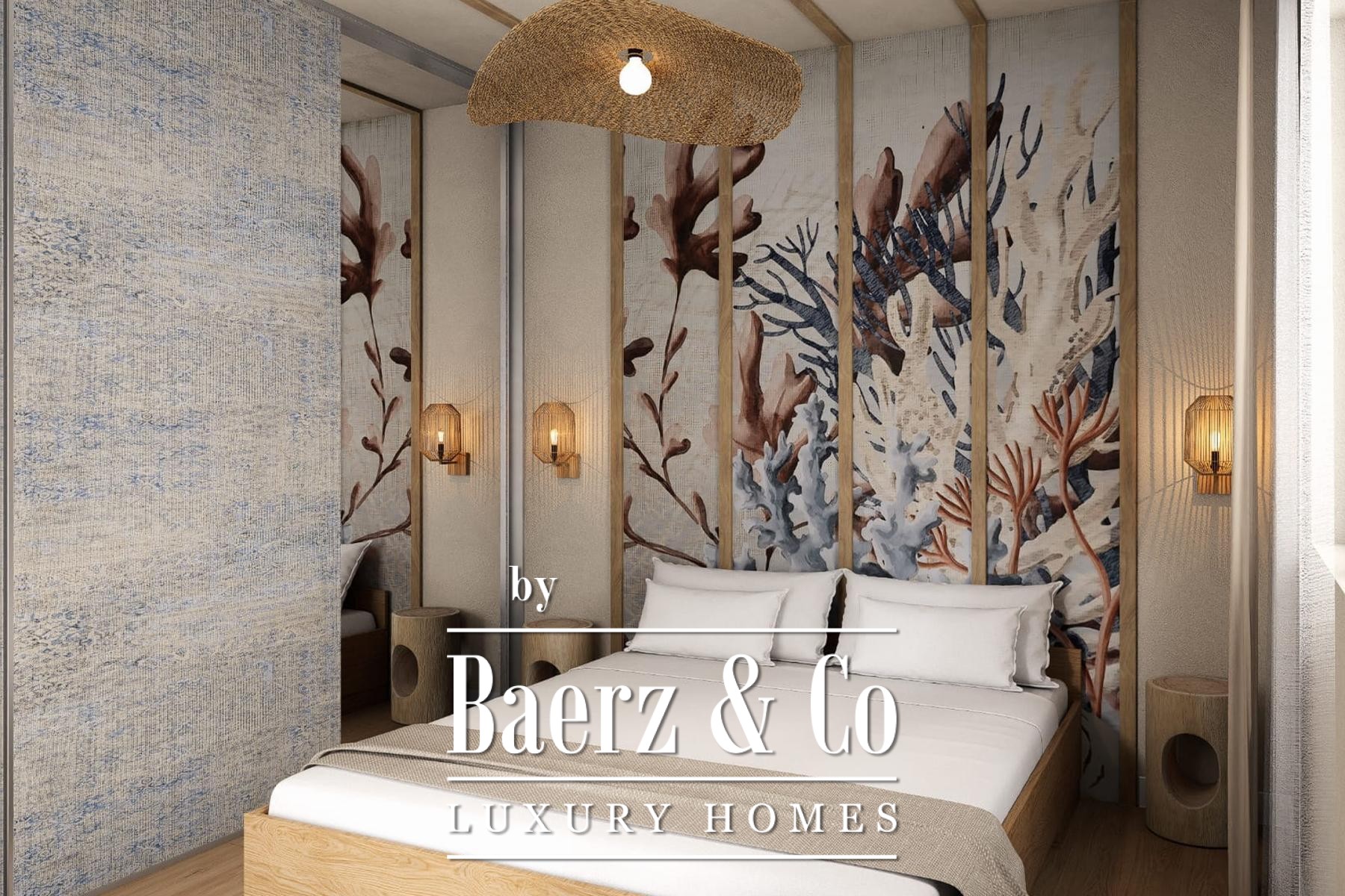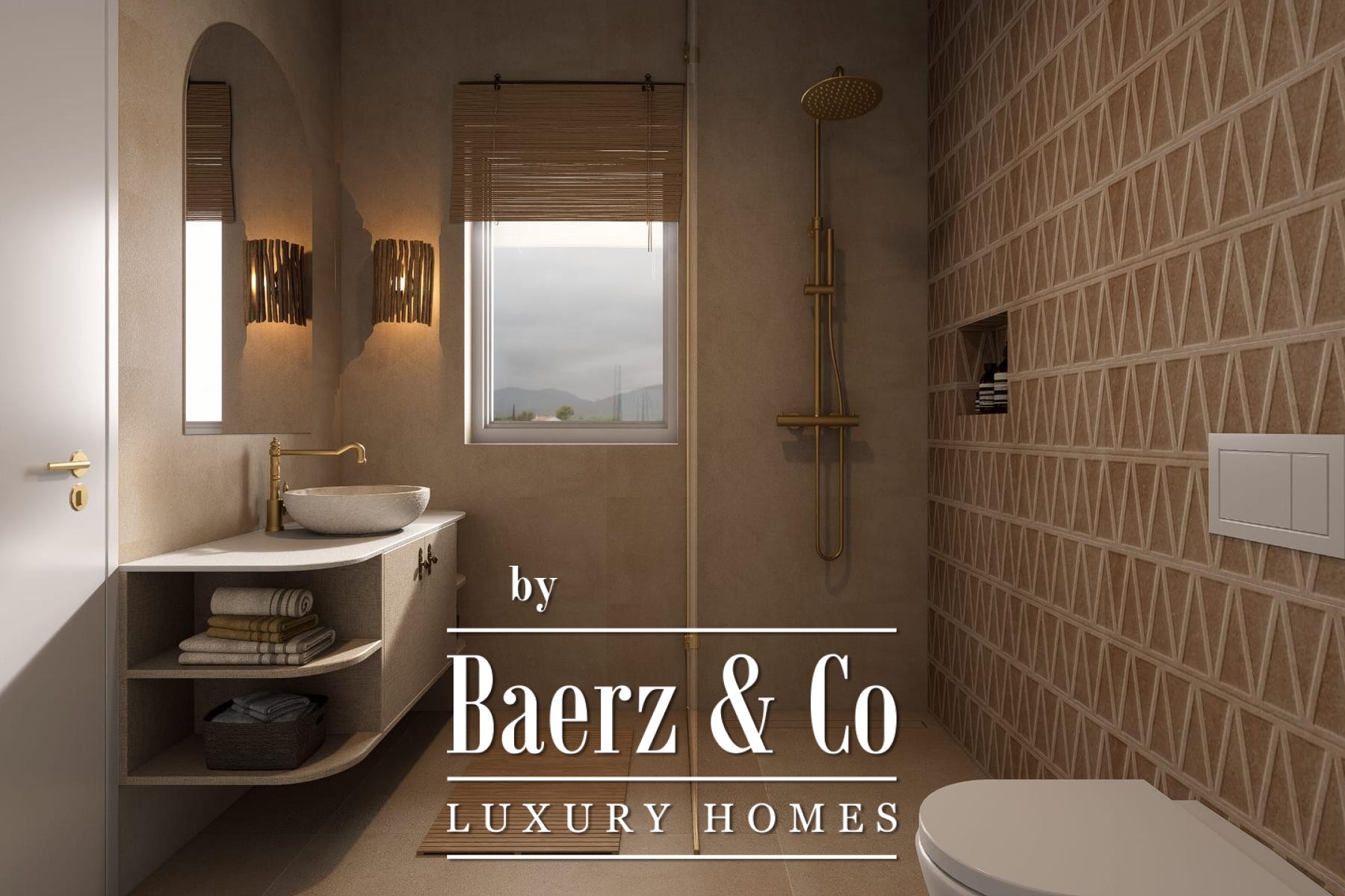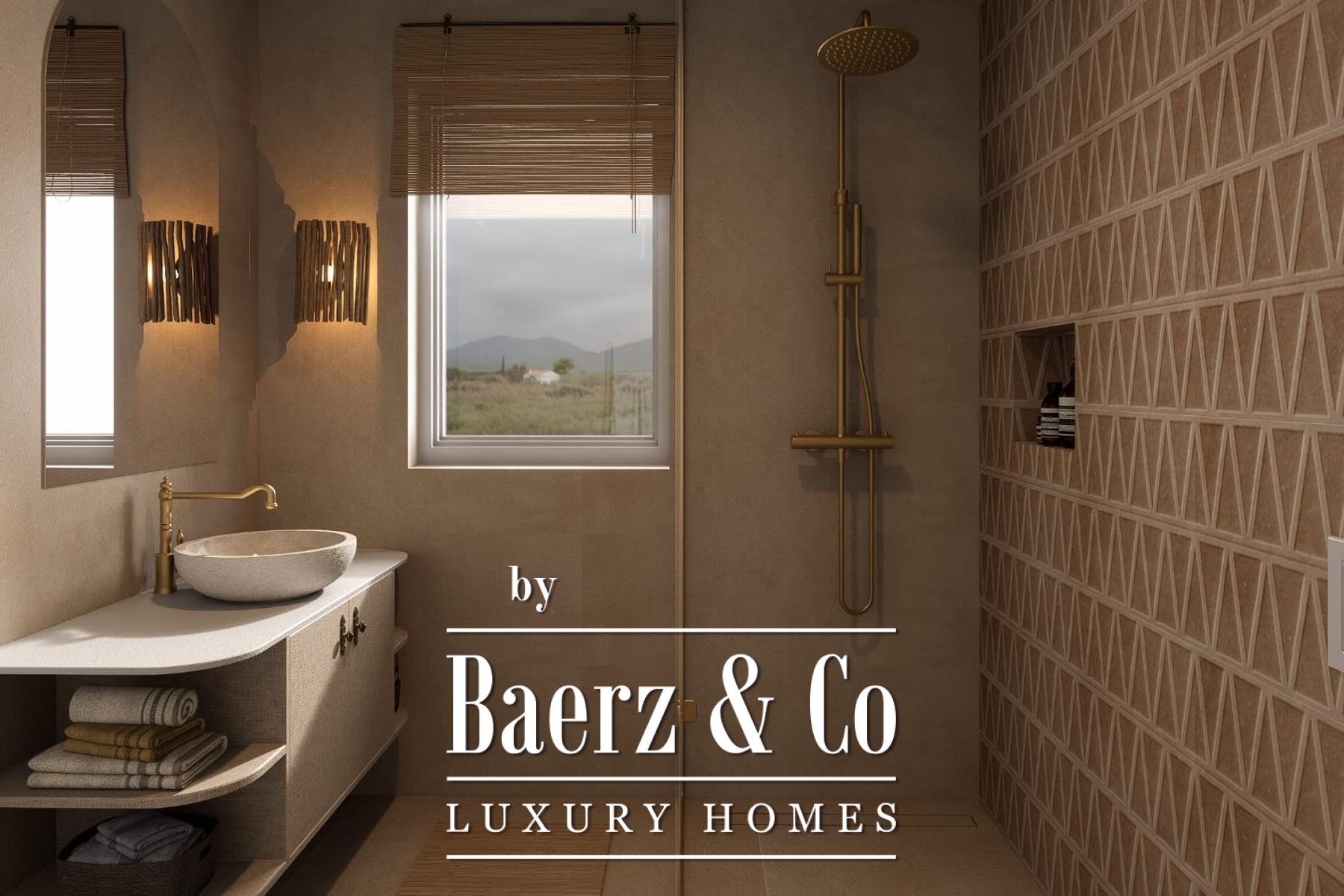 في الطابق العلوي، تفتح ثلاث غرف نوم وحمامين على تراس مغطى، مما يتيح تدفق الهواء والضوء. الخيارات المدروسة للمواد مثل الحجر والخشب والتشطيبات الراقية تُضفي على الفيلا فخامة رصينة مع أجواء دافئة.
