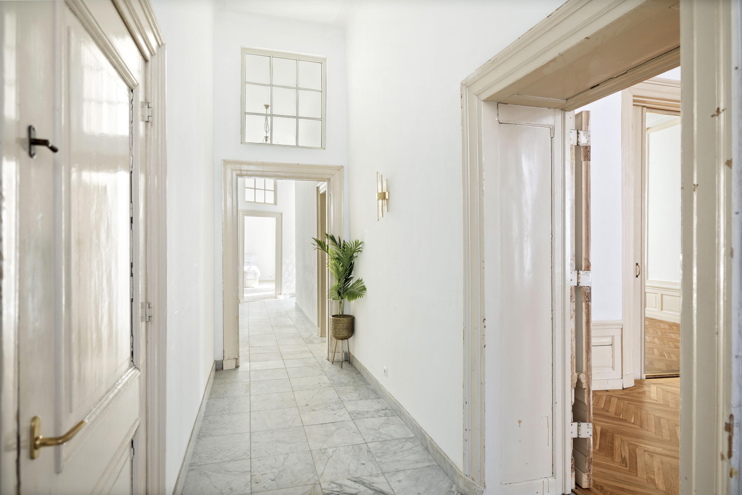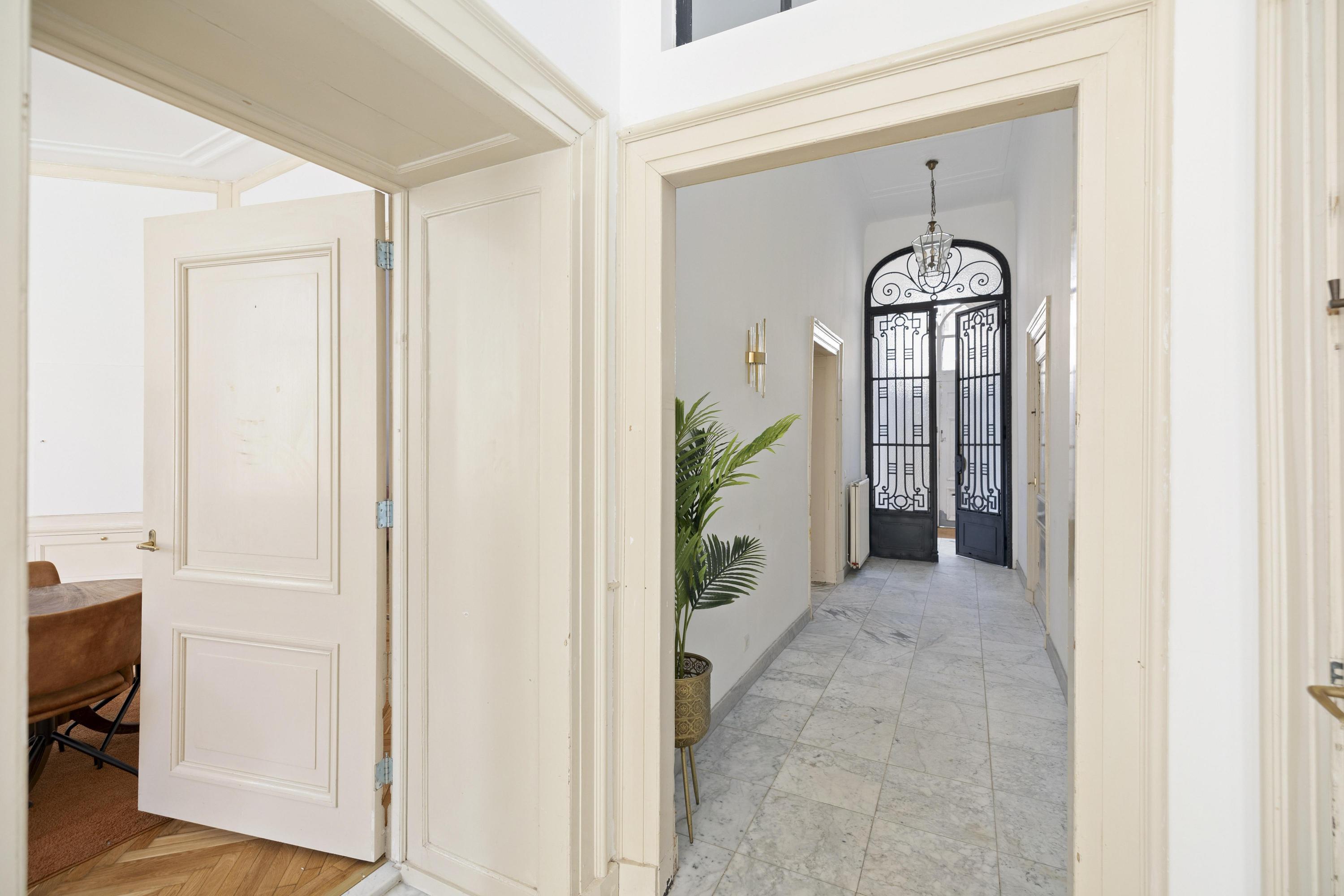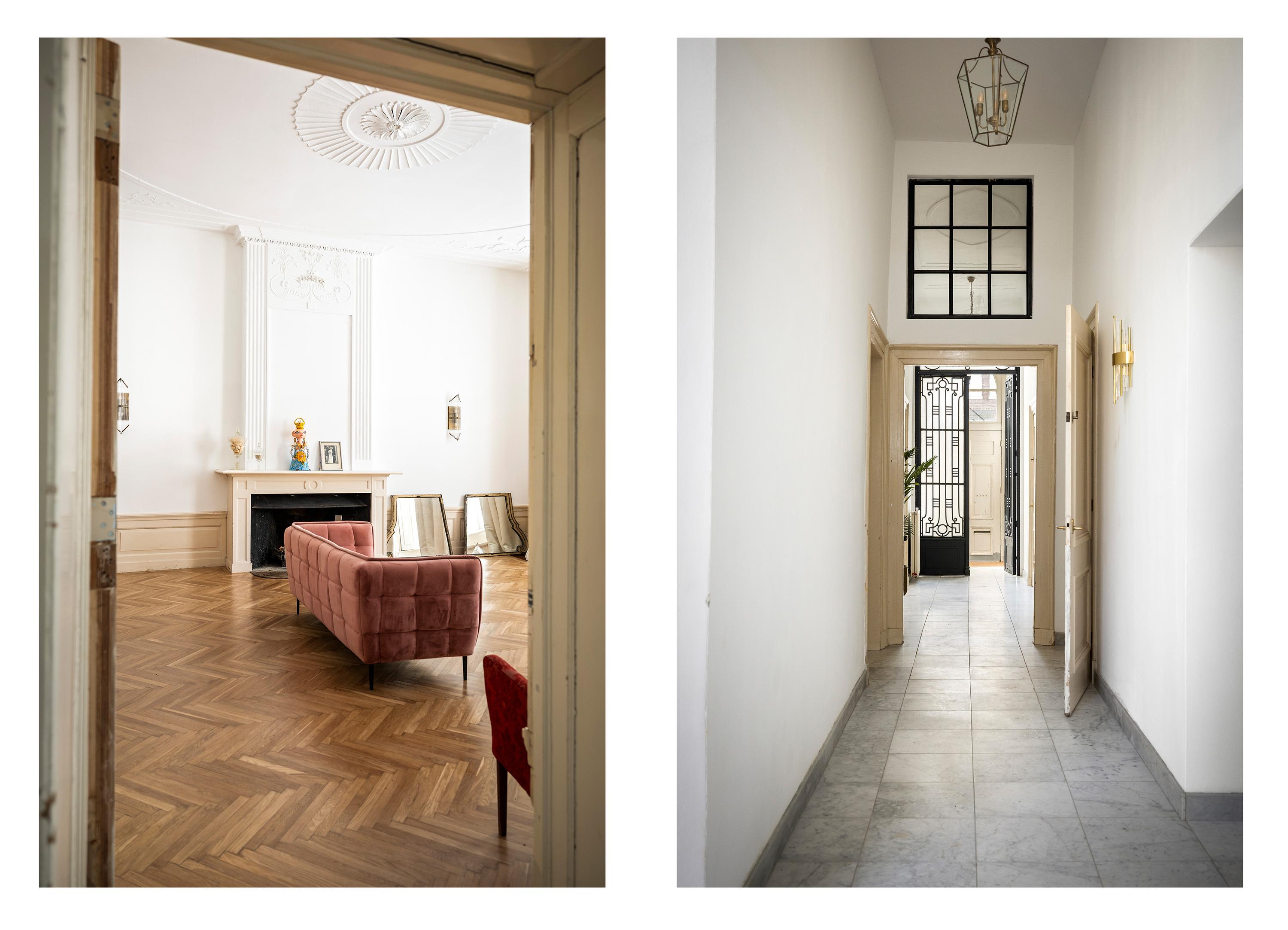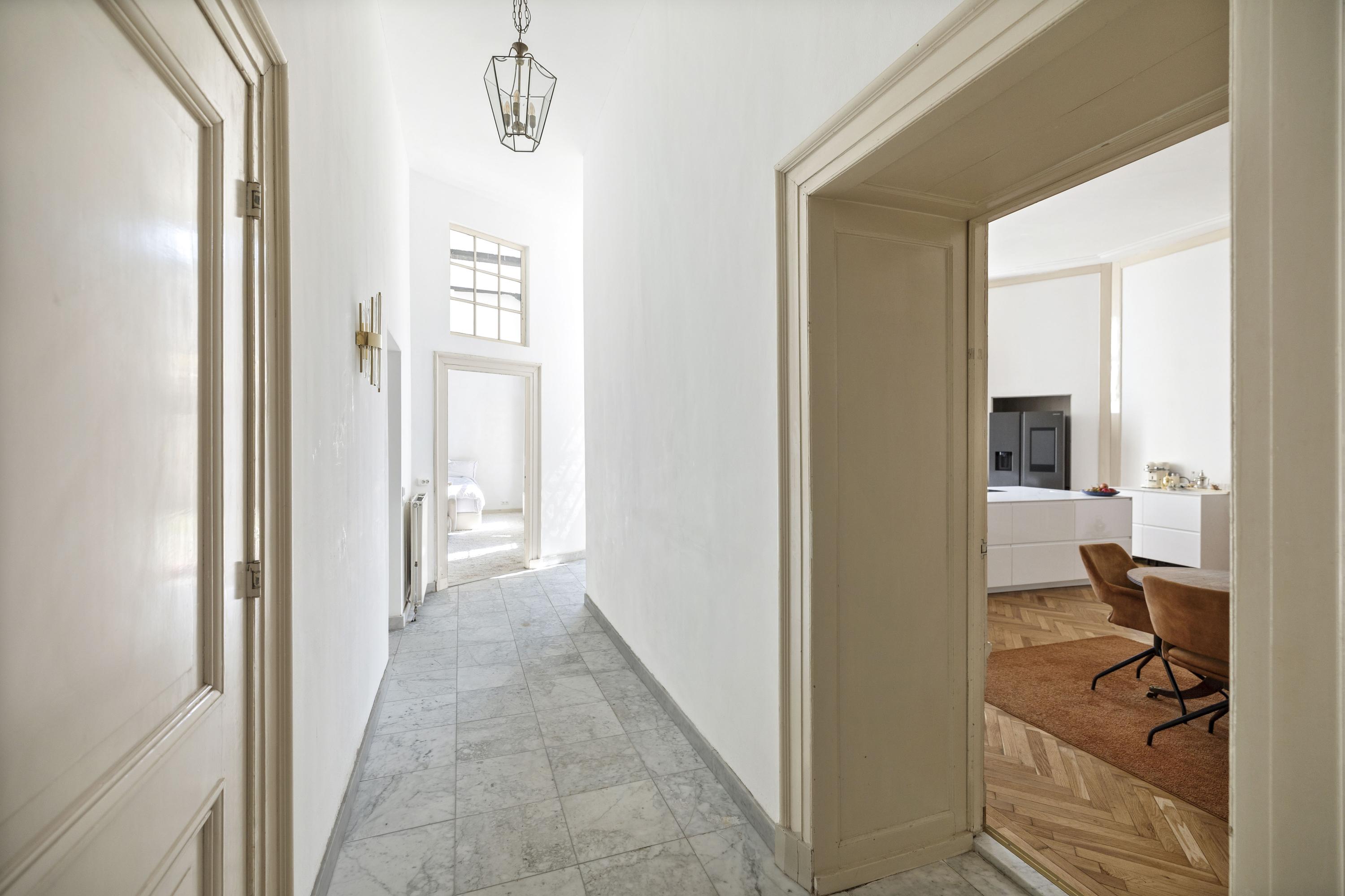 بعد المرور عبر المدخلين الكلاسيكيين، يستقبلك دهليز بأرضية من الرخام وإضاءة طبيعية وافرة. وتتوسط الطابق الرئيسي غرفة معيشة ومطبخ بمساحة تقارب 100 م². غرفة المعيشة التي تبلغ مساحتها 43 م² تتميز بمقاعد النوافذ الأصلية ومدفأة تاريخية، بينما تضفي أرضية الباركيه شيفرون من خشب البلوط دفئاً وإيقاعاً أنيقاً. المطبخ مجهز بخزائن بيضاء بلا مقابض وأجهزة عالية المواصفات تشمل موقد حثي مع شفاط متكامل وثلاجة وفريزر كبيرين.