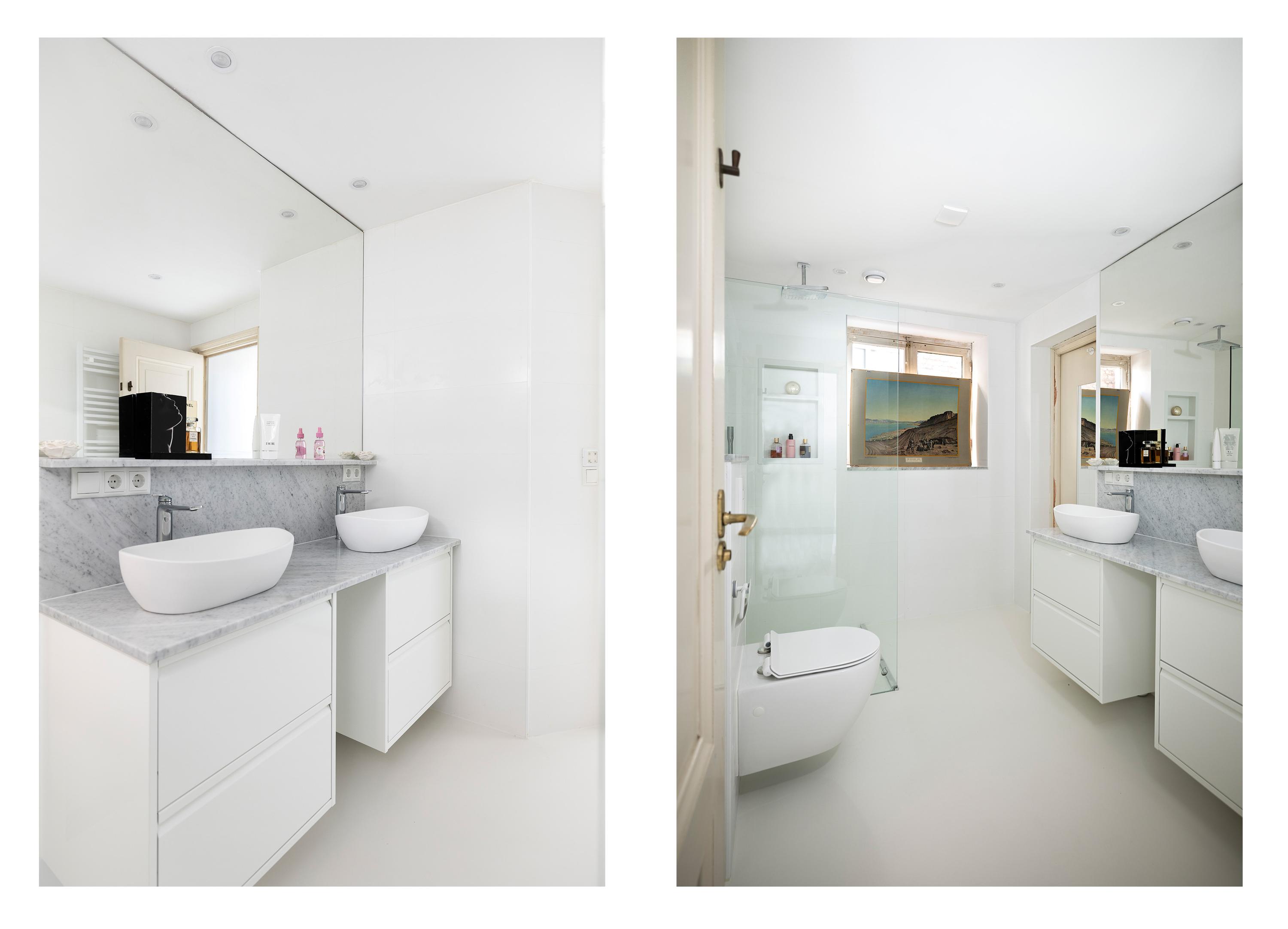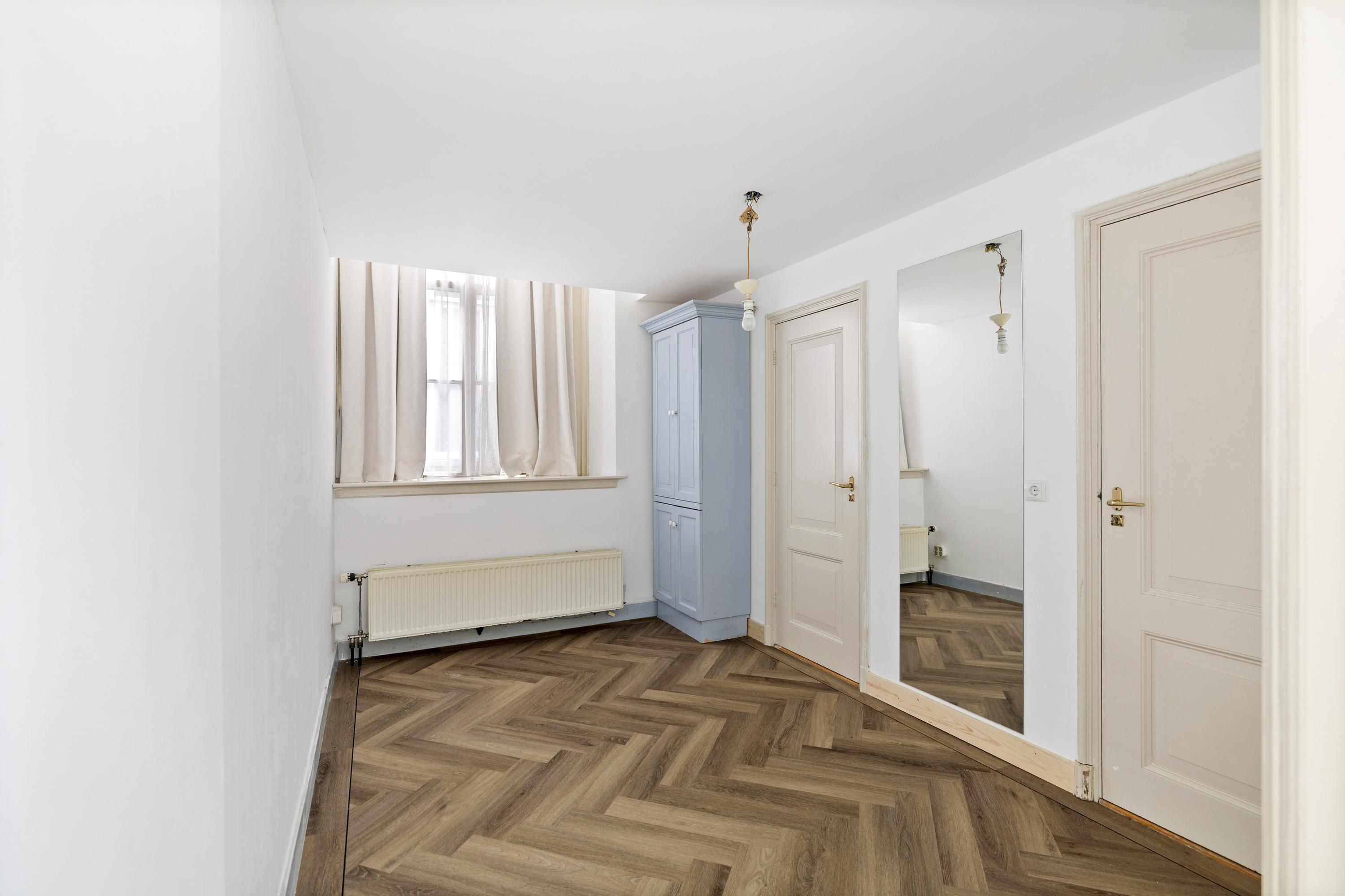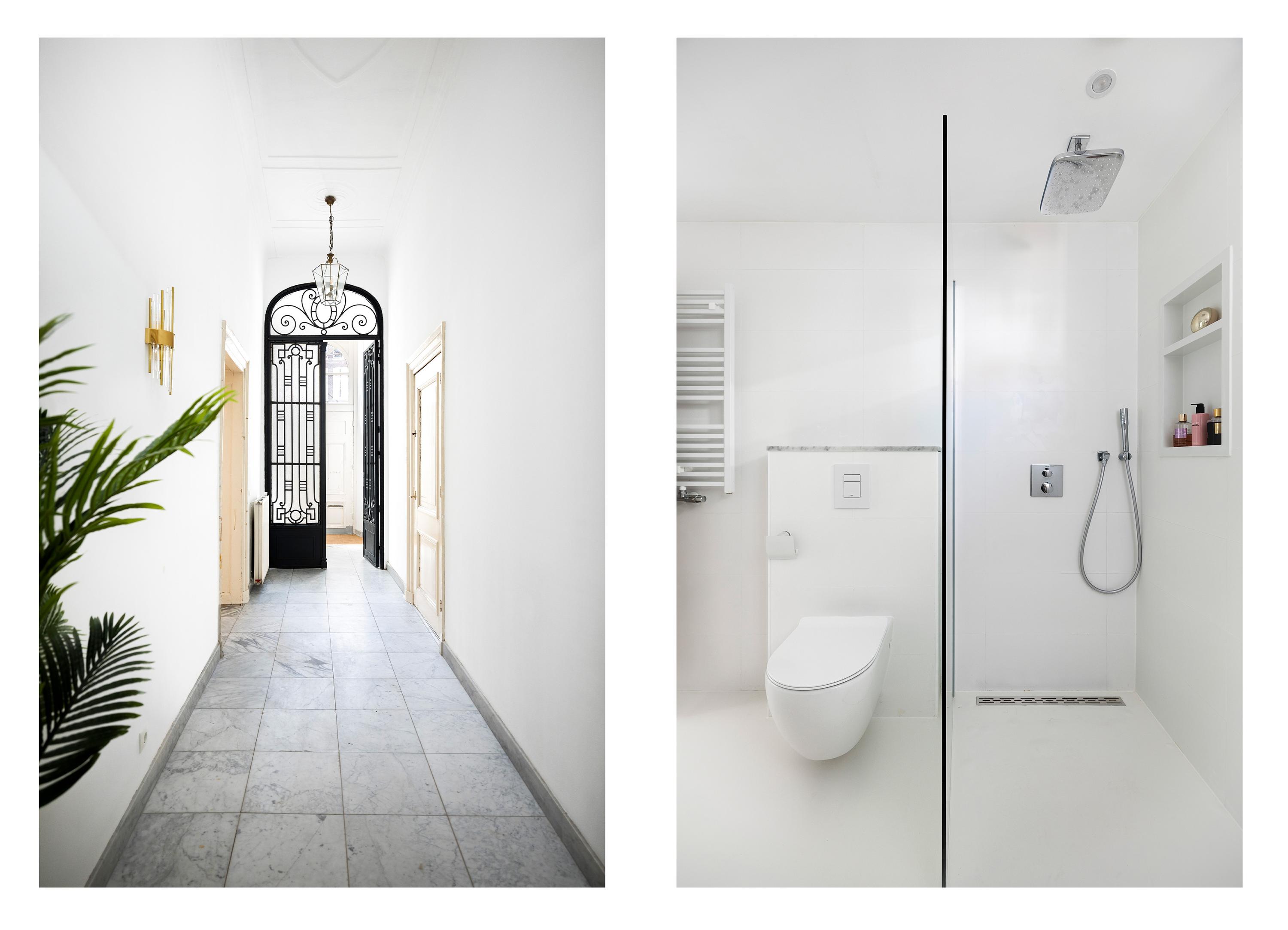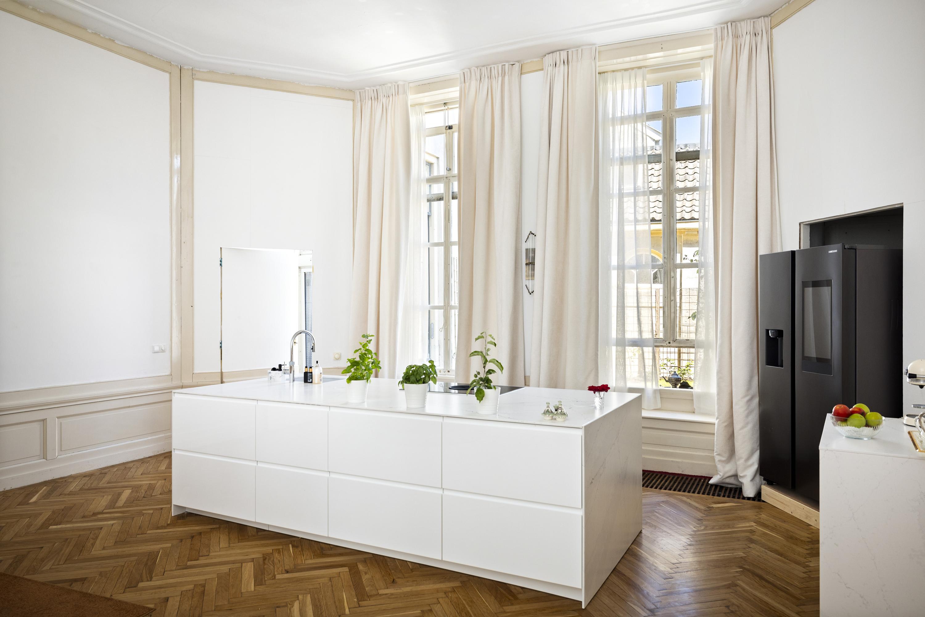 بعد المرور عبر المدخلين الكلاسيكيين، يستقبلك دهليز بأرضية من الرخام وإضاءة طبيعية وافرة. وتتوسط الطابق الرئيسي غرفة معيشة ومطبخ بمساحة تقارب 100 م². غرفة المعيشة التي تبلغ مساحتها 43 م² تتميز بمقاعد النوافذ الأصلية ومدفأة تاريخية، بينما تضفي أرضية الباركيه شيفرون من خشب البلوط دفئاً وإيقاعاً أنيقاً. المطبخ مجهز بخزائن بيضاء بلا مقابض وأجهزة عالية المواصفات تشمل موقد حثي مع شفاط متكامل وثلاجة وفريزر كبيرين.