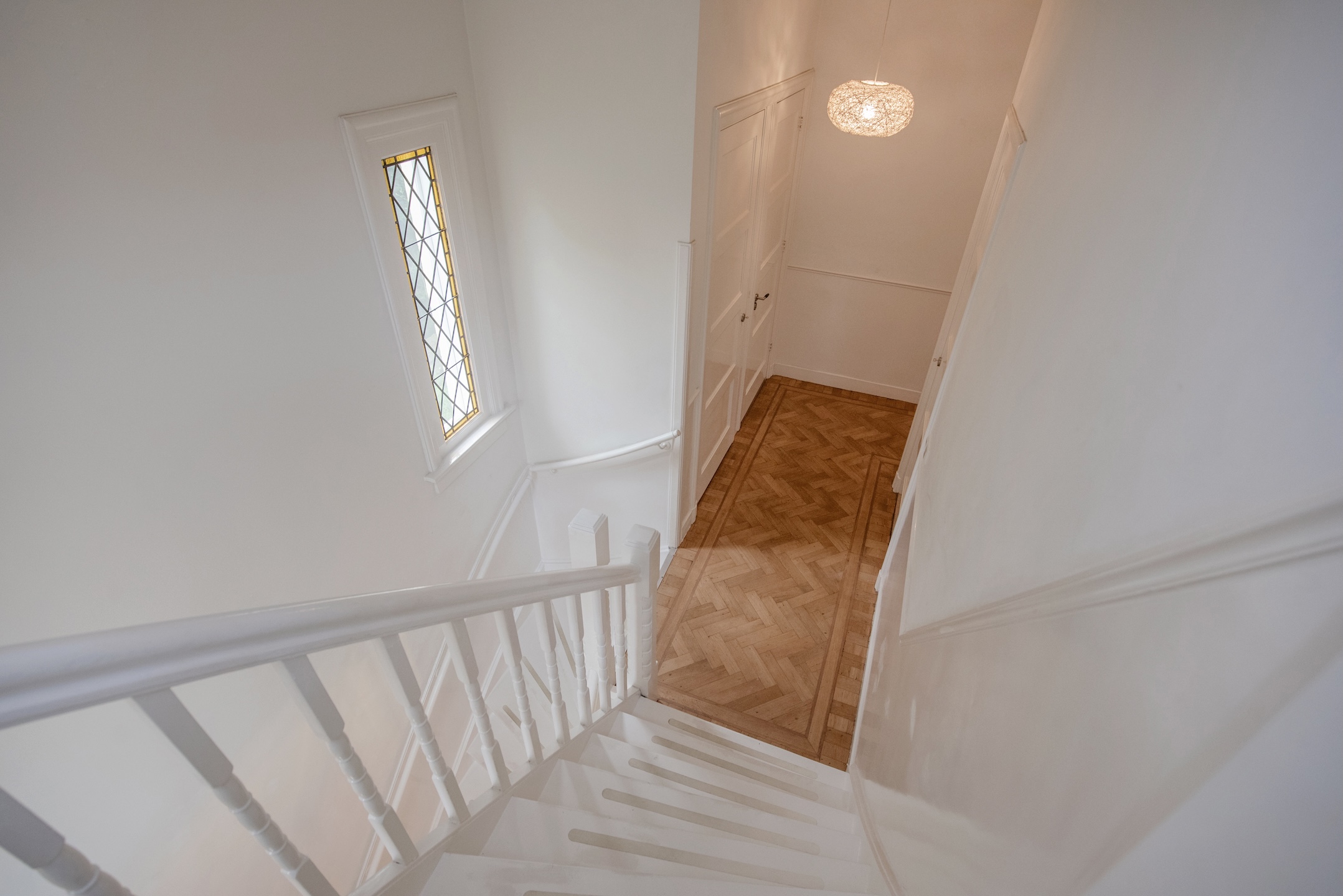 Vanuit de ontvangsthal is er een deur naar een keurig modern toilet en een deur naar de kelder van de woning. Daarnaast bevindt zich een bijzonder fraai trappenhuis met glas-in-lood ramen naar de andere verdiepingen met in totaal vijf slaapkamers. De eerste verdieping kent een royale overloop met visgraat parketvloer, diepe vaste kast, een brede kast met aansluiting voor wasmachine en droger, een keurig toilet en een grote slaapkamer met een mozaïek houten vloer, vaste kastenwand en brede raampartij. Daarnaast ligt een tweede grote slaapkamer met mozaïek houten vloer, een diepe kledingkast en een openslaande deur naar het voorbalkon met fraai en weids uitzicht. Er is nog een derde slaapkamer met houten mozaïek vloer en een deur naar het voorbalkon. De verdieping heeft een moderne badkamer met een licht grijze plavuizen vloer, vloerverwarming, een ruime inloopdouche, diverse opzetwastafels en een brede spiegel.