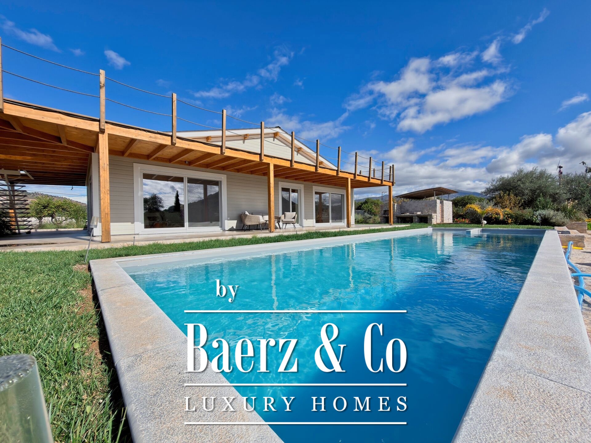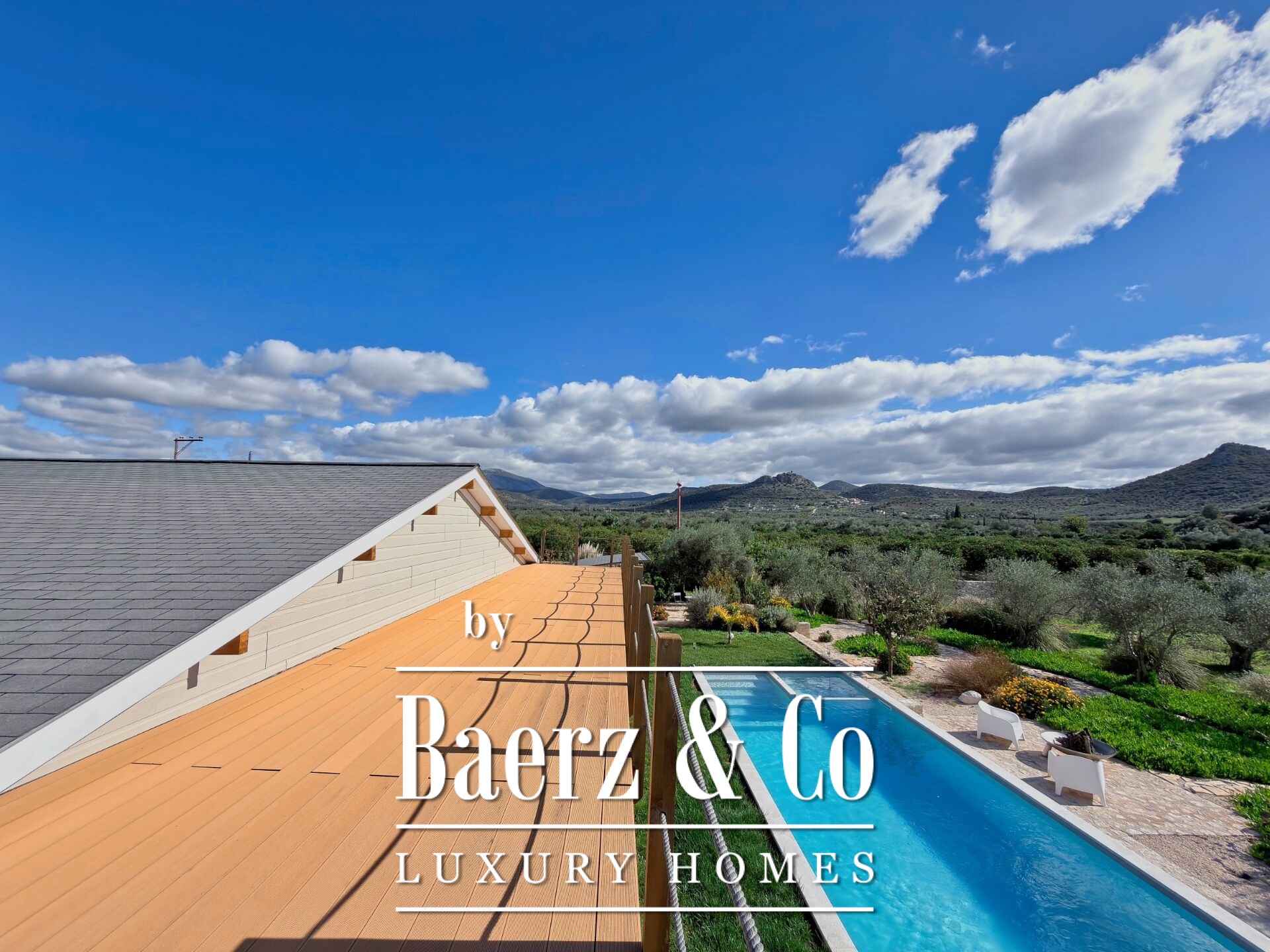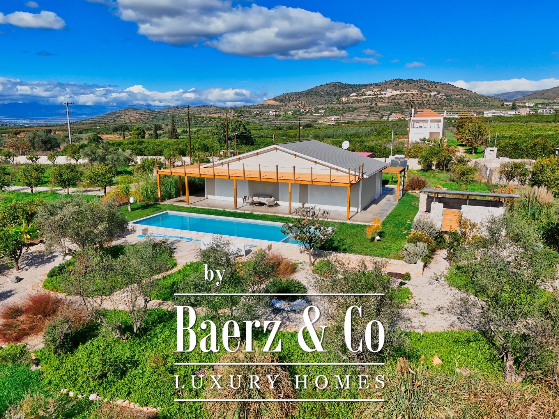 Das freistehende Haus Agios Adrianos empfängt Sie nur wenige Kilometer von Nafplio entfernt, ruhig eingebettet in einen 6.900 m² großen Garten. Diese 125 m² große Immobilie, im Jahr 2023 von einem renommierten Fertigbauunternehmen errichtet, bietet zeitgemäßen Komfort nur 10 Kilometer von der Küste entfernt. Die Räume gehen harmonisch vom offenen Wohn- und Essbereich in eine praktisch gestaltete Küche, drei helle Schlafzimmer und zwei elegante Badezimmer über. Eine Außentreppe führt zu einem Balkon mit Panoramablick auf Berge und Natur, während die Terrassen nahtlos an einen 4 mal 13 Meter großen Pool anschließen, der von einer ungestörten Aussicht umgeben ist.