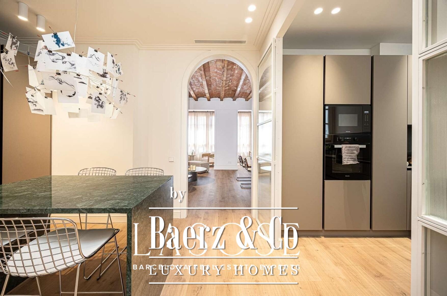 Die auf der dritten Etage gelegene Wohnung, bequem mit dem Aufzug erreichbar, wird in ihren großzügigen Wohnräumen von natürlichem Licht durchflutet. Die südwestlich ausgerichtete Galerie und originale katalanische Gewölbedecken schaffen ein Ambiente von Privatsphäre und Raffinesse. Jedes Detail der kürzlich erfolgten hochwertigen Renovierung respektiert die historische Architektur und verbindet sie harmonisch mit modernen Komfortmerkmalen. Parador-AC-5-Parkett in Eichenoptik, maßgefertigte Einbauten von ARMONY, MIELE-Geräte, intelligente Klimasteuerung und eine Master-Suite mit begehbarer Garderobe werten den Alltag auf.