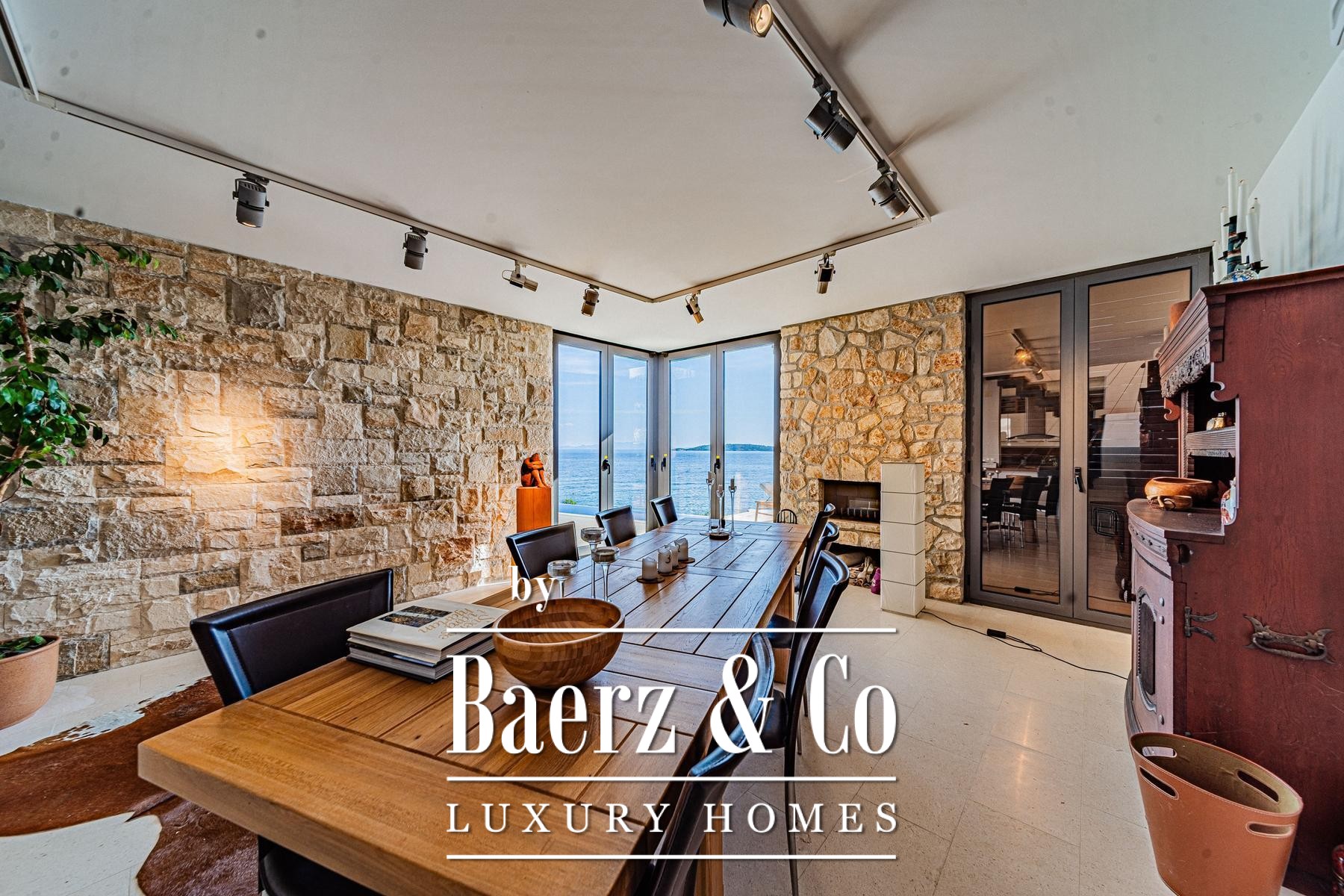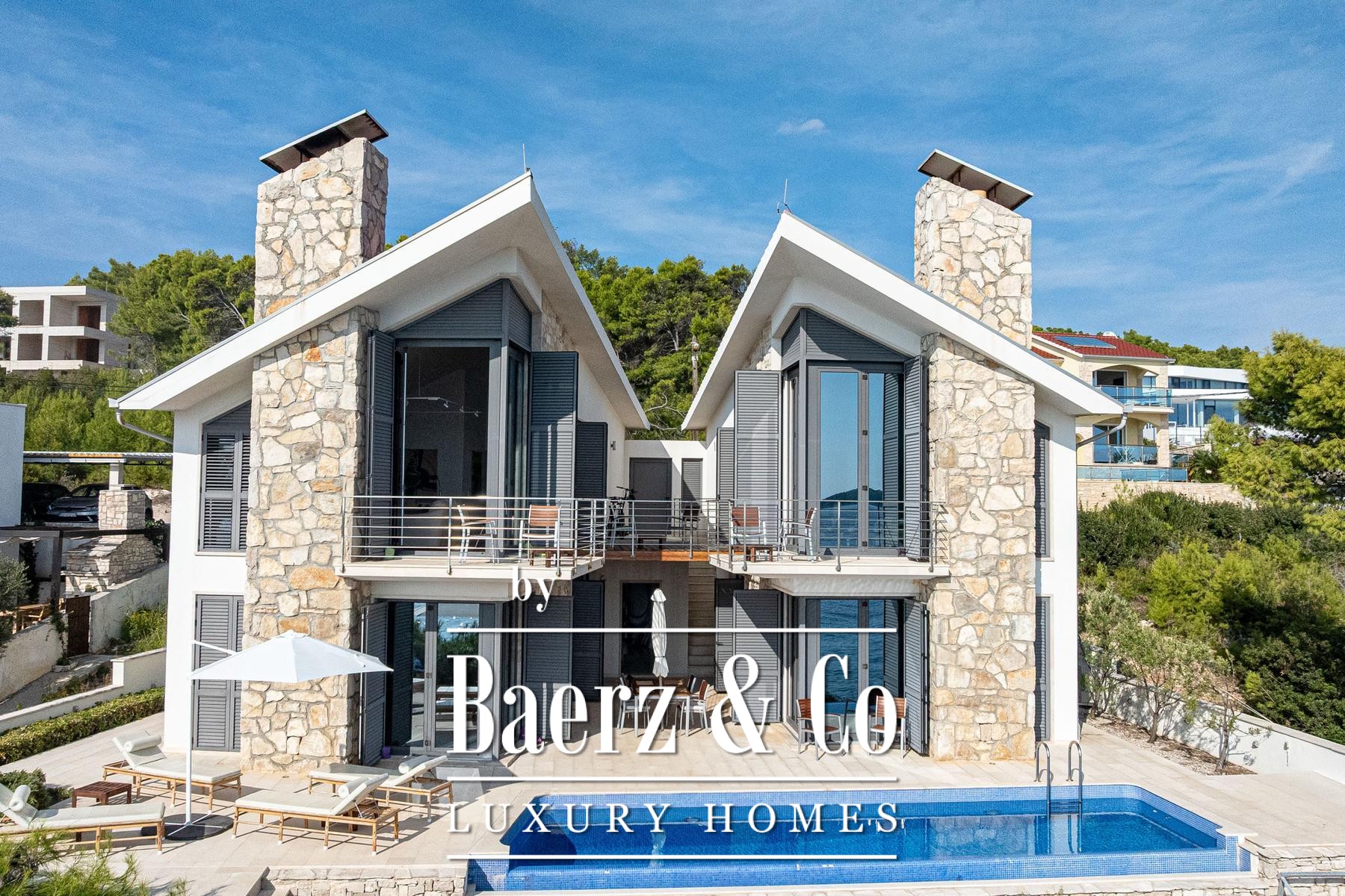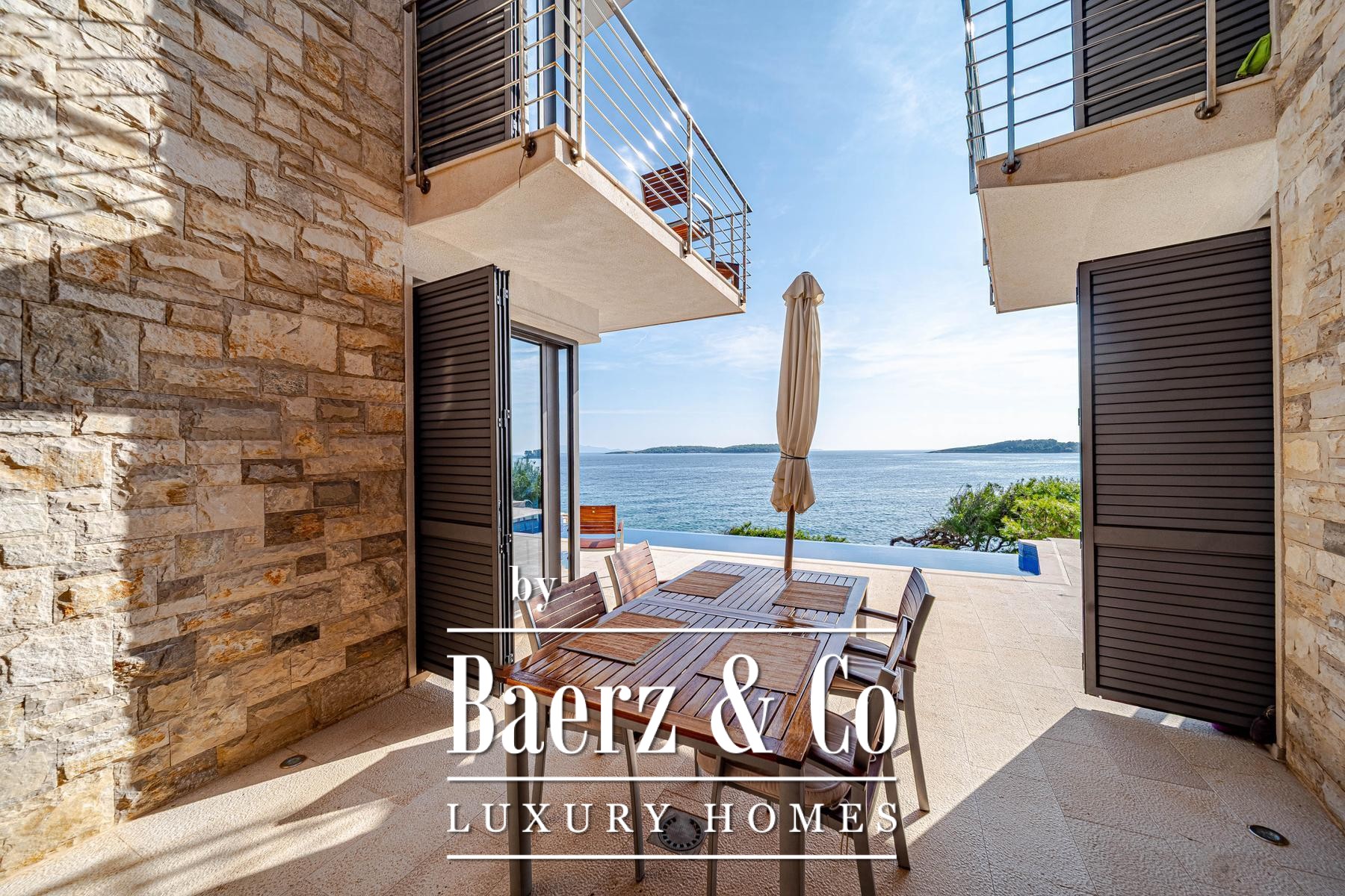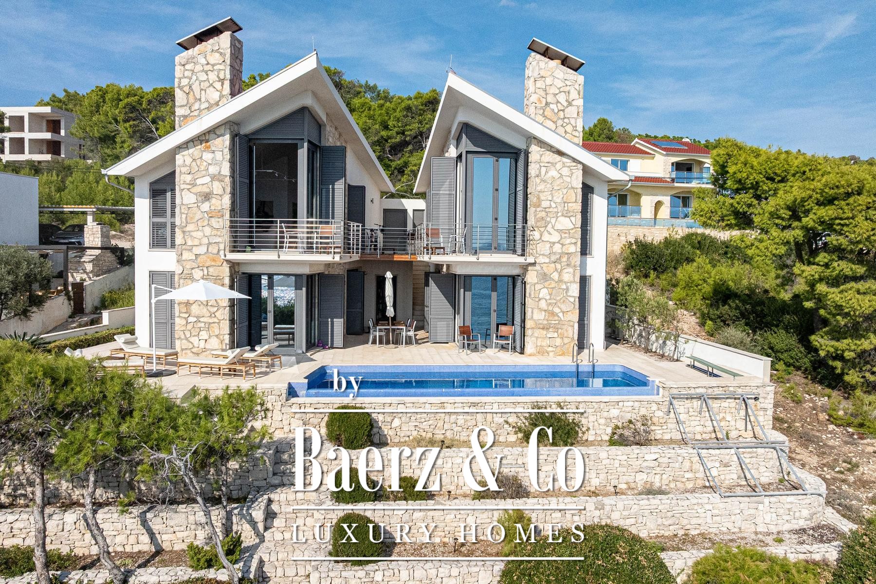 Diese Villa Blato liegt direkt am Meer in Kroatien und bietet 260 m² Wohnfläche auf einem 500 m² großen Grundstück. Architektonische Klarheit prägt die Residenz, bestehend aus zwei unabhängigen Einheiten, die durch großzügige Terrassen verbunden sind, wobei jede als eigenständiges Zuhause fungiert. Das Hauptgeschoss beider Einheiten verfügt über offene Wohn-, Ess- und Küchenbereiche, während im Obergeschoss jeweils zwei Schlafzimmer mit eigenen Bädern und privaten Terrassen untergebracht sind.