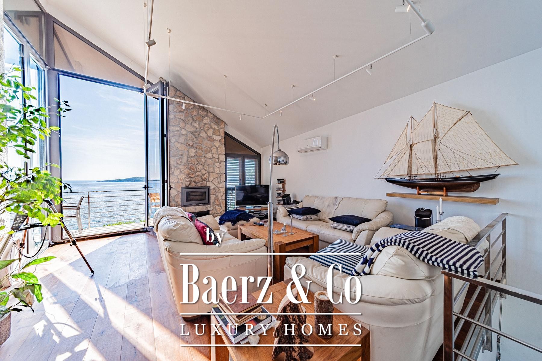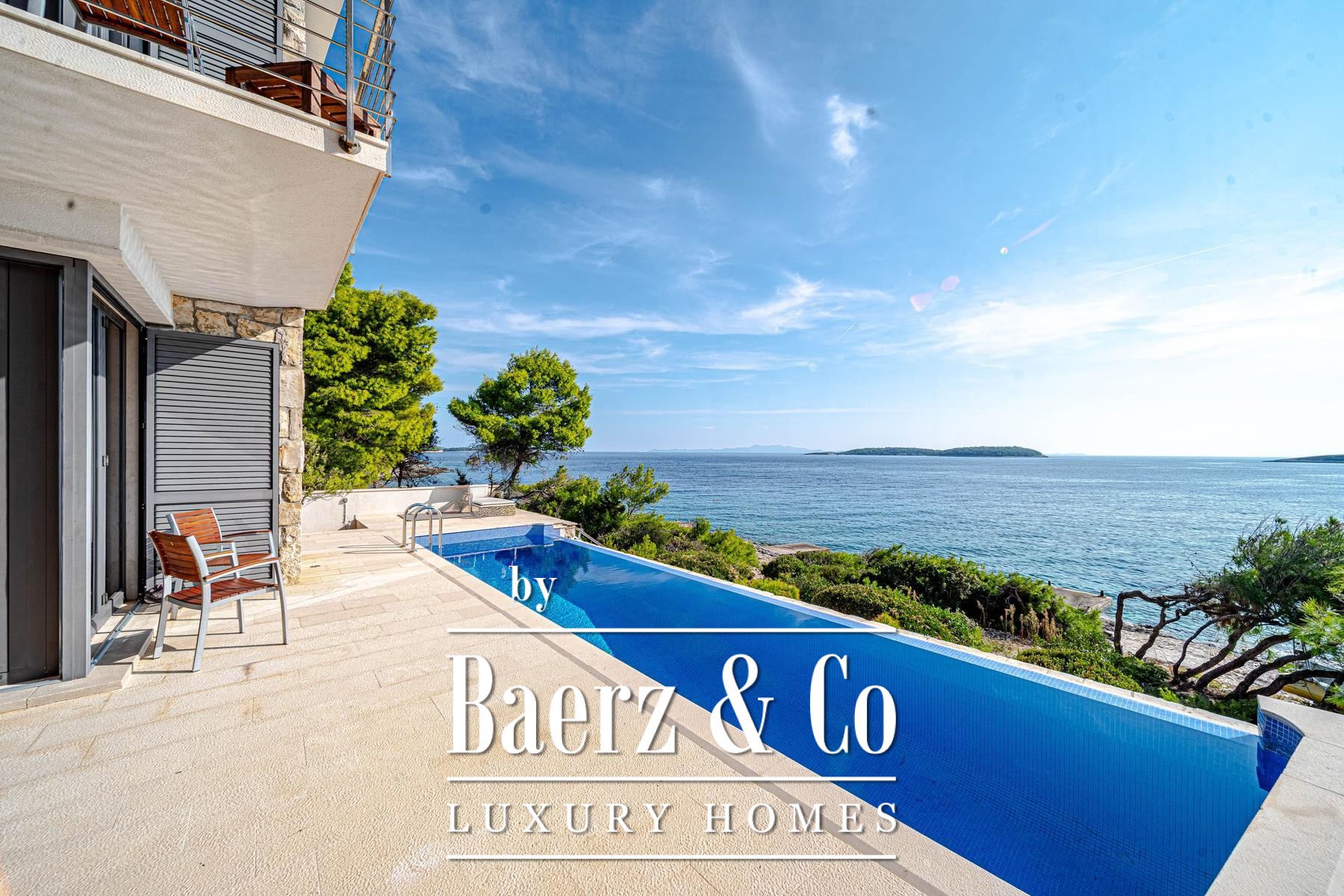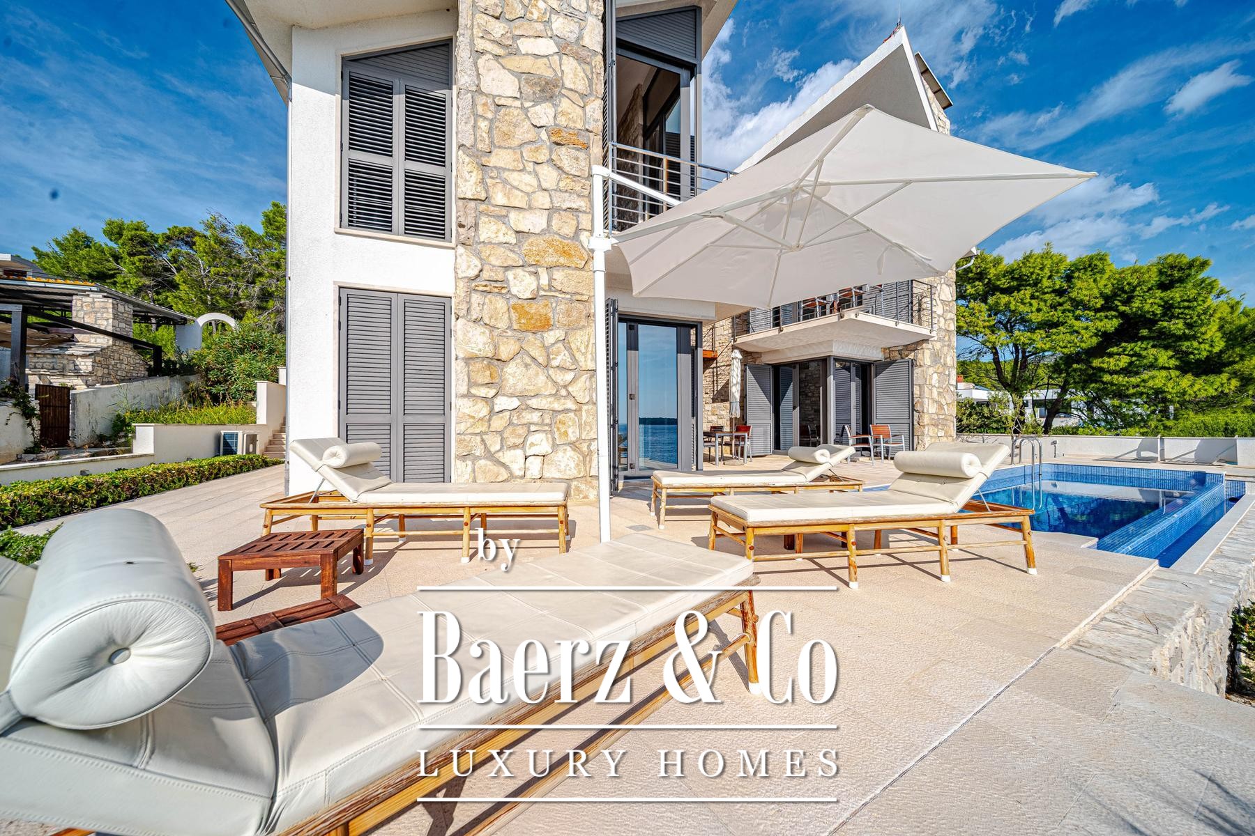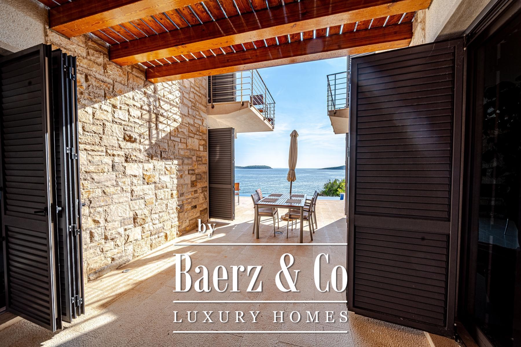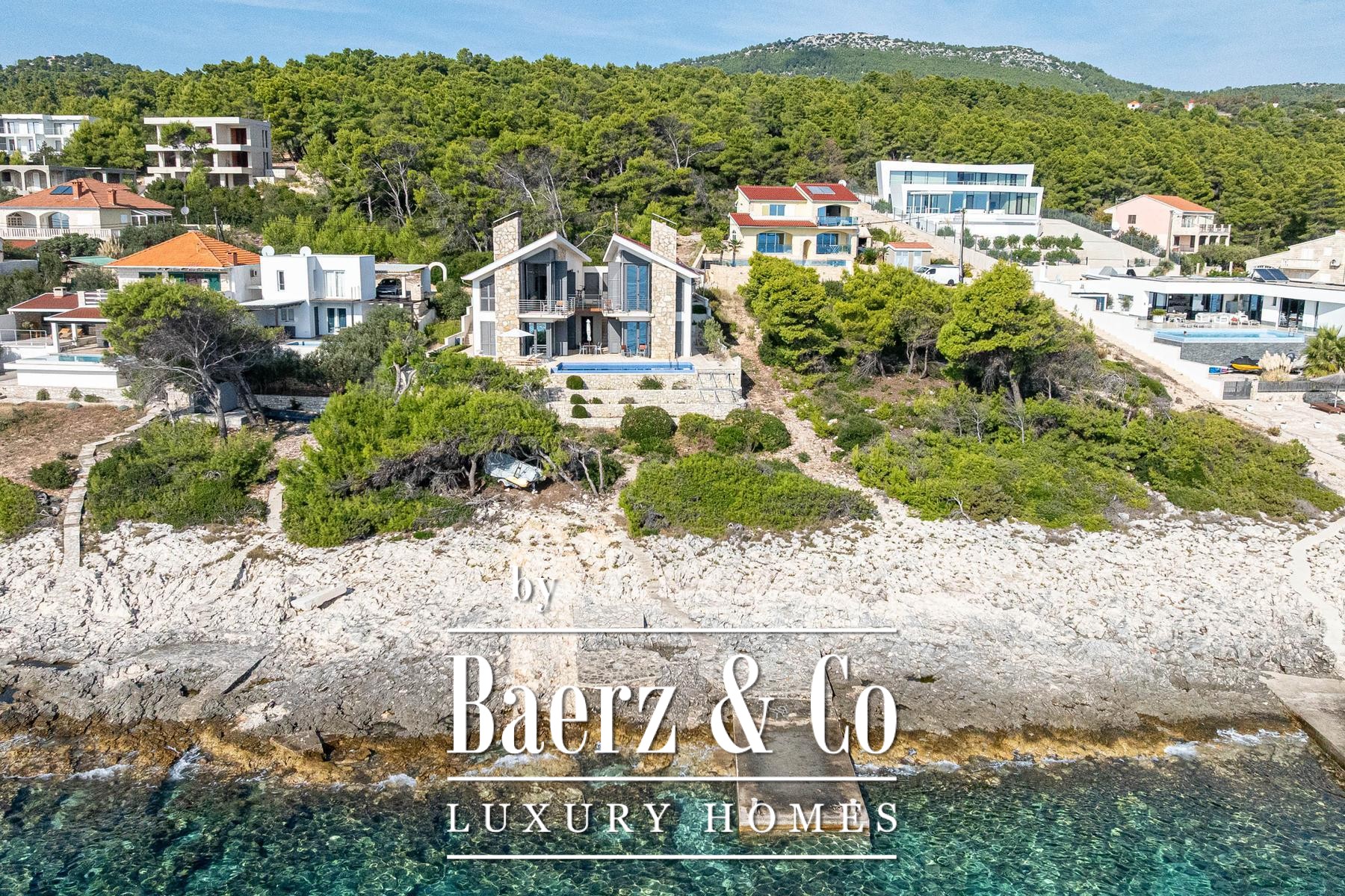 Diese Villa Blato liegt direkt am Meer in Kroatien und bietet 260 m² Wohnfläche auf einem 500 m² großen Grundstück. Architektonische Klarheit prägt die Residenz, bestehend aus zwei unabhängigen Einheiten, die durch großzügige Terrassen verbunden sind, wobei jede als eigenständiges Zuhause fungiert. Das Hauptgeschoss beider Einheiten verfügt über offene Wohn-, Ess- und Küchenbereiche, während im Obergeschoss jeweils zwei Schlafzimmer mit eigenen Bädern und privaten Terrassen untergebracht sind.
