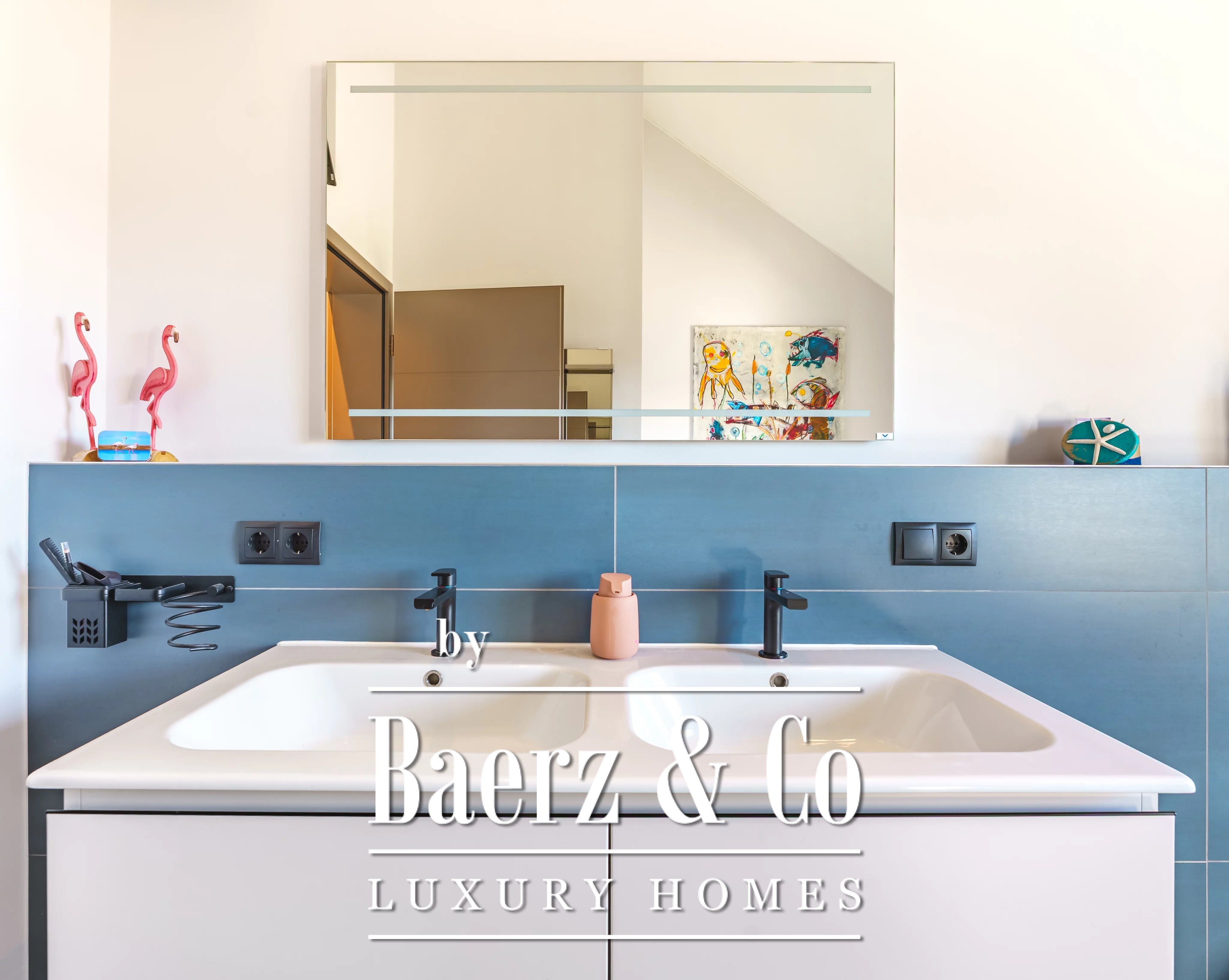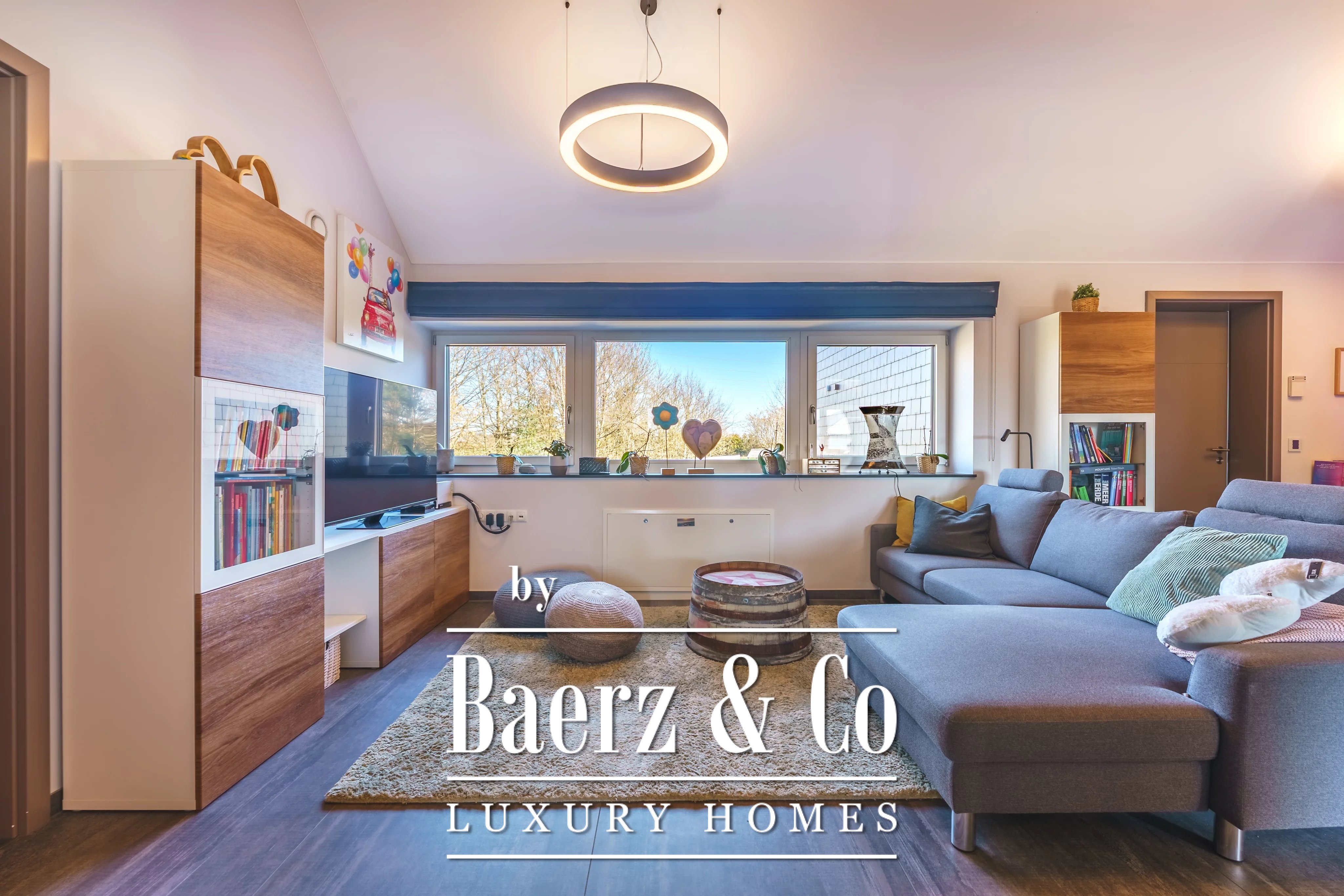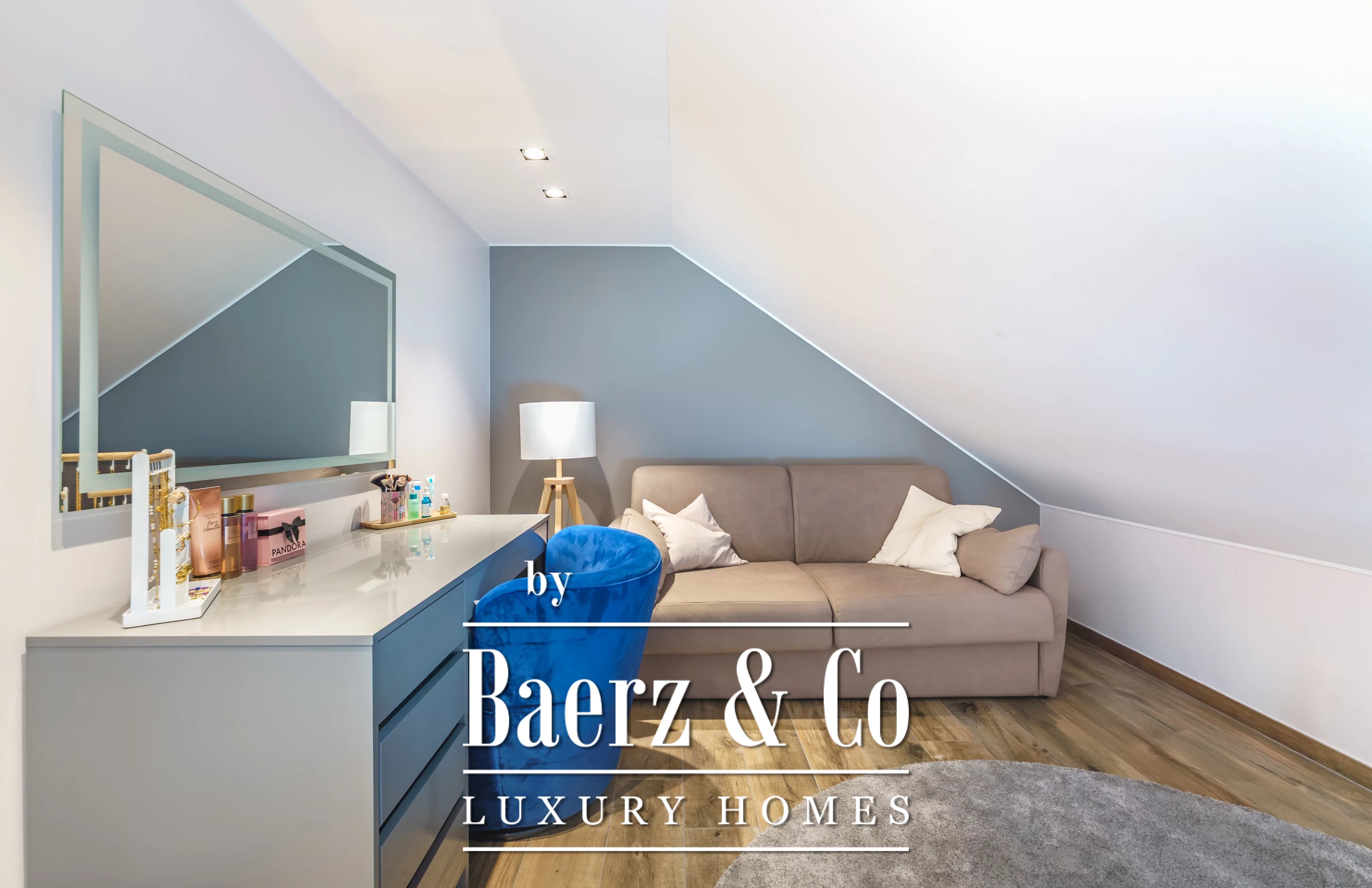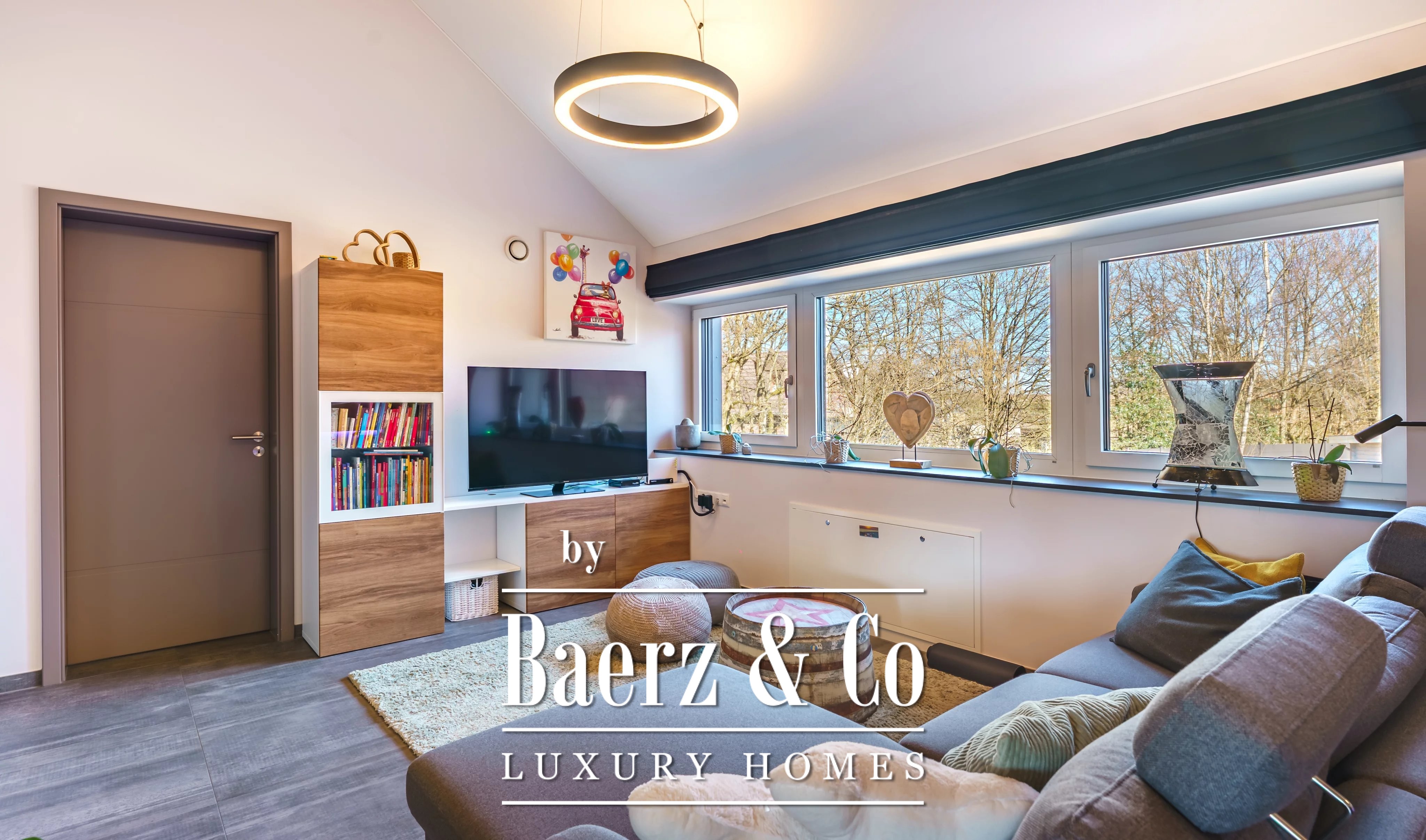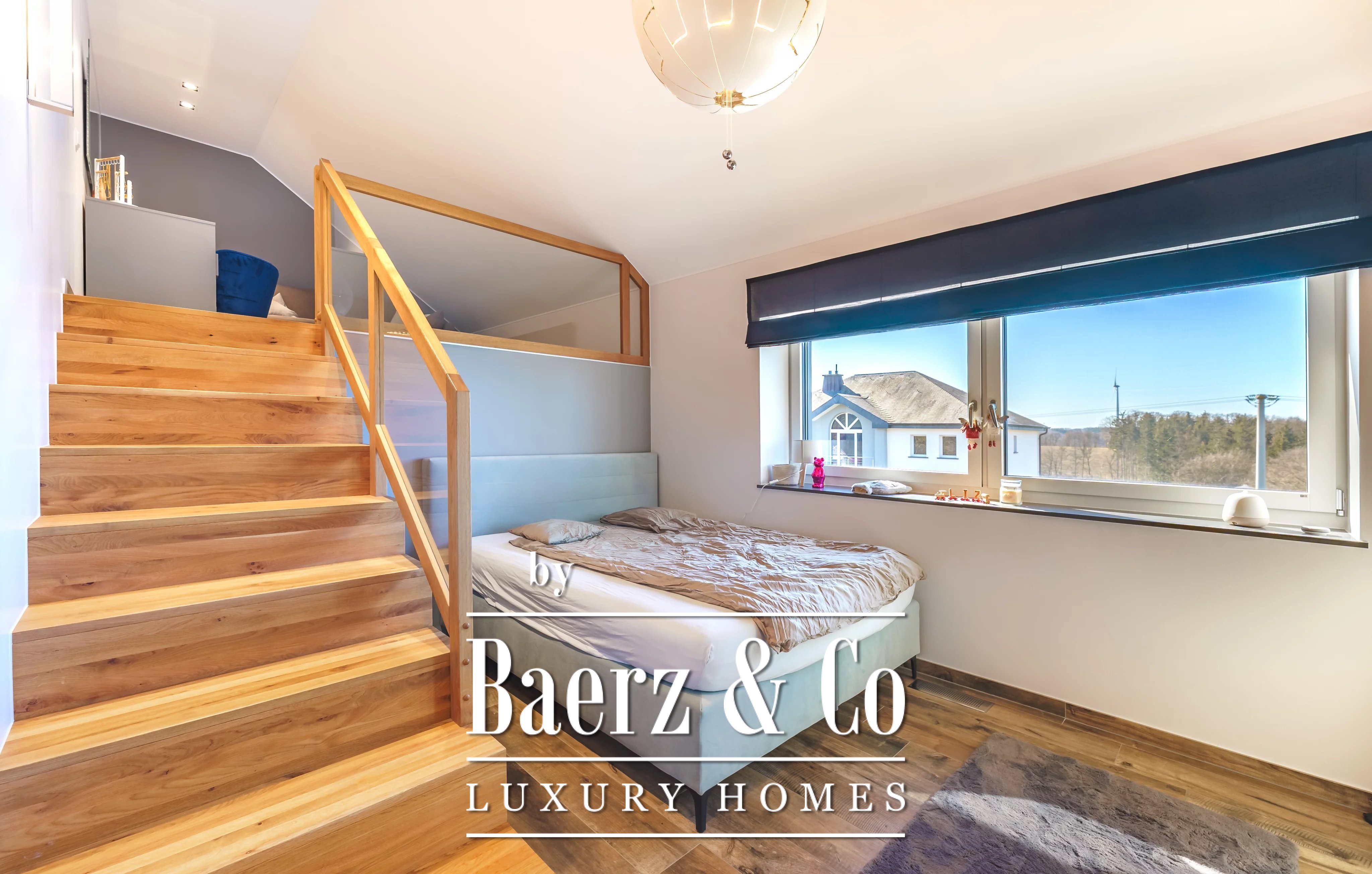 Im Obergeschoss schafft ein weiteres Wohnzimmer einen privaten Rückzugsort für die Familie. Es gibt fünf Schlafzimmer und vier Bäder, darunter eine Master-Suite mit Ankleidezimmer, eigenem Duschbad und ein Gästezimmer mit eigenem Bad. Der Hauswirtschaftsraum ist dezent und effizient und unterstützt den täglichen Komfort.