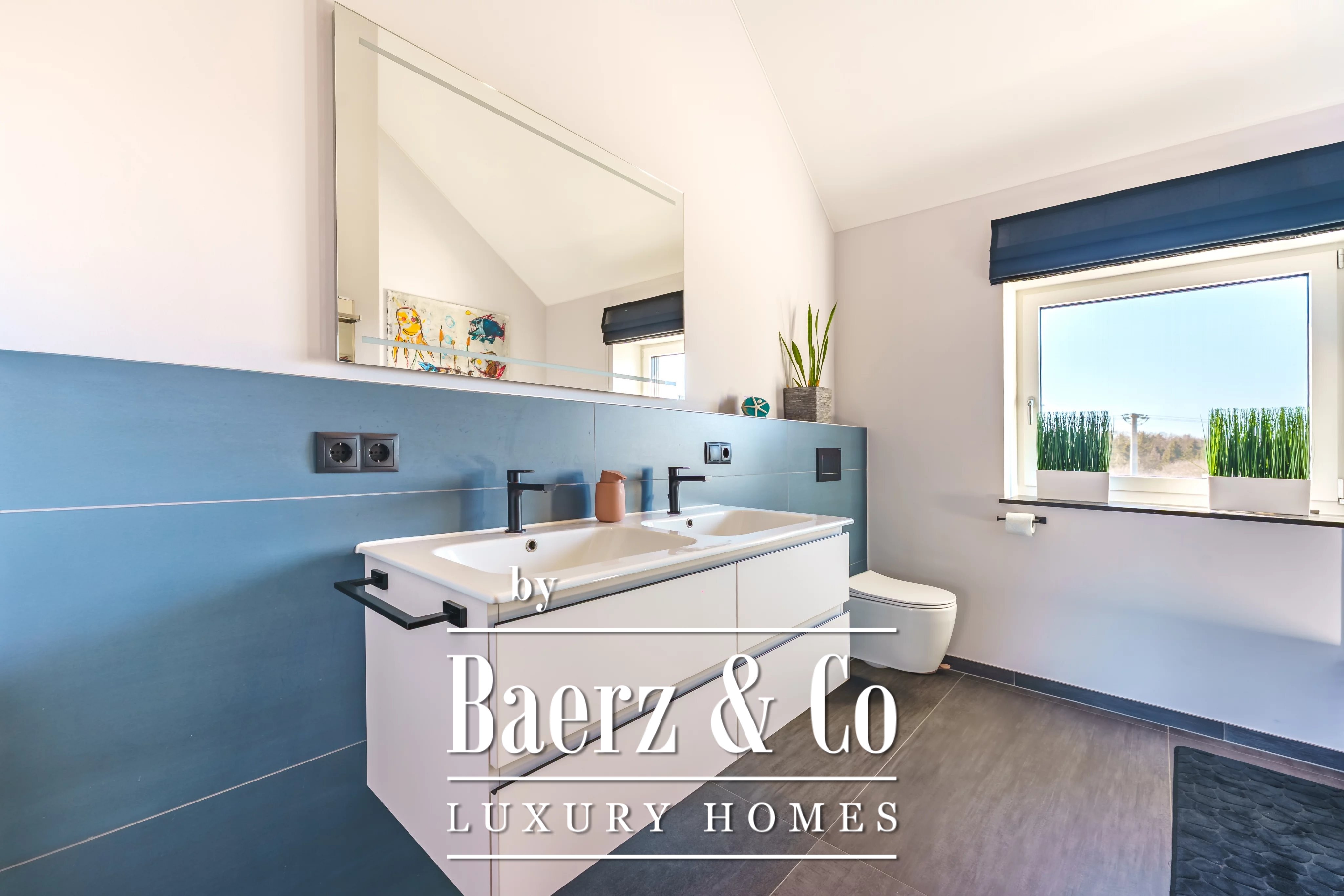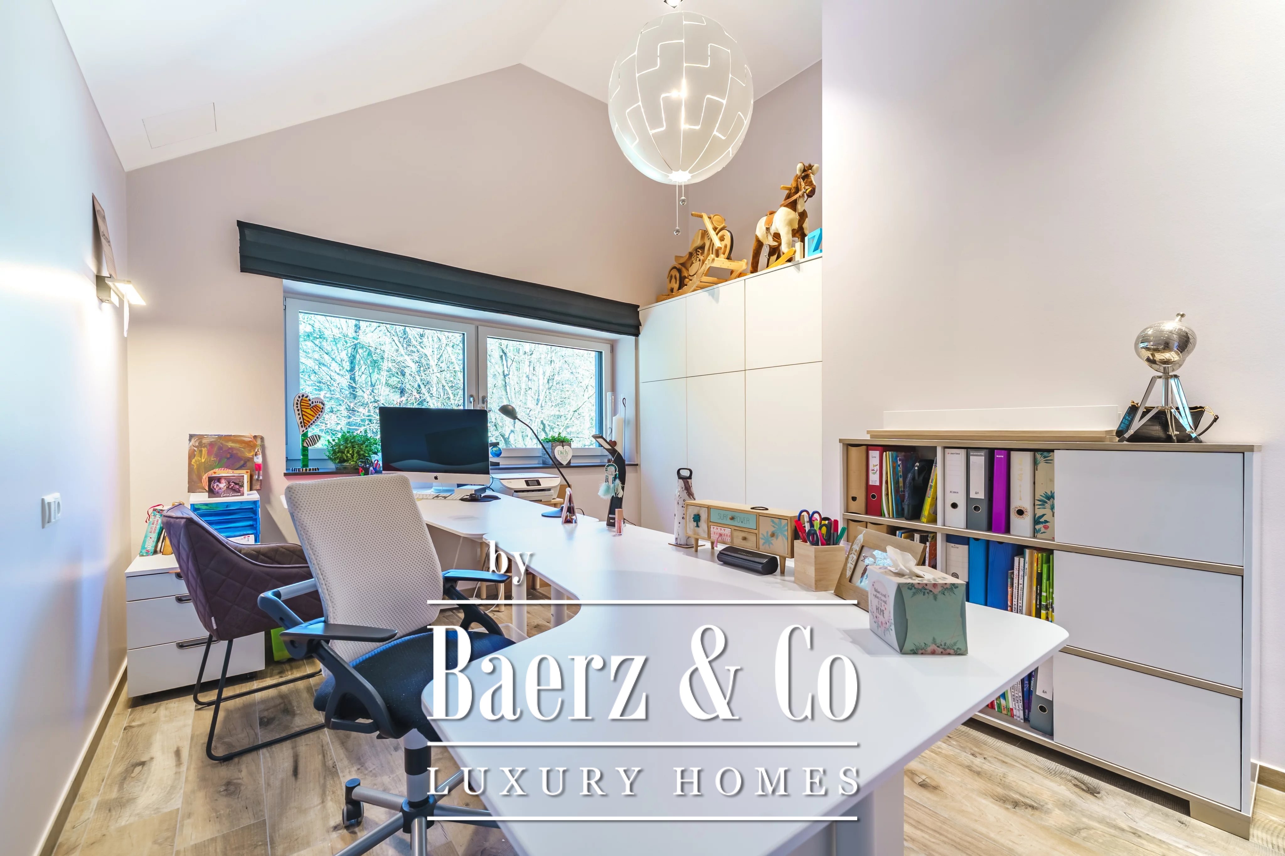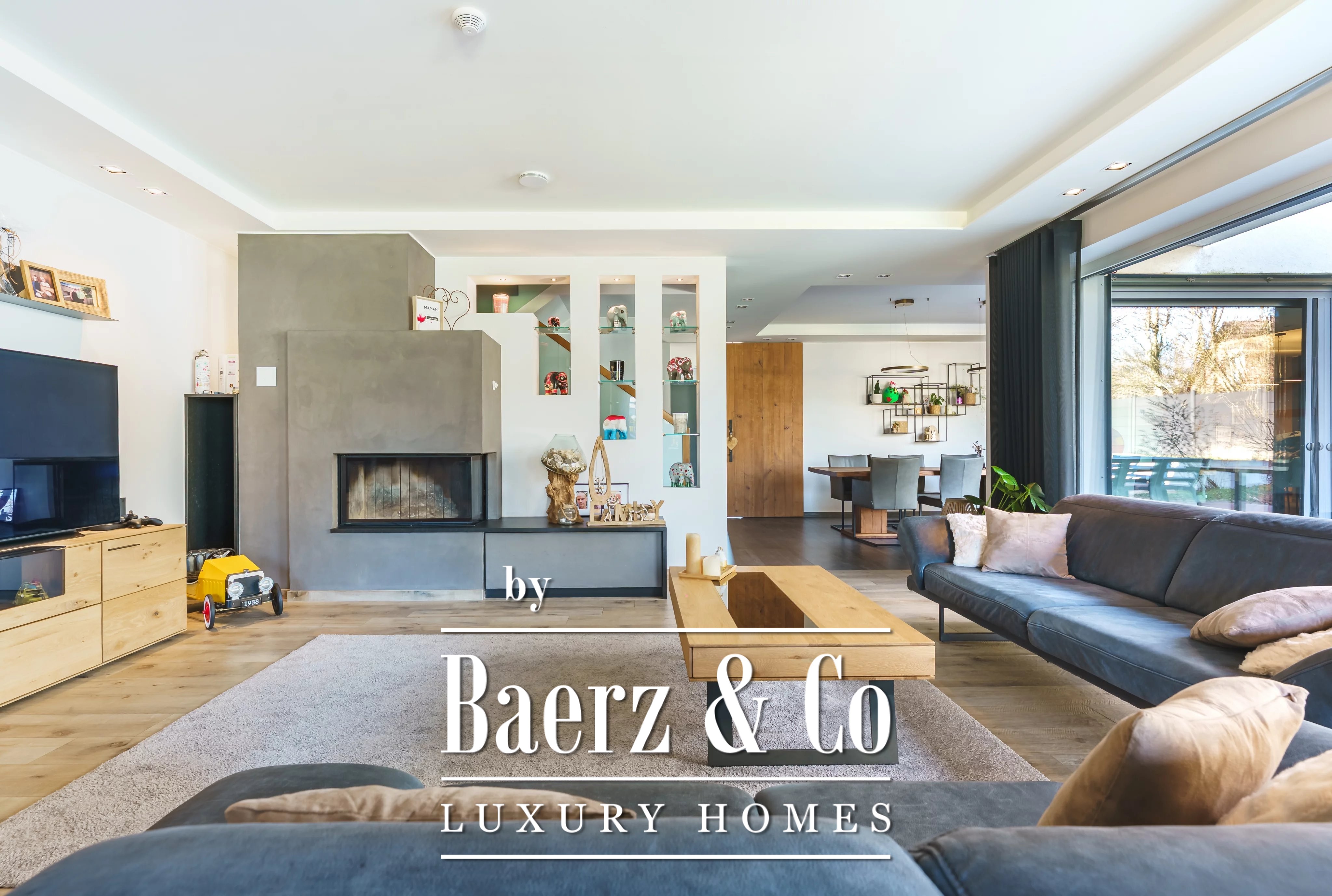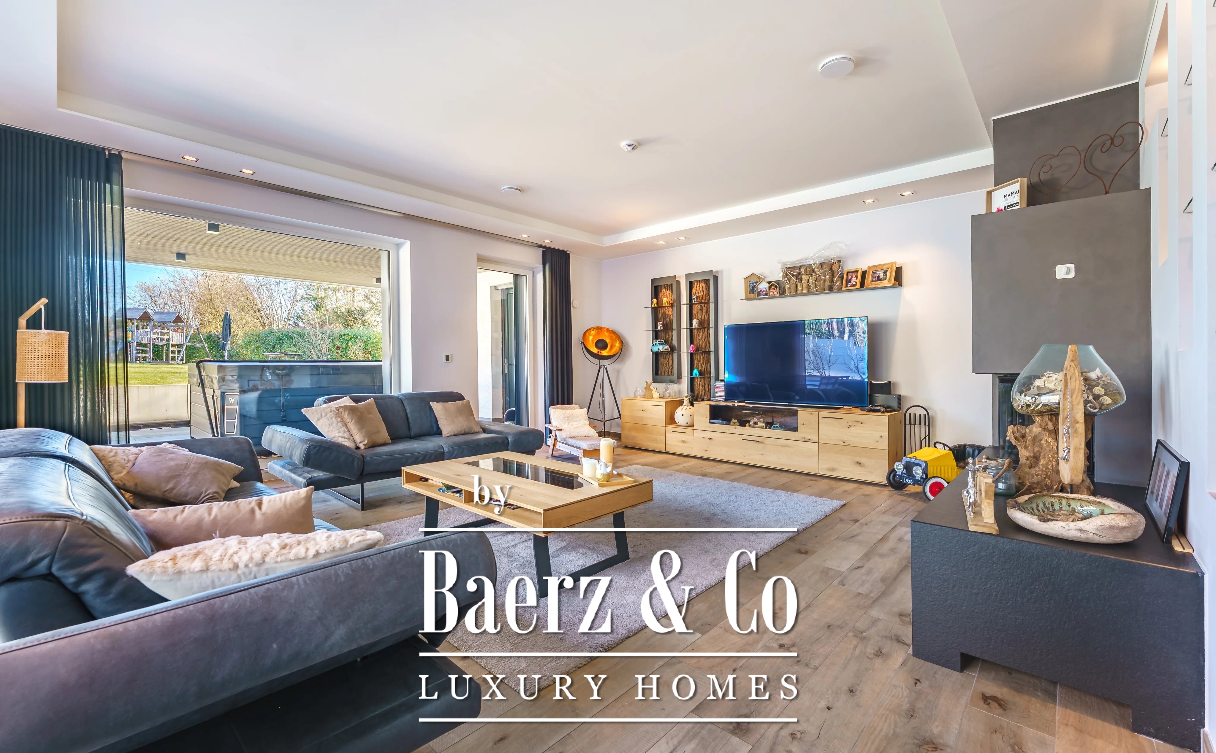 Im Obergeschoss schafft ein weiteres Wohnzimmer einen privaten Rückzugsort für die Familie. Es gibt fünf Schlafzimmer und vier Bäder, darunter eine Master-Suite mit Ankleidezimmer, eigenem Duschbad und ein Gästezimmer mit eigenem Bad. Der Hauswirtschaftsraum ist dezent und effizient und unterstützt den täglichen Komfort.