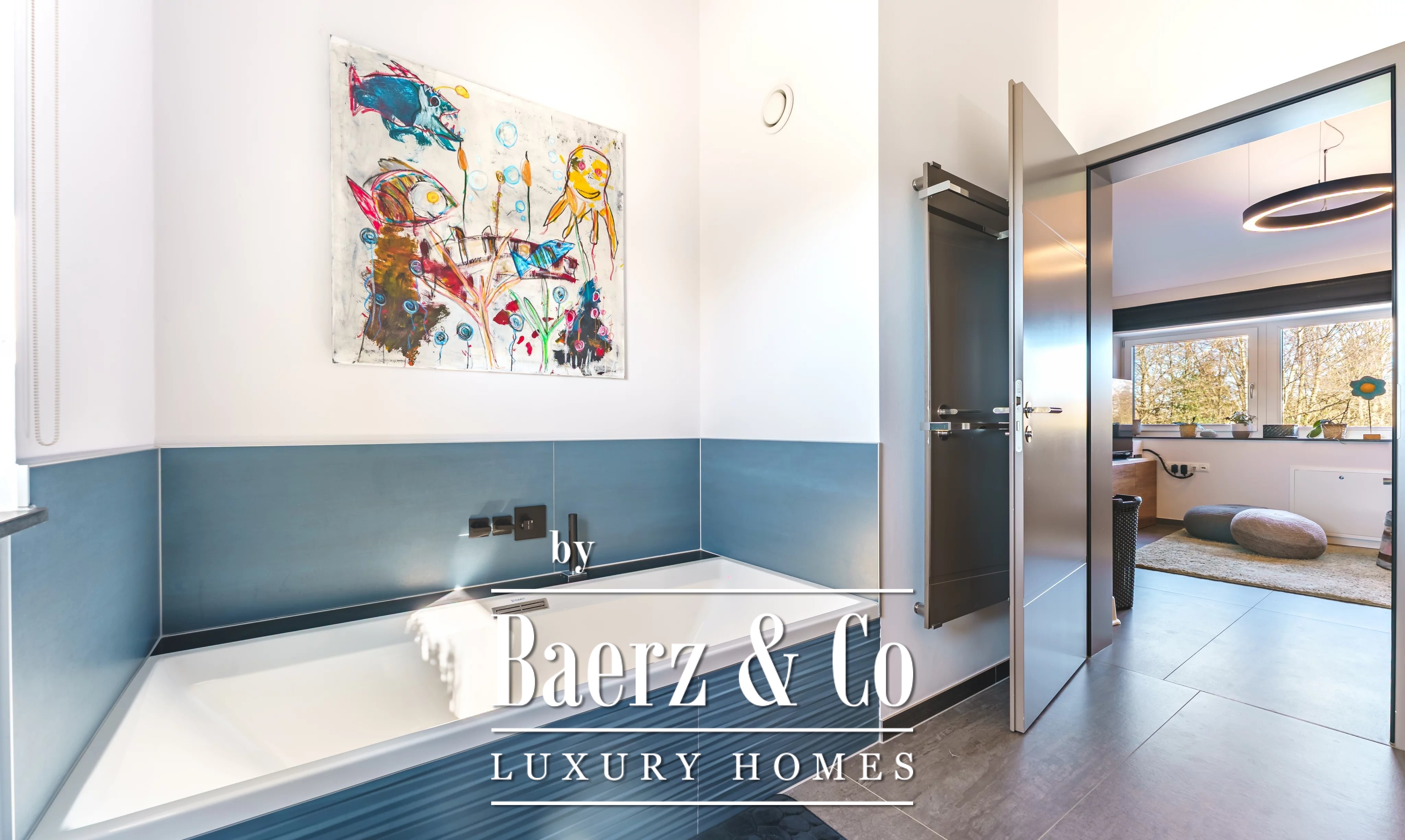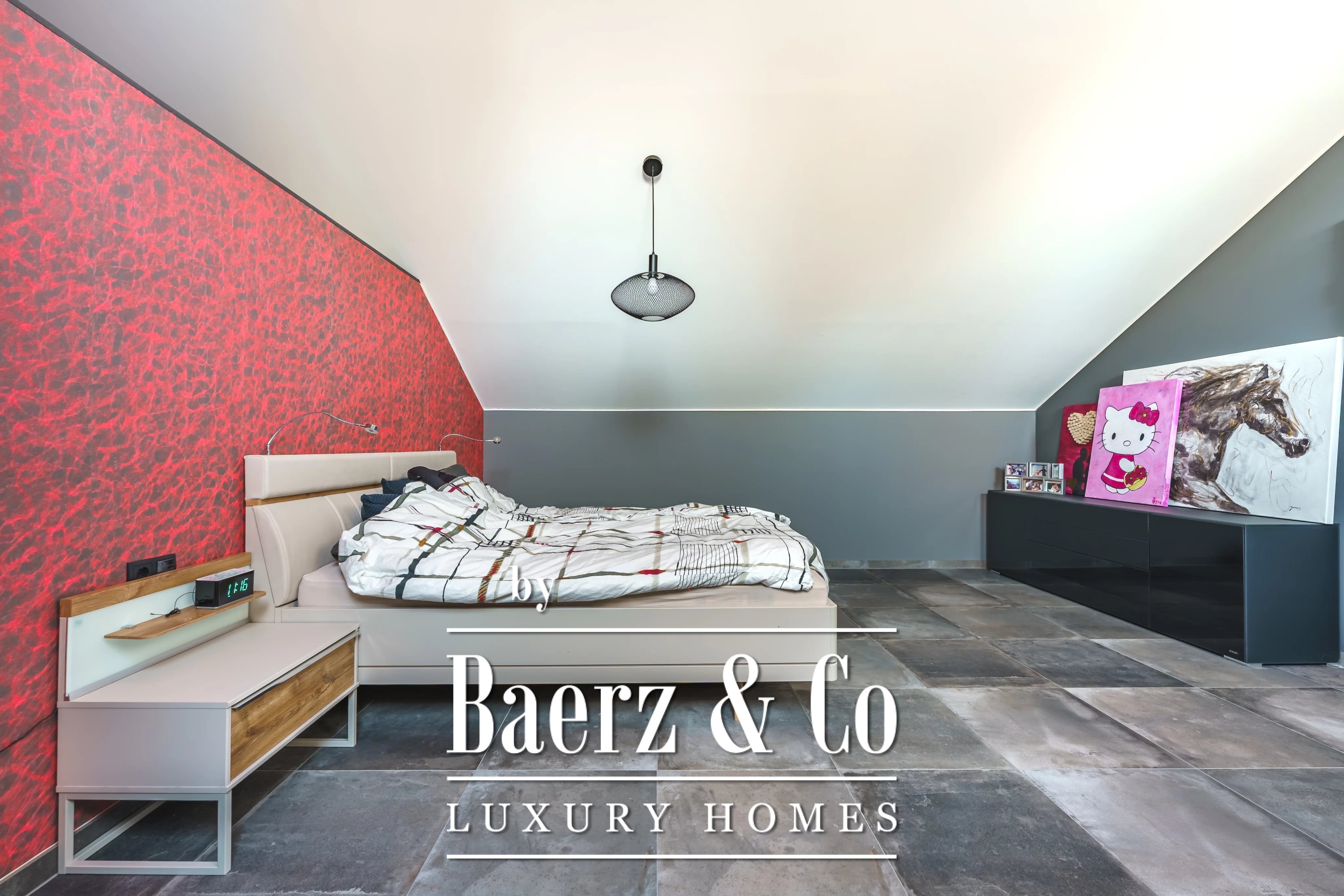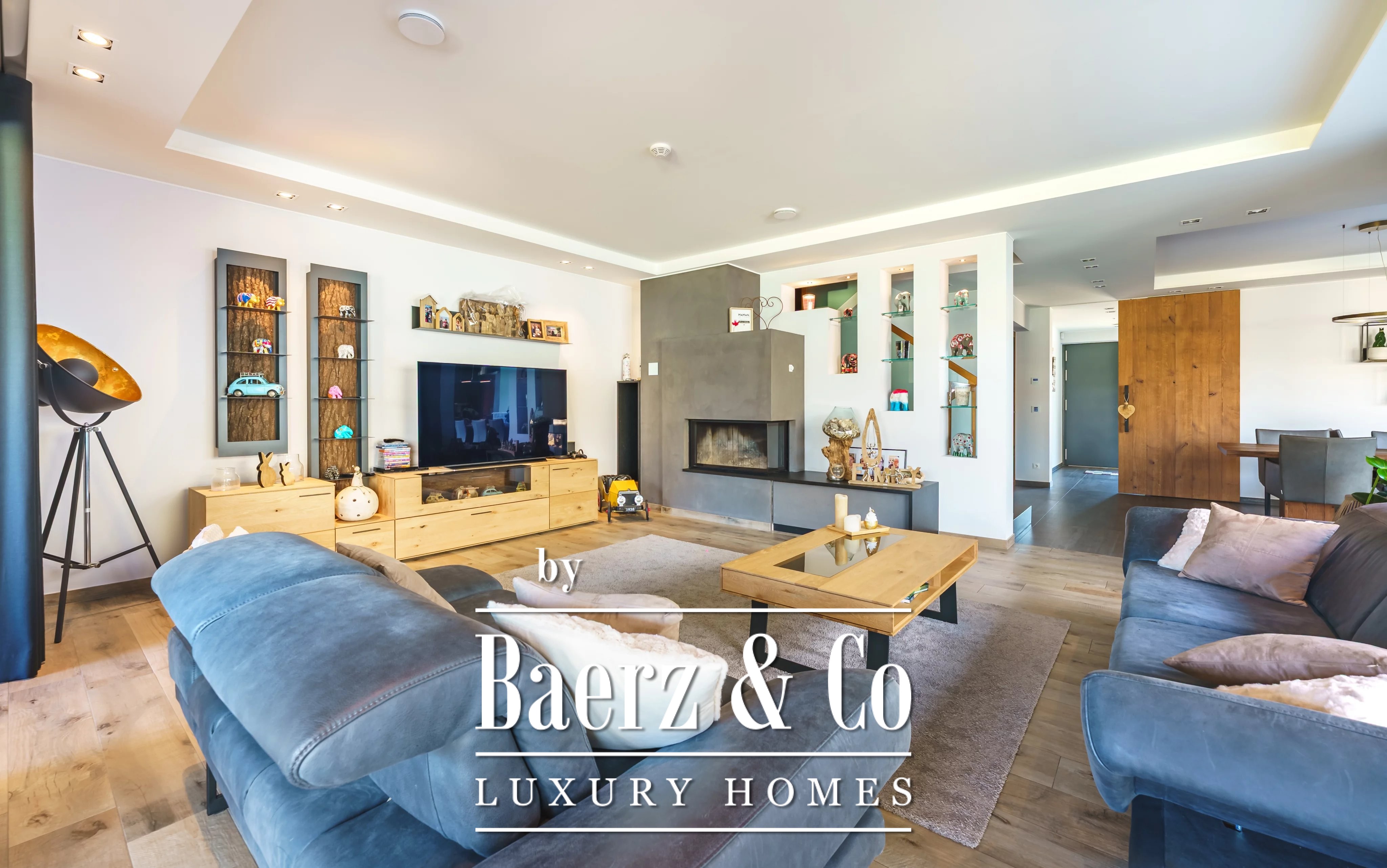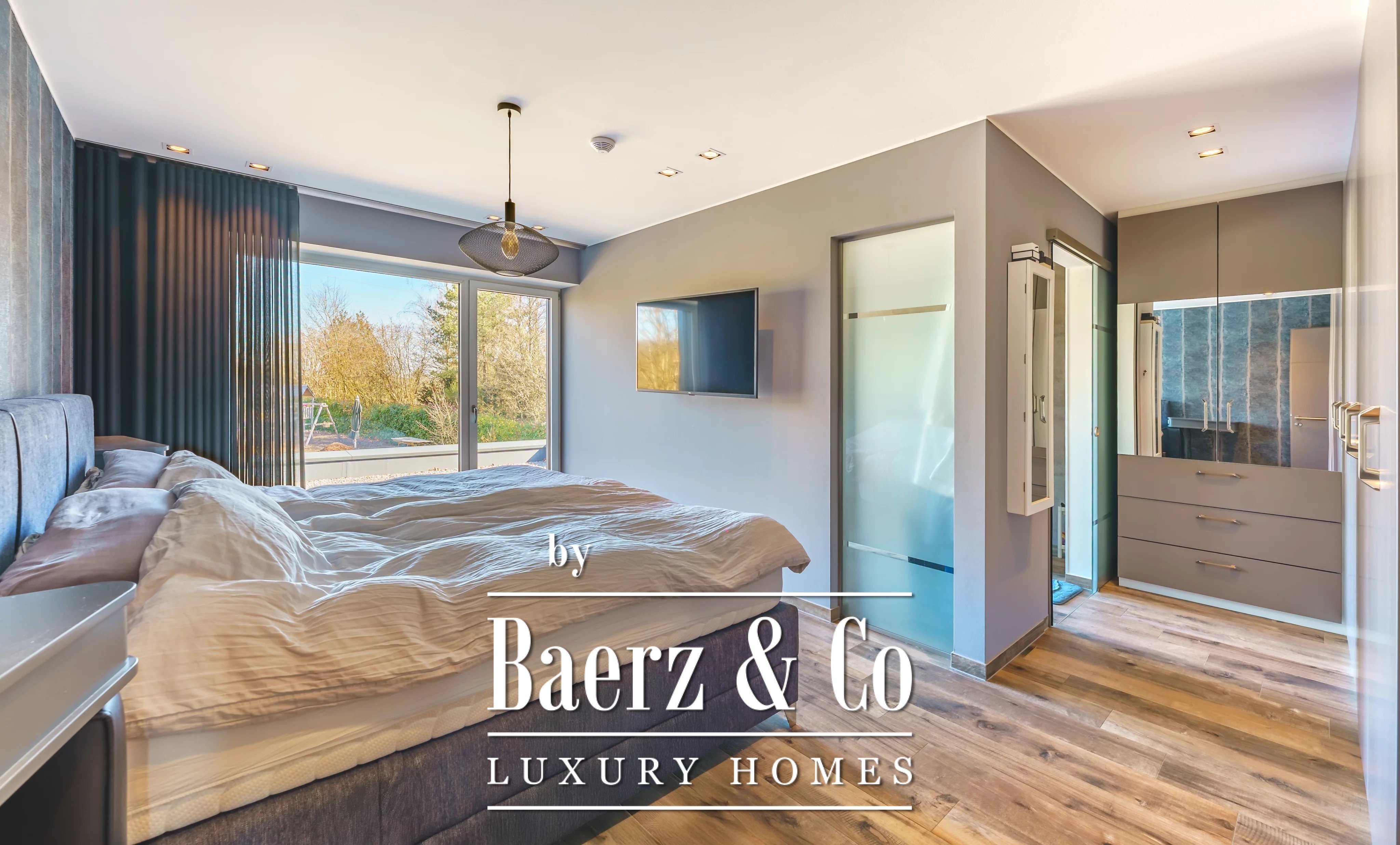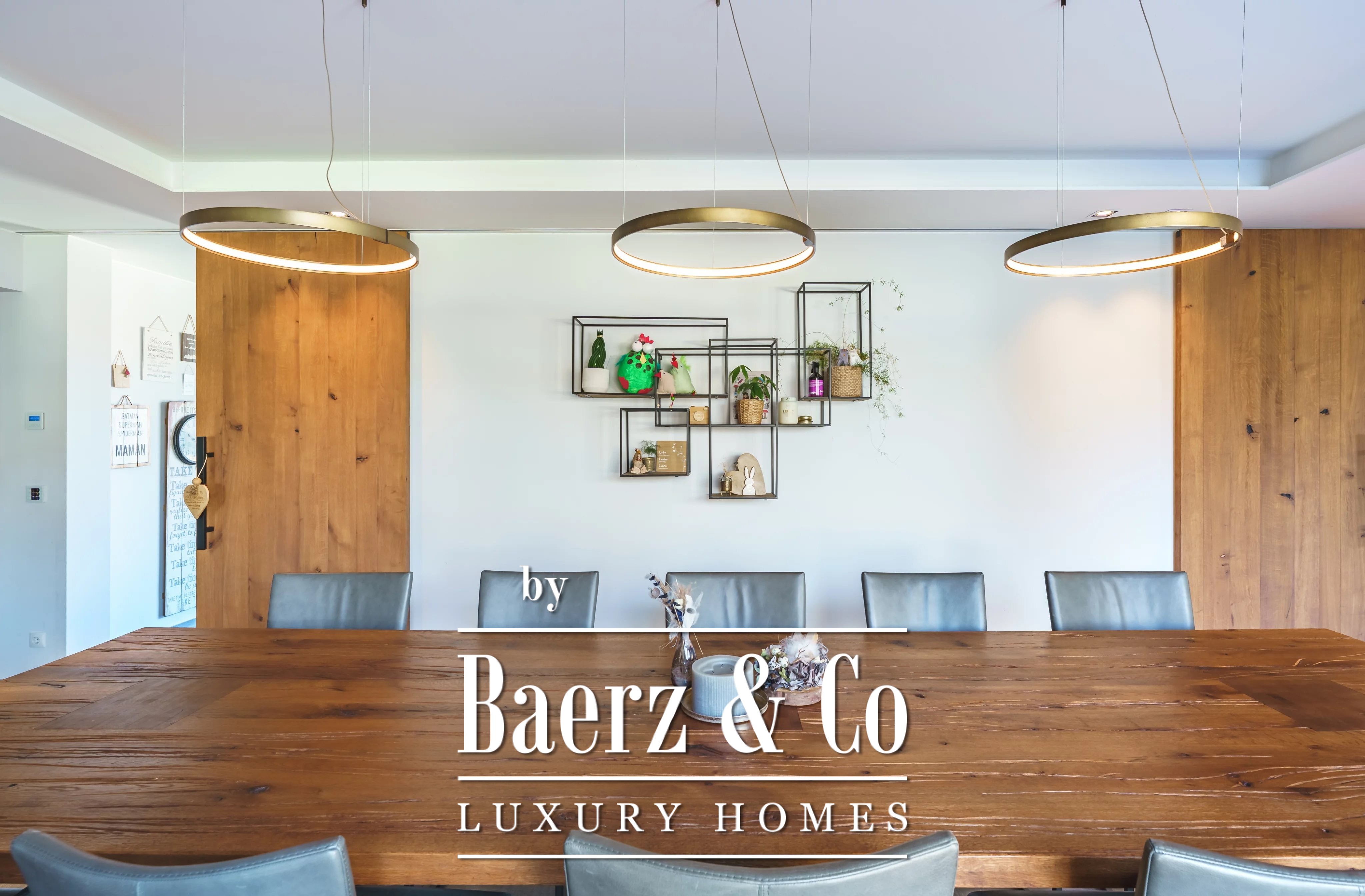 Im Obergeschoss schafft ein weiteres Wohnzimmer einen privaten Rückzugsort für die Familie. Es gibt fünf Schlafzimmer und vier Bäder, darunter eine Master-Suite mit Ankleidezimmer, eigenem Duschbad und ein Gästezimmer mit eigenem Bad. Der Hauswirtschaftsraum ist dezent und effizient und unterstützt den täglichen Komfort.