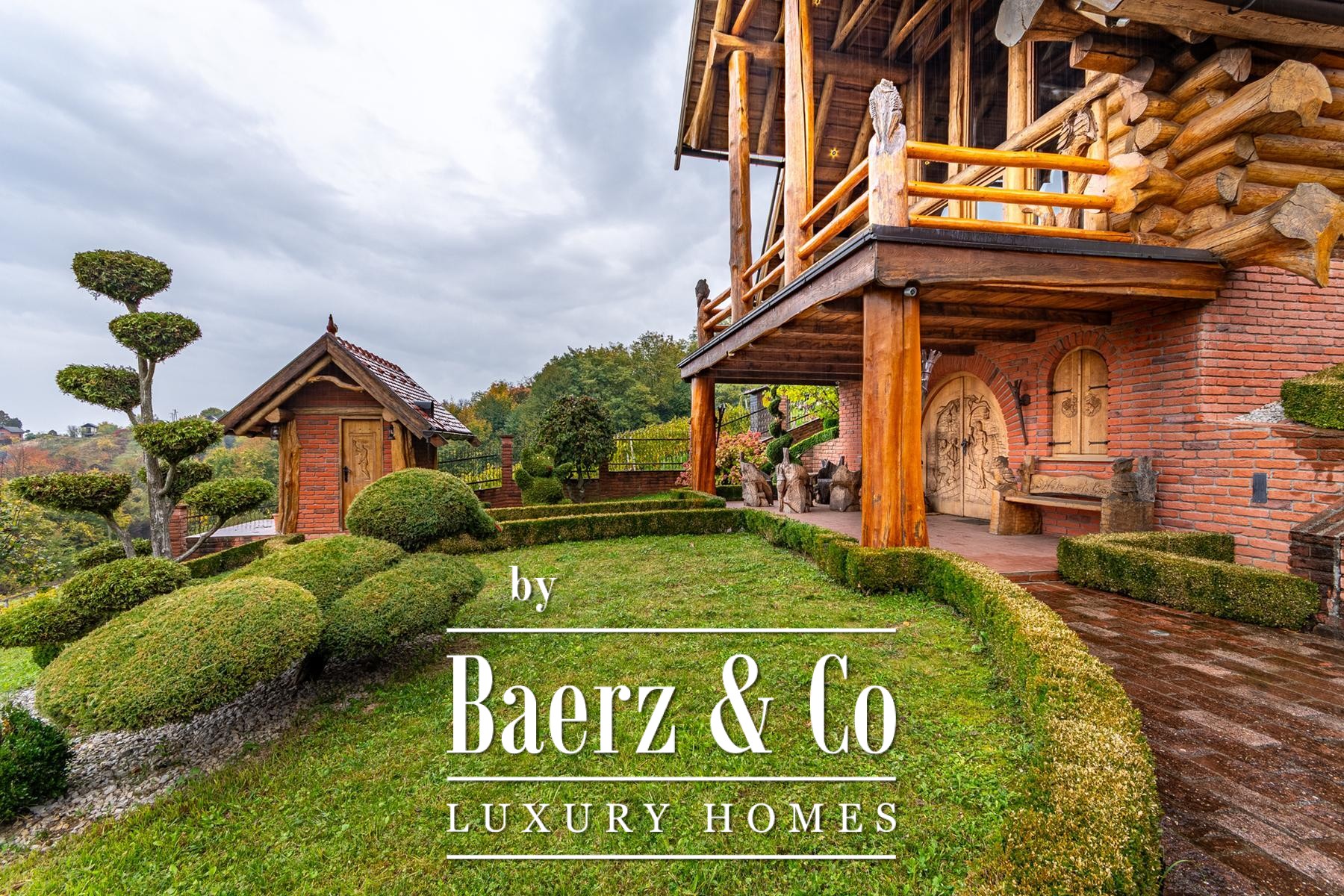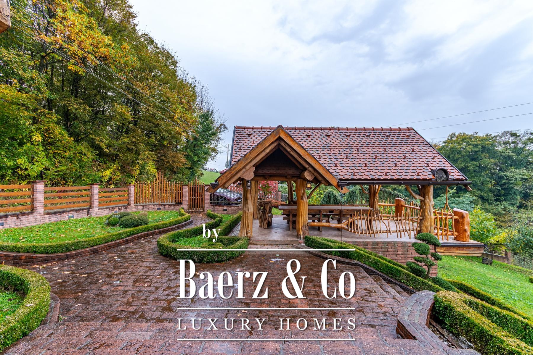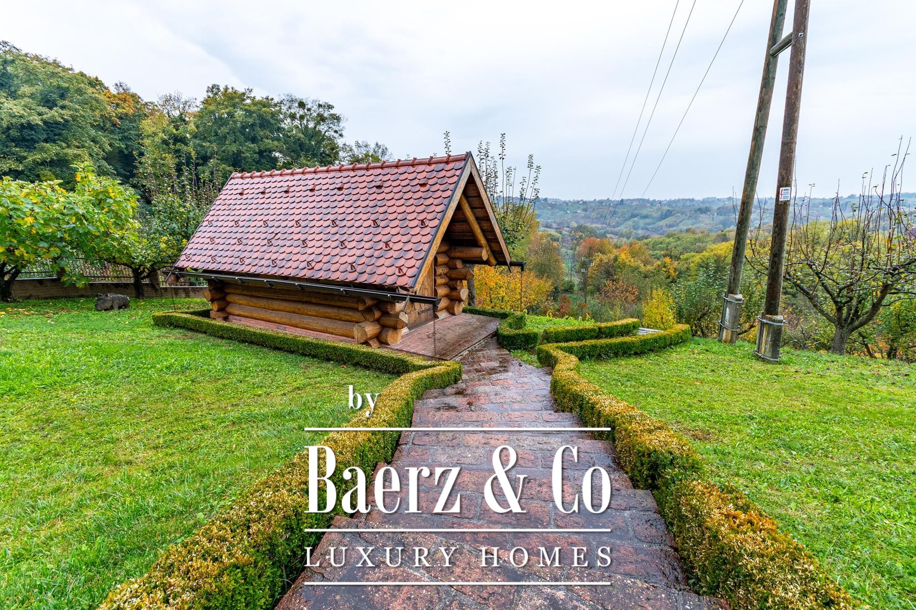 Drei Nebengebäude—ein Pavillon, eine Werkstatt und ein Außen-WC—unterstreichen den authentisch ländlichen Charakter. Das sorgfältig gestaltete Grundstück mit Apfel-, Pflaumen-, Feigen-, Aronia- und Himbeerbäumen bietet Orte der Einkehr und des Rückzugs. Panoramablicke und tiefe Privatsphäre schaffen eine unverwechselbare Atmosphäre. Dies ist nicht einfach ein Blockhaus zum Verkauf in Varaždinske Toplice, sondern ein durchdachtes Refugium, das mit Ort und Material verwurzelt ist.