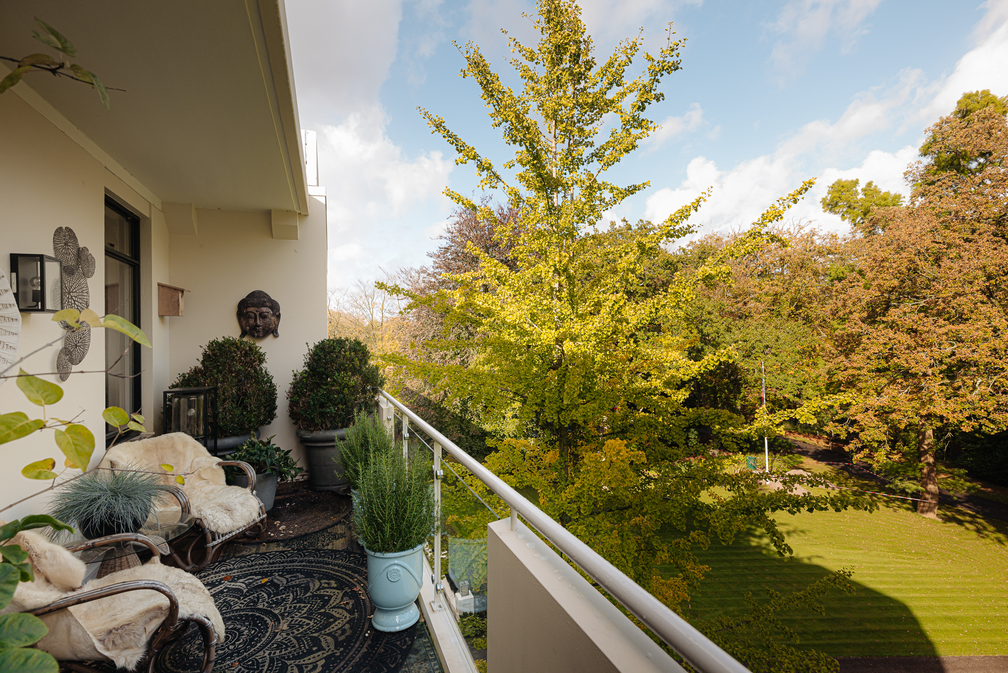 Ruime woonkamer (drie samengetrokken kamers) met gashaard, grote raampartijen en daardoor prachtig uitzicht. Twee balkons omringd door groen.