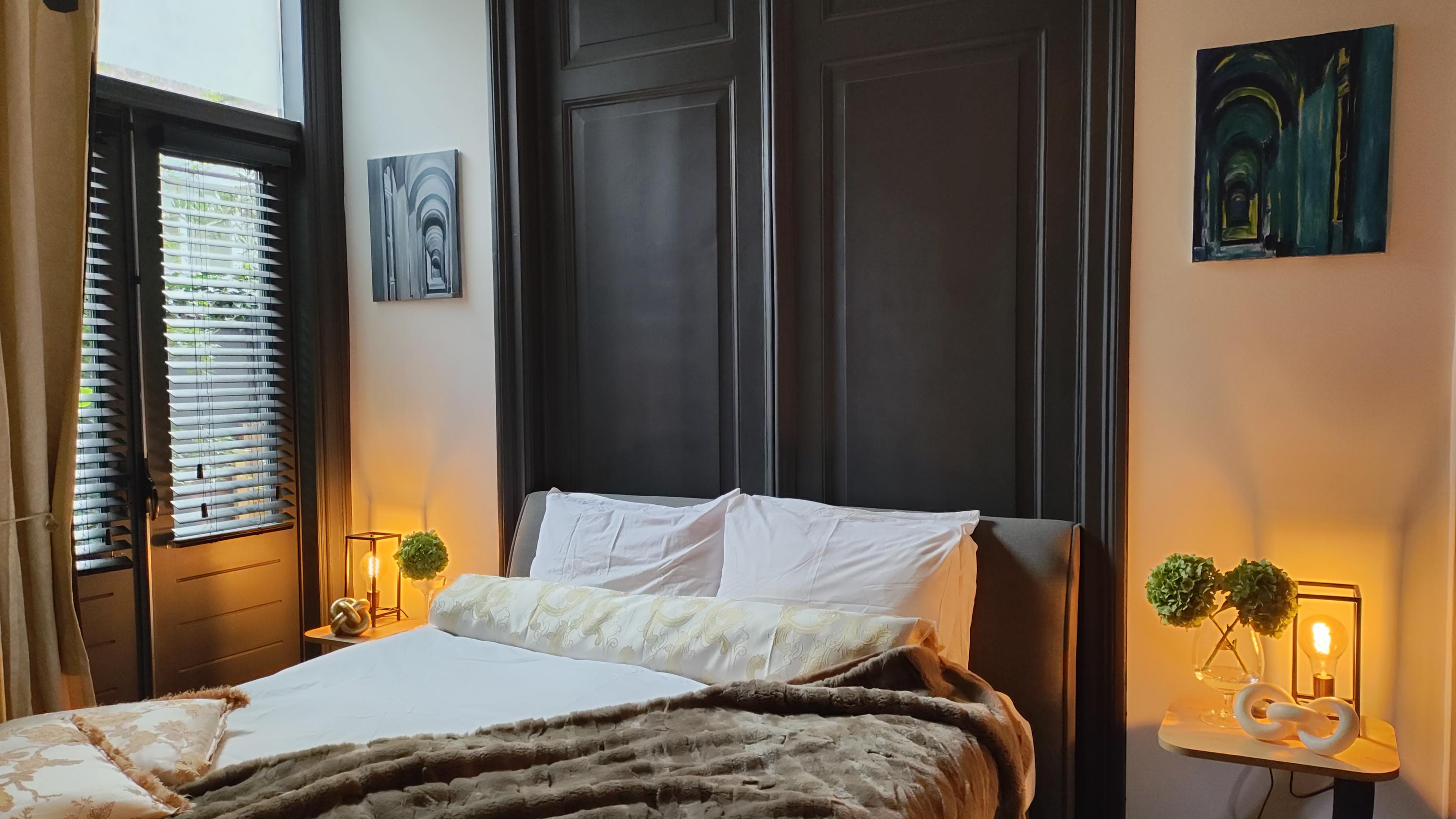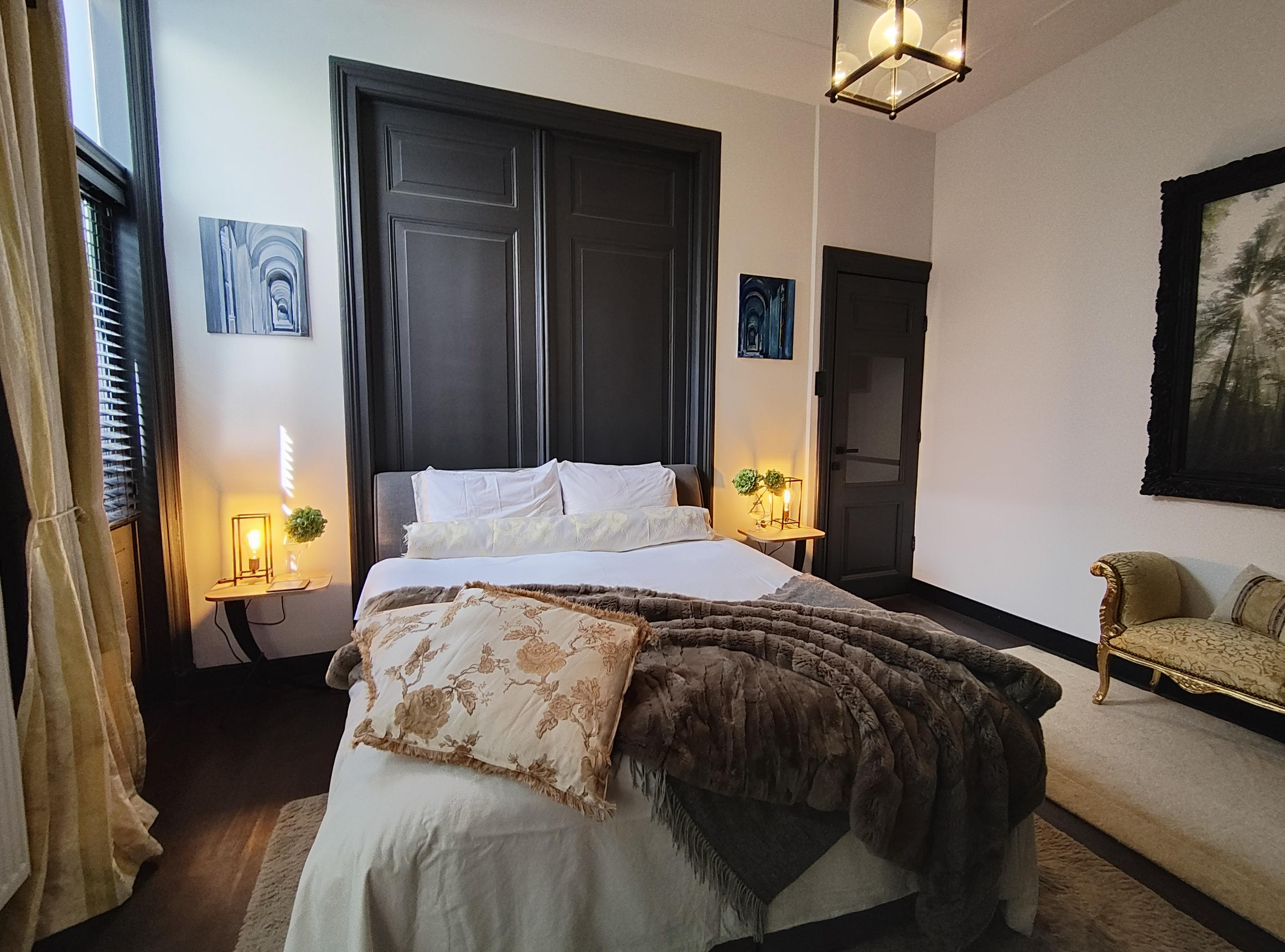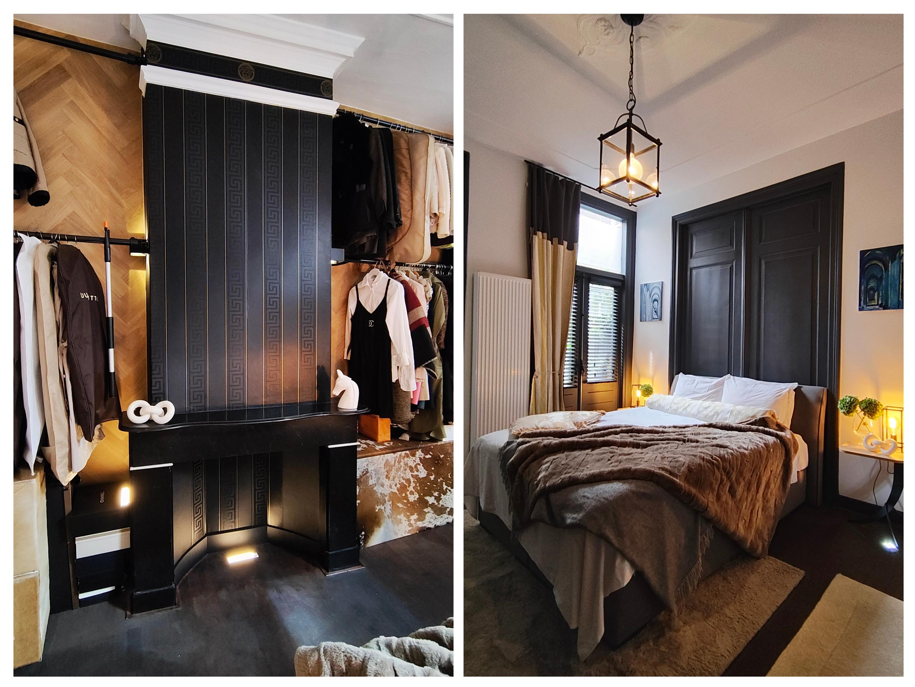 The master bedroom exudes grandeur, with mahogany parquet flooring, elegant period details, and direct access to the garden. A second room on this level – currently used as a study – also opens onto the garden through French doors. Both luxurious bathrooms are fitted with a freestanding bathtub, walk-in rain shower, and double sinks, finished with high-end materials and chic herringbone floor tiles.