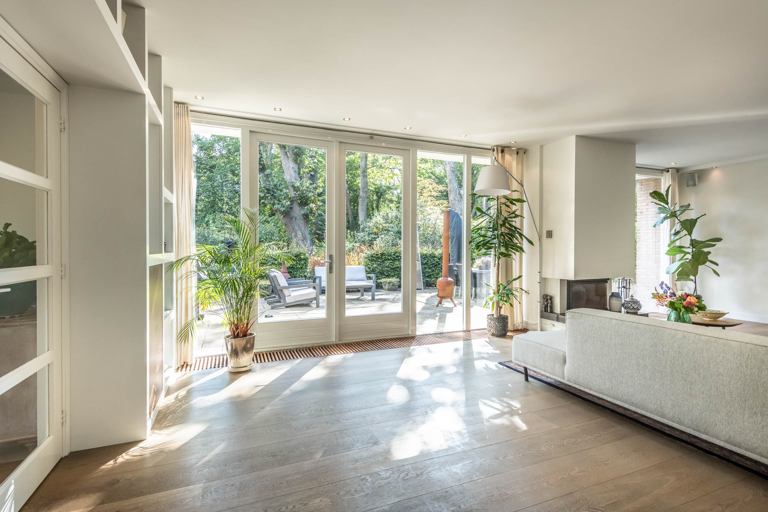 Entrance hall, spacious hallway with toilet and urinal, bright and spacious living room with fireplace, oak flooring and doors to the front terrace. A double door connects to the second living room/TV room with large windows and a view of the back garden. Luxurious, tailor-made kitchen-diner (’t Spant in Heemstede, 2022) featuring underfloor heating, a sink/kitchen island and various built-in appliances: wine climate cabinet, ovens, Quooker with sparkling water feature, coffee machine, Bora electric hob with flex zones and dishwasher. Door to the side garden.