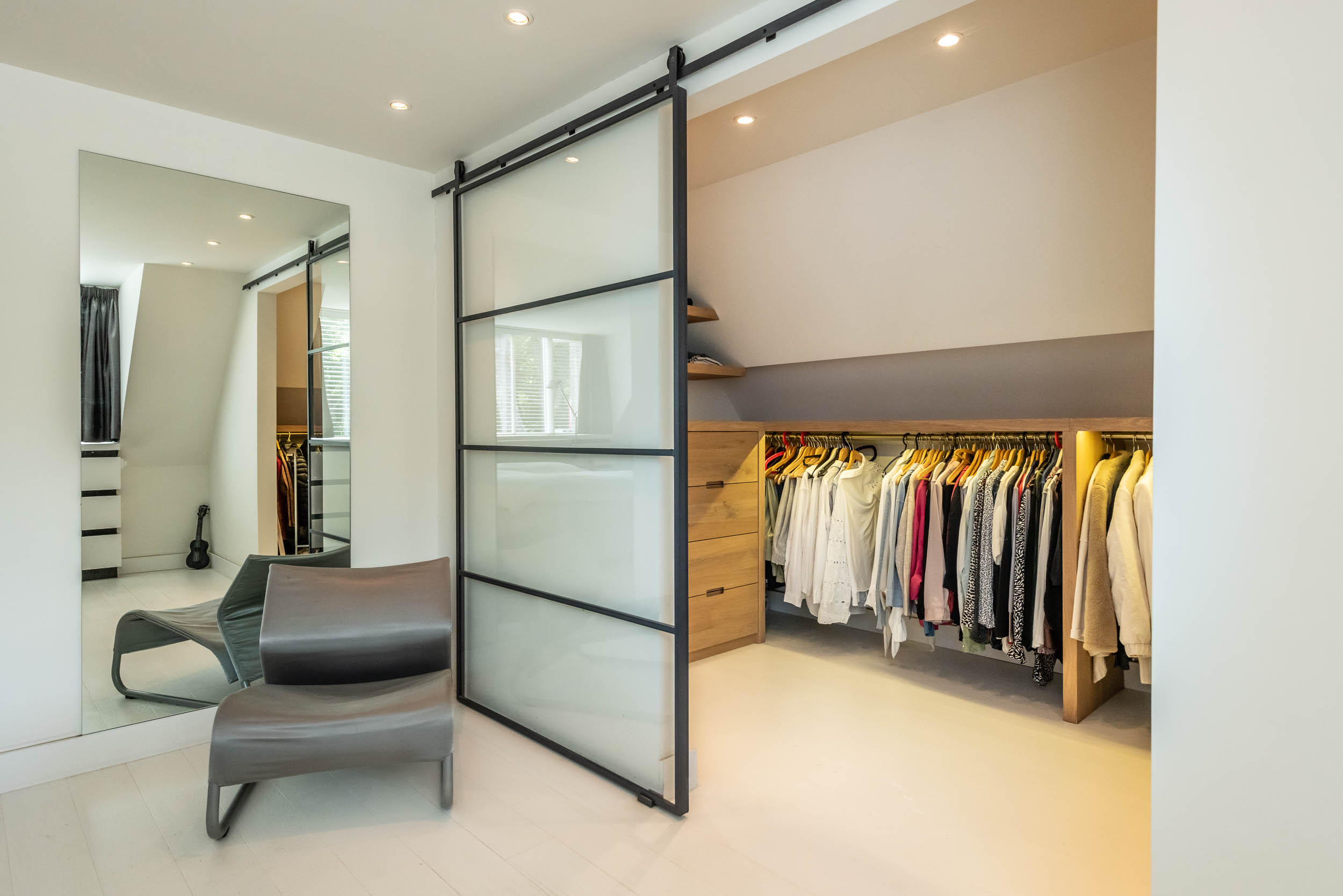 Landing, three bedrooms, including the spacious master bedroom (formerly two rooms) with walk-in wardrobes on both sides. Modern, tailor-made bathroom (’t Spant in Heemstede, 2022) with large dormer window, double washbasin unit, toilet, ample cupboard space, underfloor heating, freestanding bathtub, walk-in shower with Sunshower and hand shower.