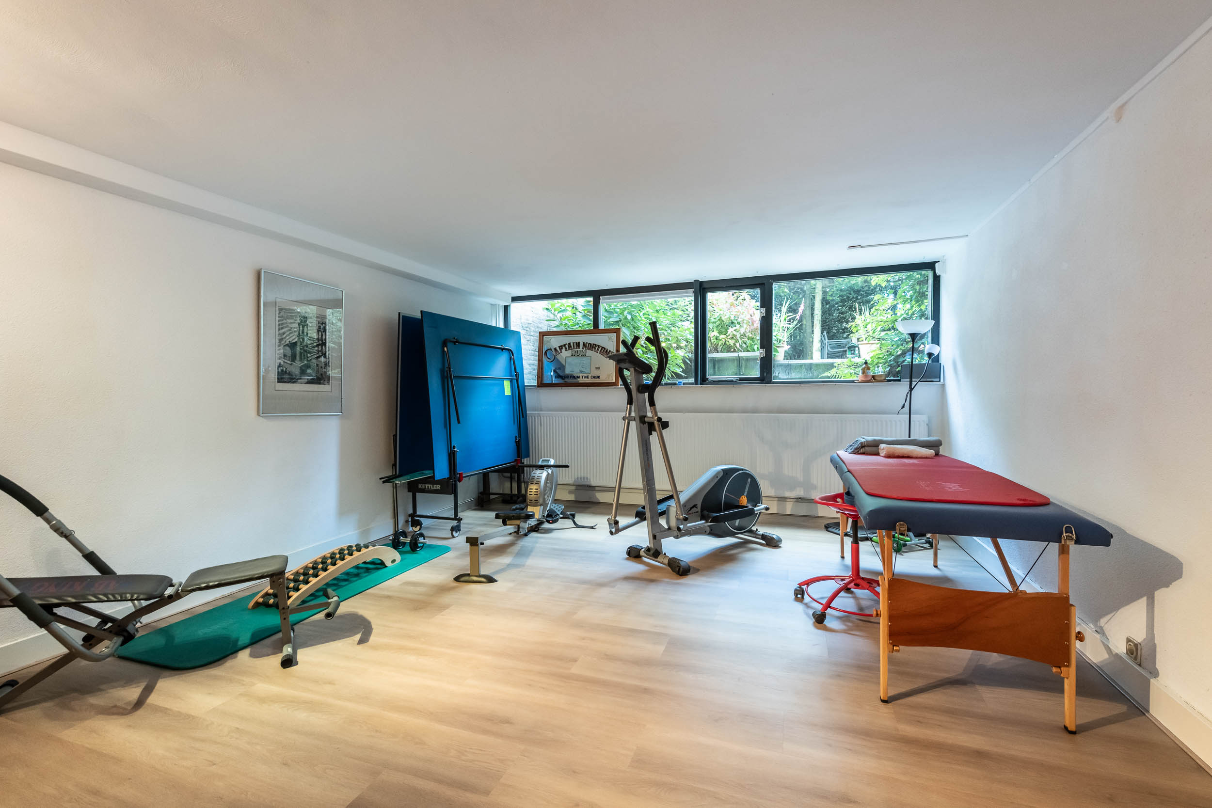The ground floor is particularly comfortable for families thanks to the multiple living areas and the spacious kitchen (from 2022). The numerous windows and glass doors make the rooms light and sunny. Both the living room and kitchen have French doors leading to the garden/terraces. The basement features an indoor garage, laundry room, gym, two spacious (bed)rooms and a bathroom.