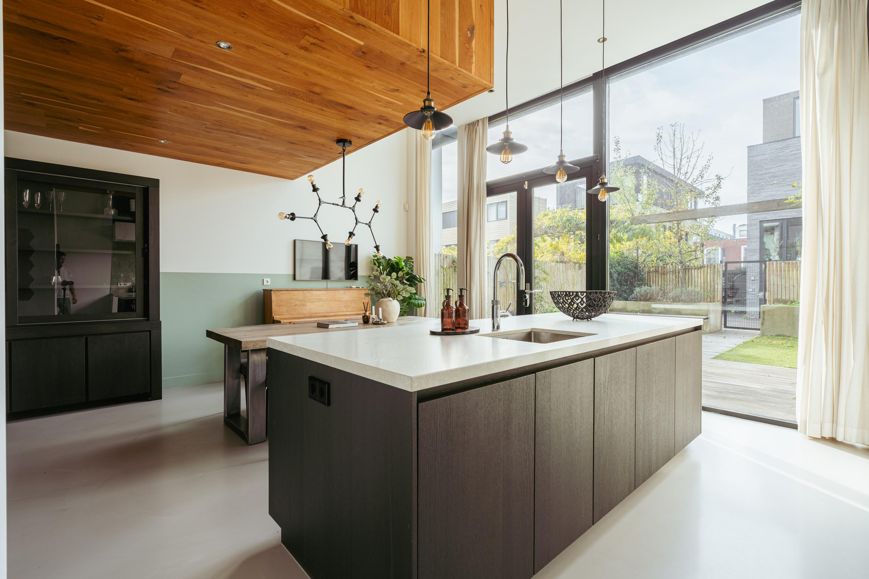 The custom-designed kitchen features a large cooking island with a composite worktop and premium built-in appliances, including a Quooker, induction cooktop, dishwasher, microwave, oven, and plate warmer. French doors open onto the beautifully landscaped, low-maintenance garden of approximately 54 m², with wooden decking, stone paving, and lush greenery. A private gate provides direct access to the back area with two private parking spaces equipped with an electric charging station.