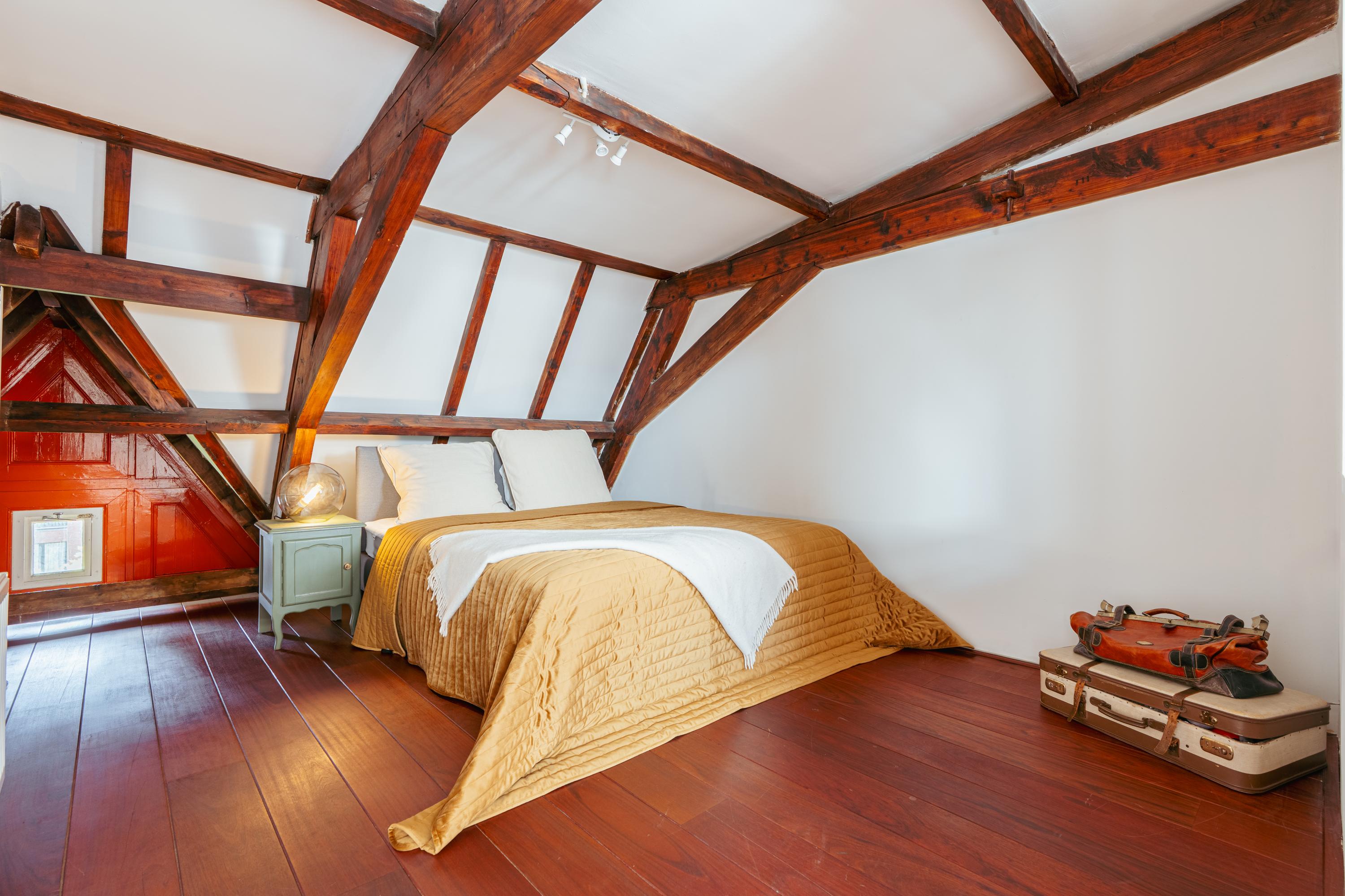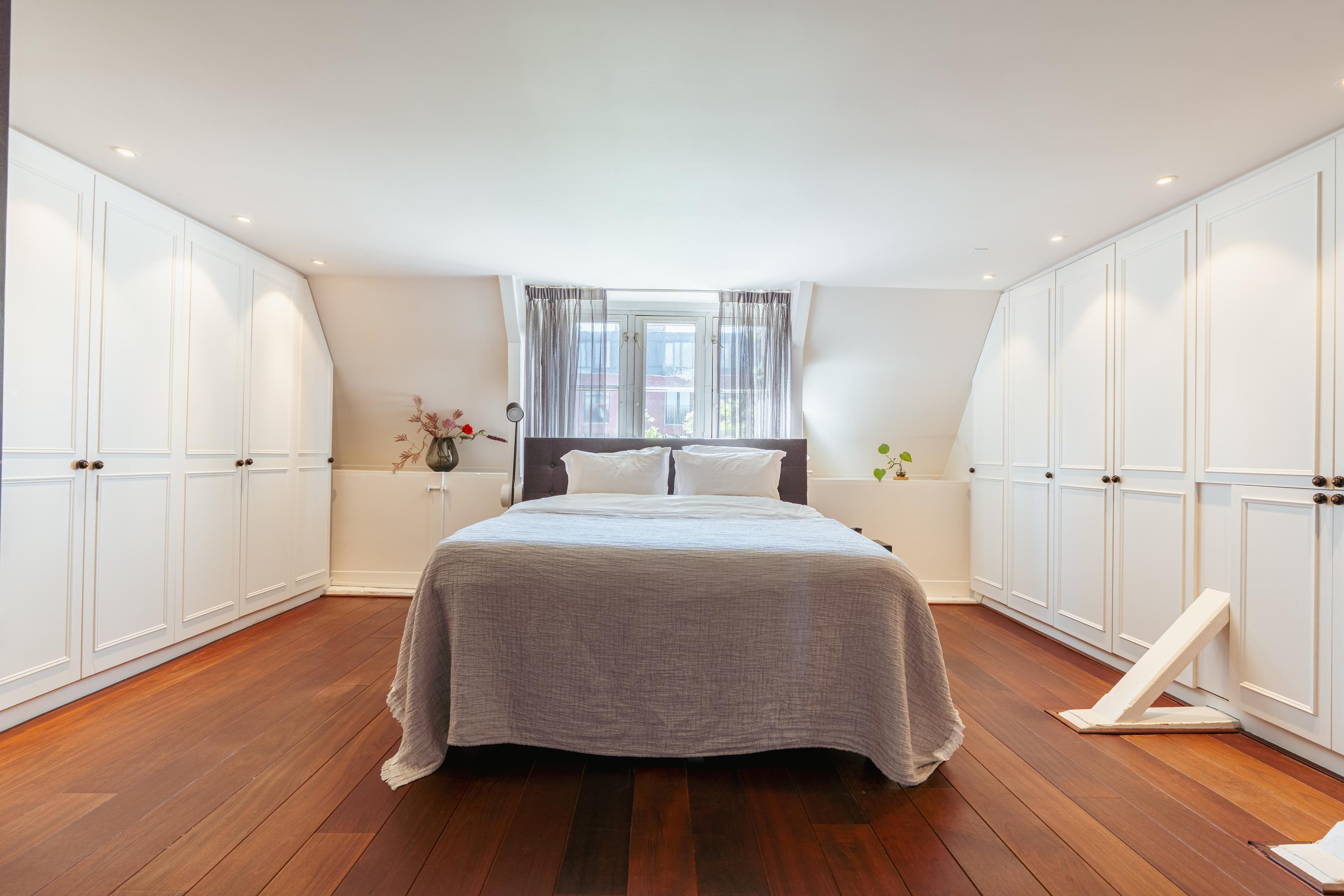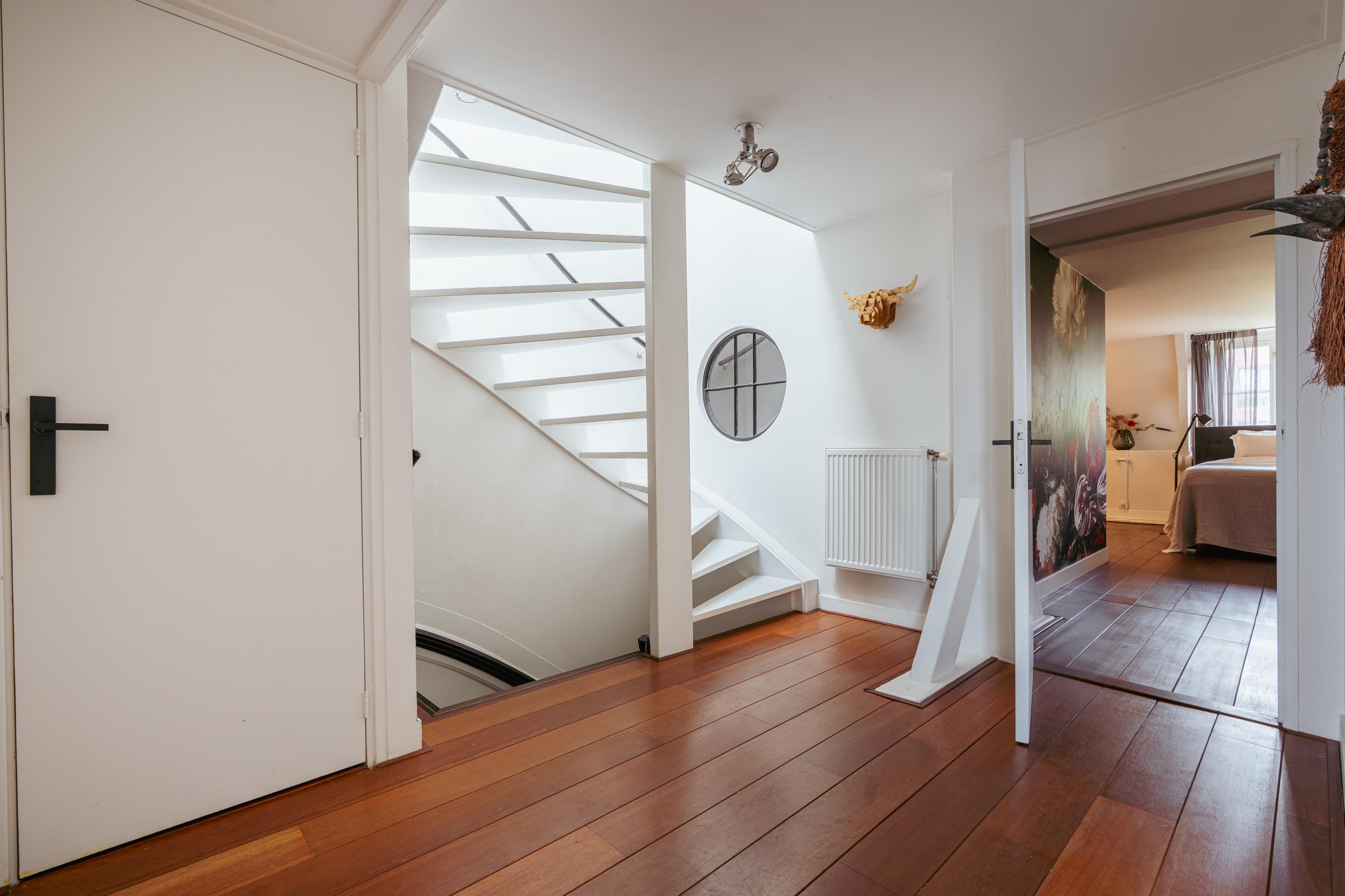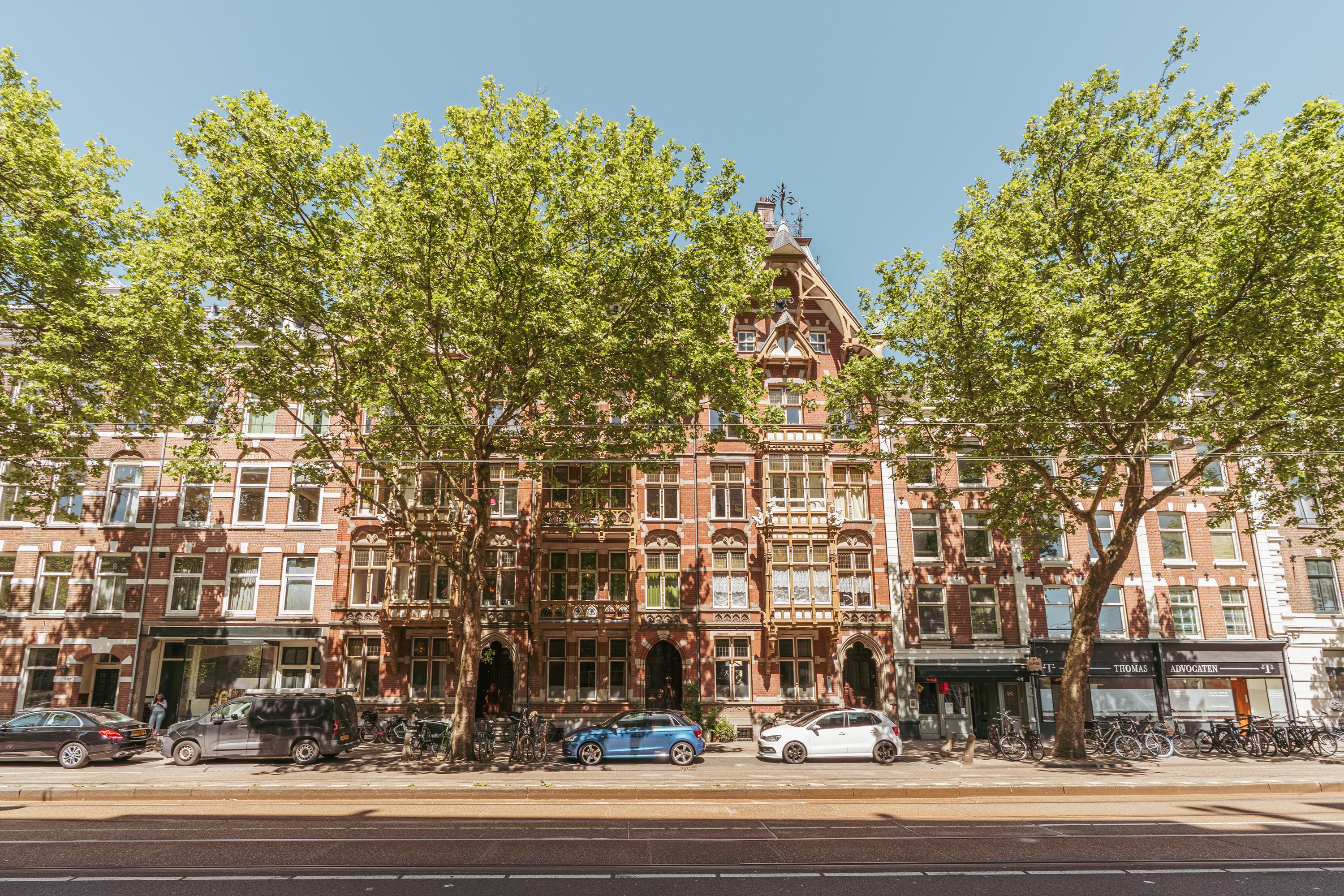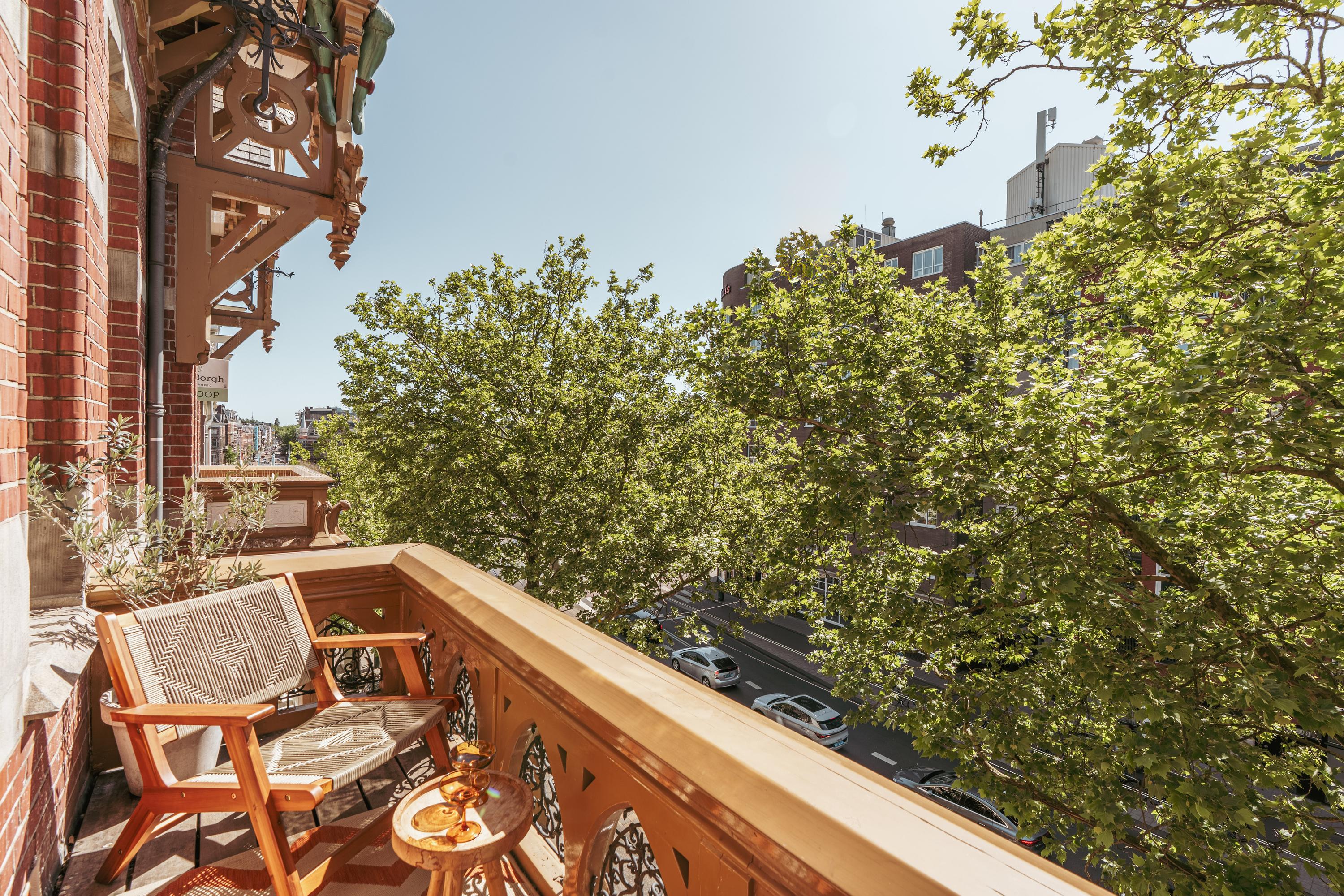 This level features a spacious landing with original exposed wooden beams—perfect as a music room, workspace, or gaming area. The fourth bedroom and a convenient storage room are located at the front. There’s also an additional washbasin on this floor. A staircase leads to the roof, where you can enjoy views of Carré Theatre and even the Rijksmuseum. This characteristic building, designed by architect A.C. Boerma, is constructed of brick accented with limestone blocks and bands. The facade boasts three elegant wooden bay windows adorned with authentic ornaments and fantasy figures. Throughout the home, you’ll find beautiful hardwood flooring, high ornamental ceilings, and original stained-glass transom windows. We invite you, like the current residents, to fall in love with this truly exceptional and spacious home.