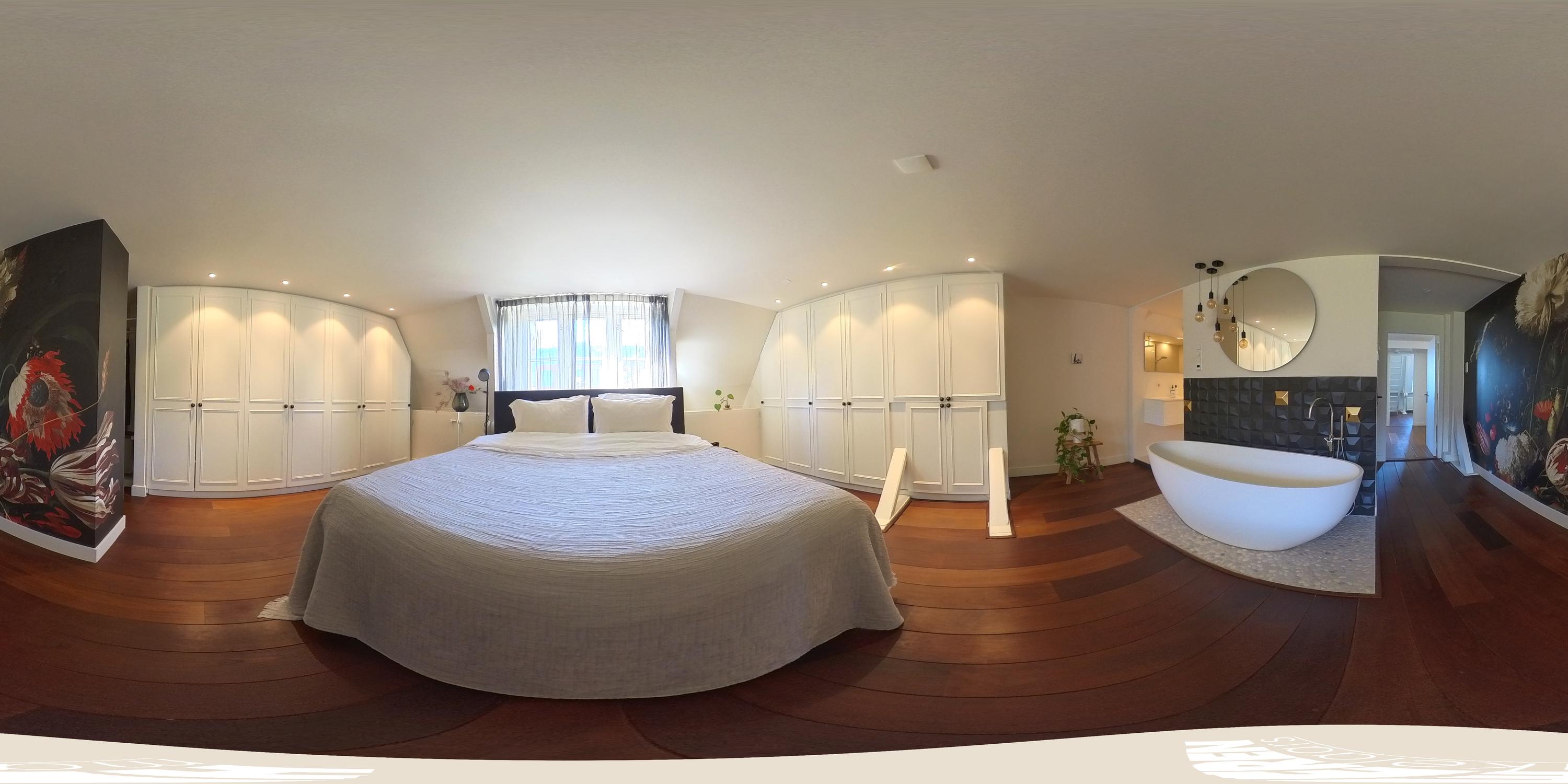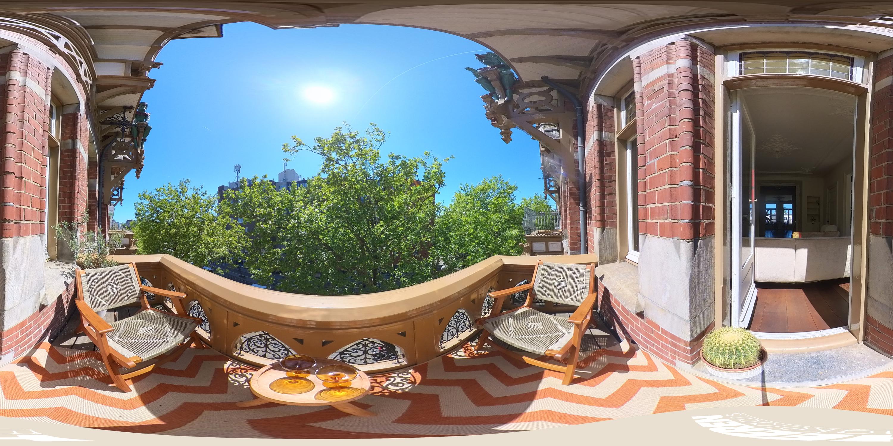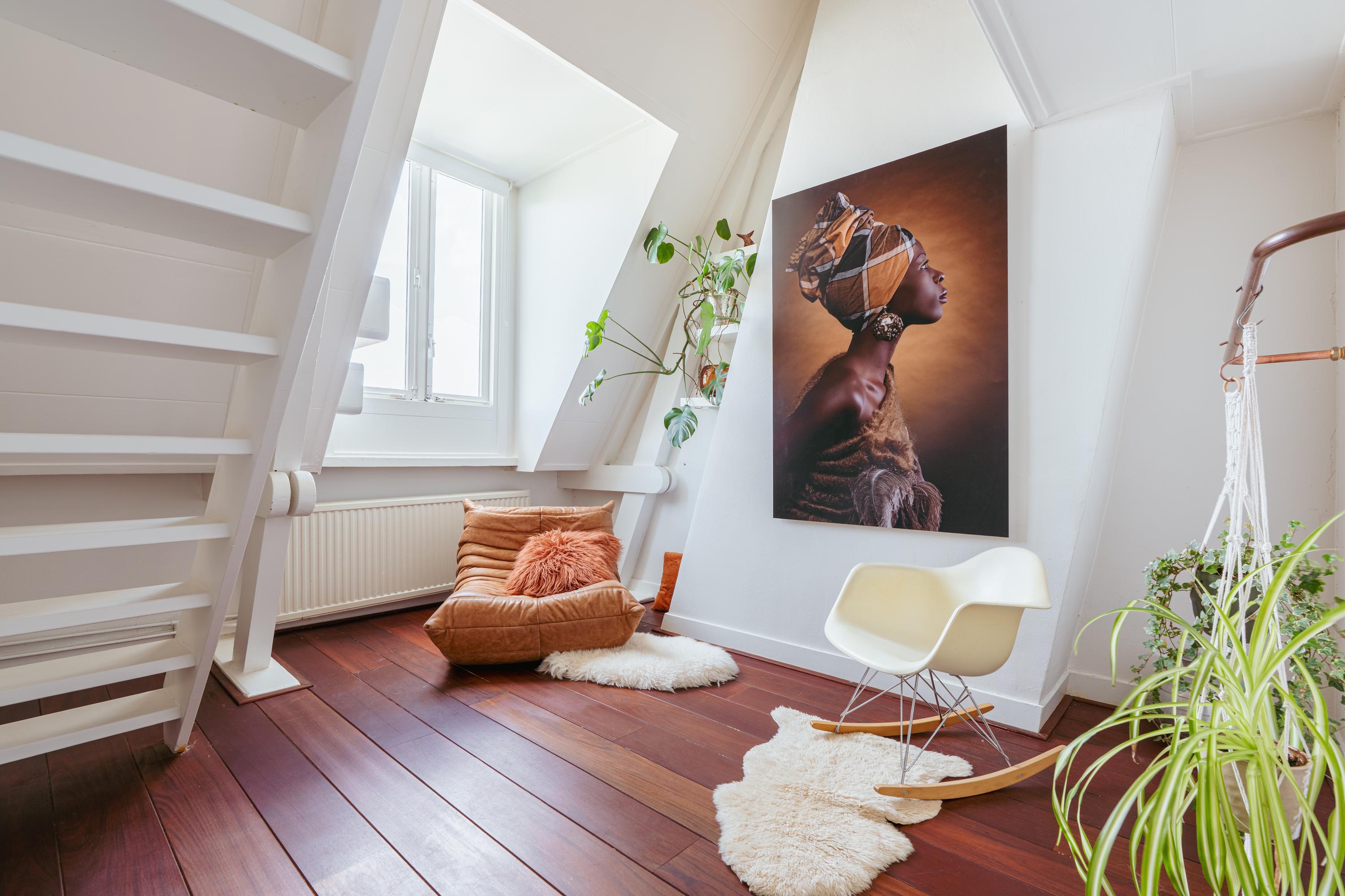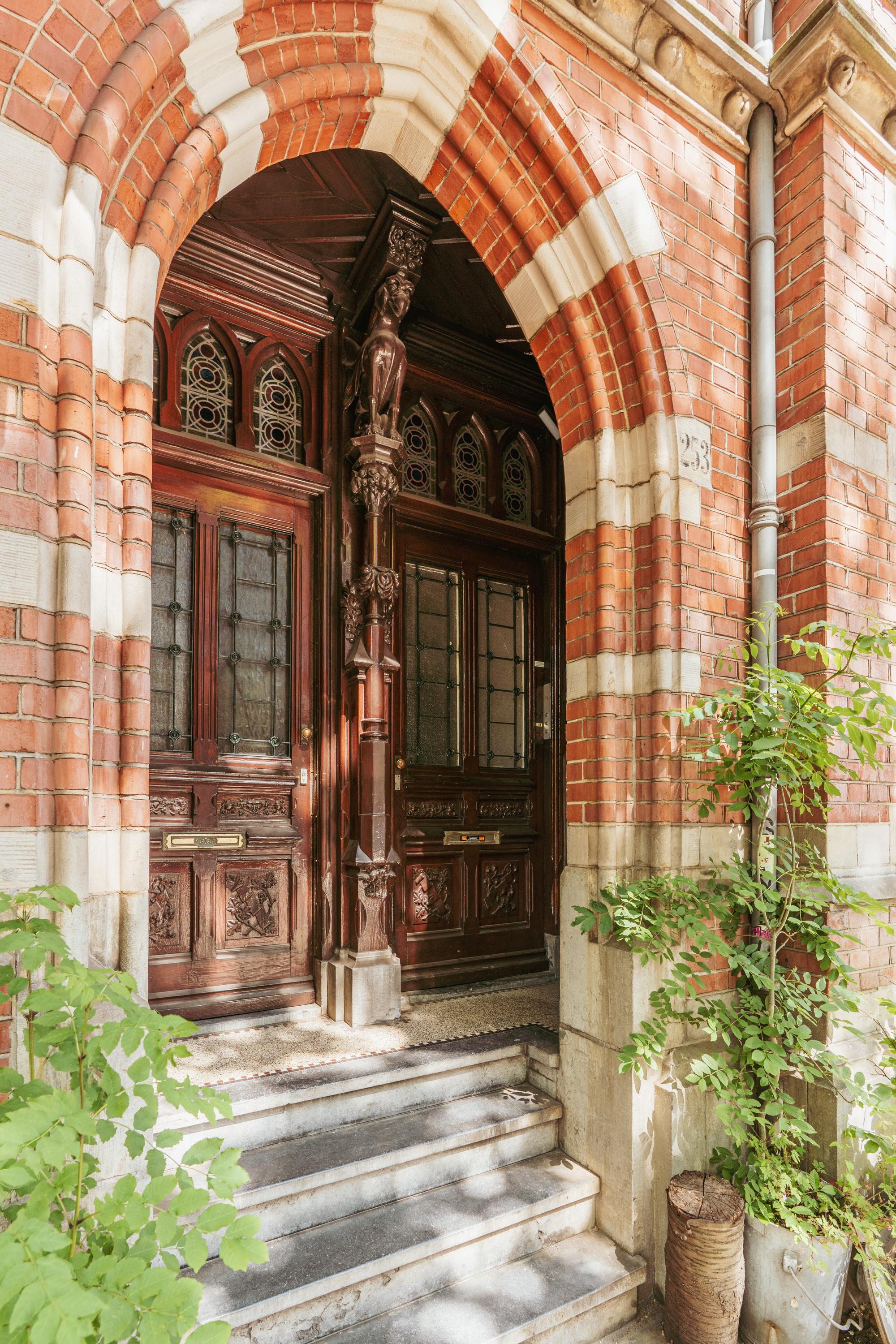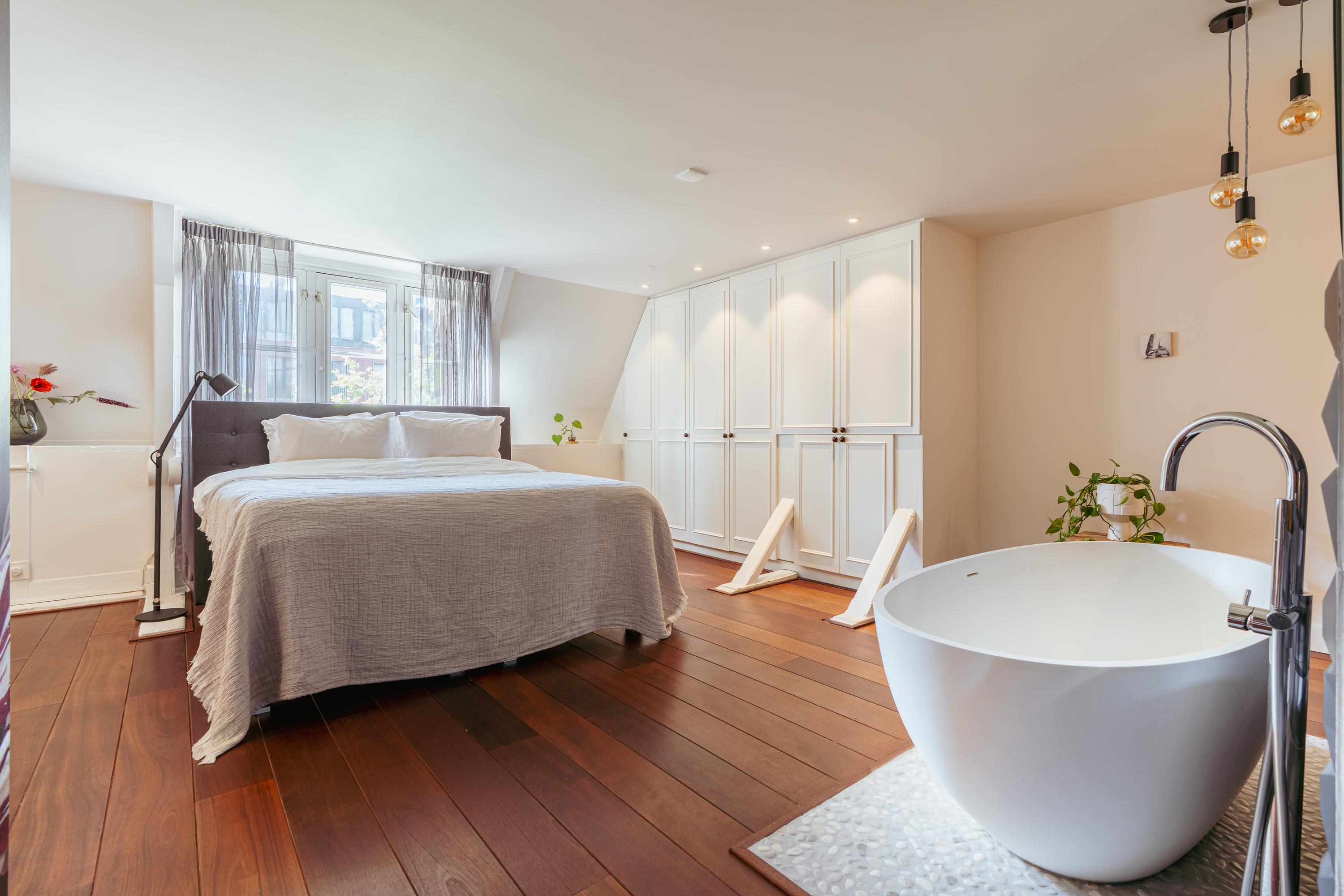 This level features a spacious landing with original exposed wooden beams—perfect as a music room, workspace, or gaming area. The fourth bedroom and a convenient storage room are located at the front. There’s also an additional washbasin on this floor. A staircase leads to the roof, where you can enjoy views of Carré Theatre and even the Rijksmuseum. This characteristic building, designed by architect A.C. Boerma, is constructed of brick accented with limestone blocks and bands. The facade boasts three elegant wooden bay windows adorned with authentic ornaments and fantasy figures. Throughout the home, you’ll find beautiful hardwood flooring, high ornamental ceilings, and original stained-glass transom windows. We invite you, like the current residents, to fall in love with this truly exceptional and spacious home.