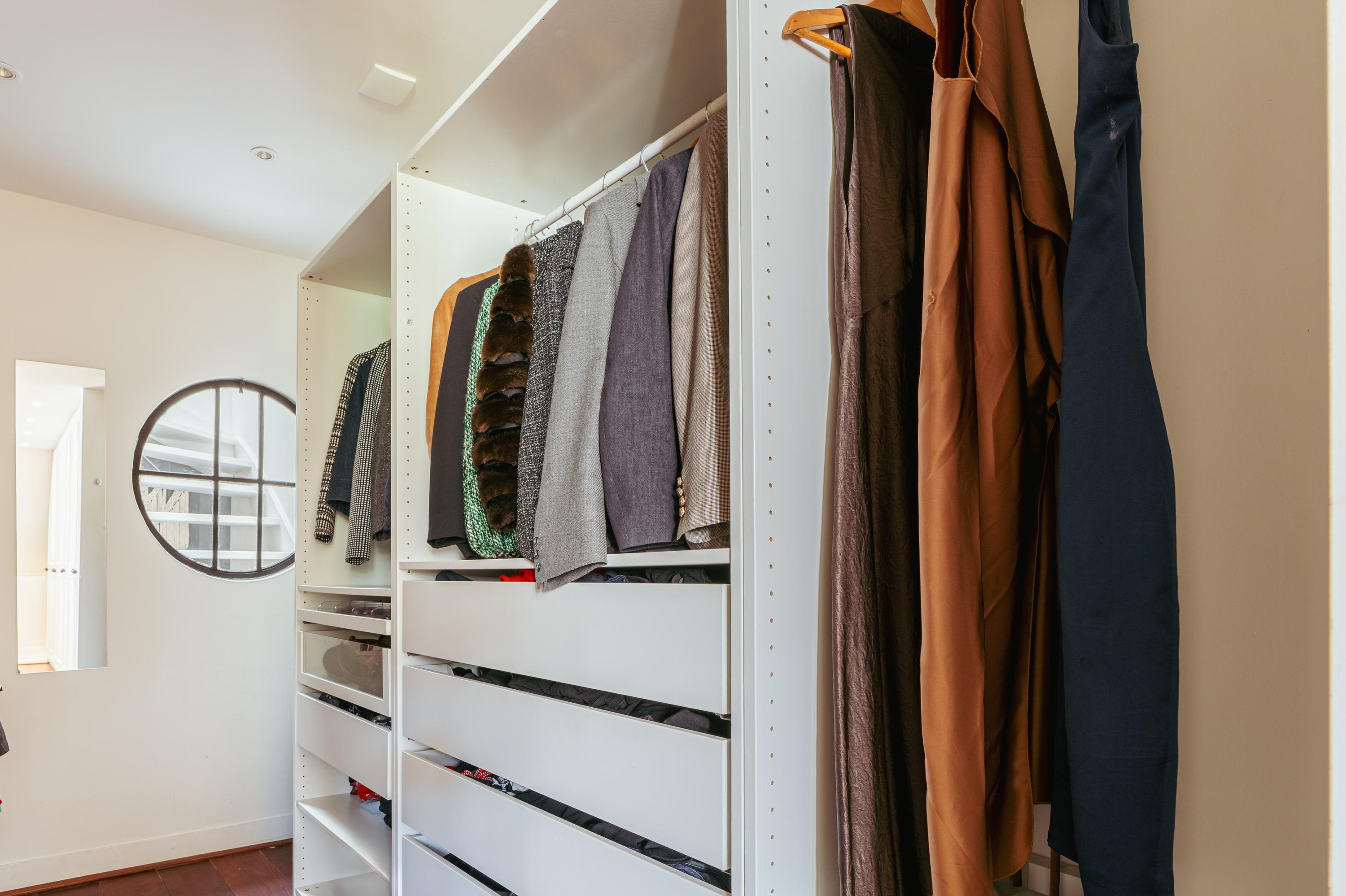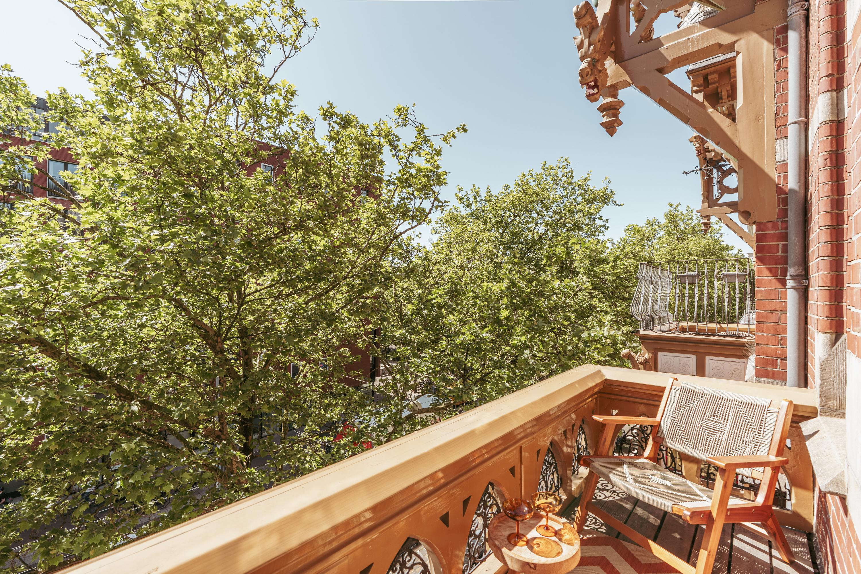 From the hallway—equipped with custom-made wardrobe cabinets—you enter the sunlit living room, complete with a wood-burning stove and an original natural stone mantelpiece. At the front of the home is a cozy study area and access to a wide, sunny south-facing balcony. Centrally located is a custom-built intermediate space with climate-controlled wine fridge, also ideal as a library or reading nook. This connects the living and dining areas via beautiful original sliding doors.