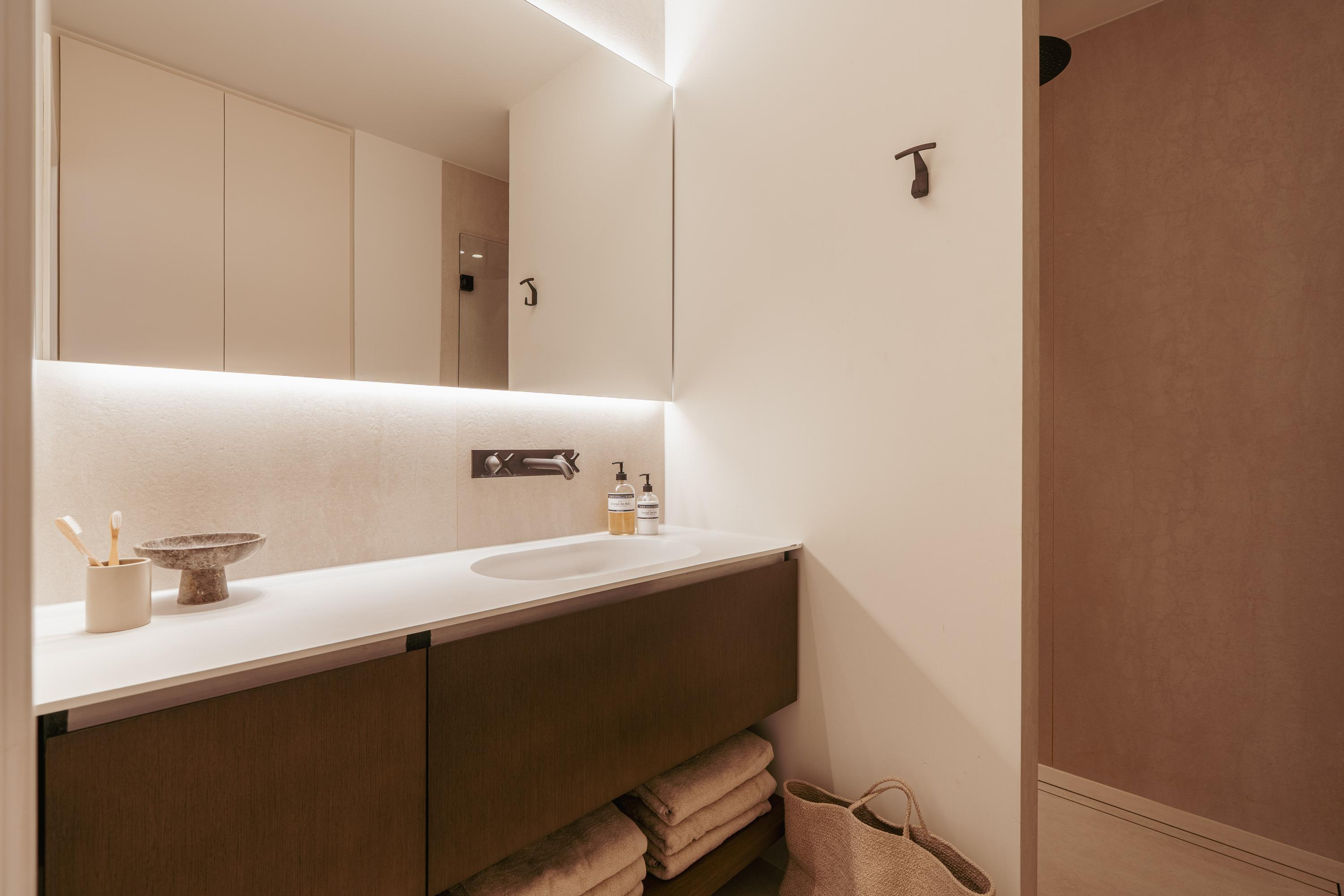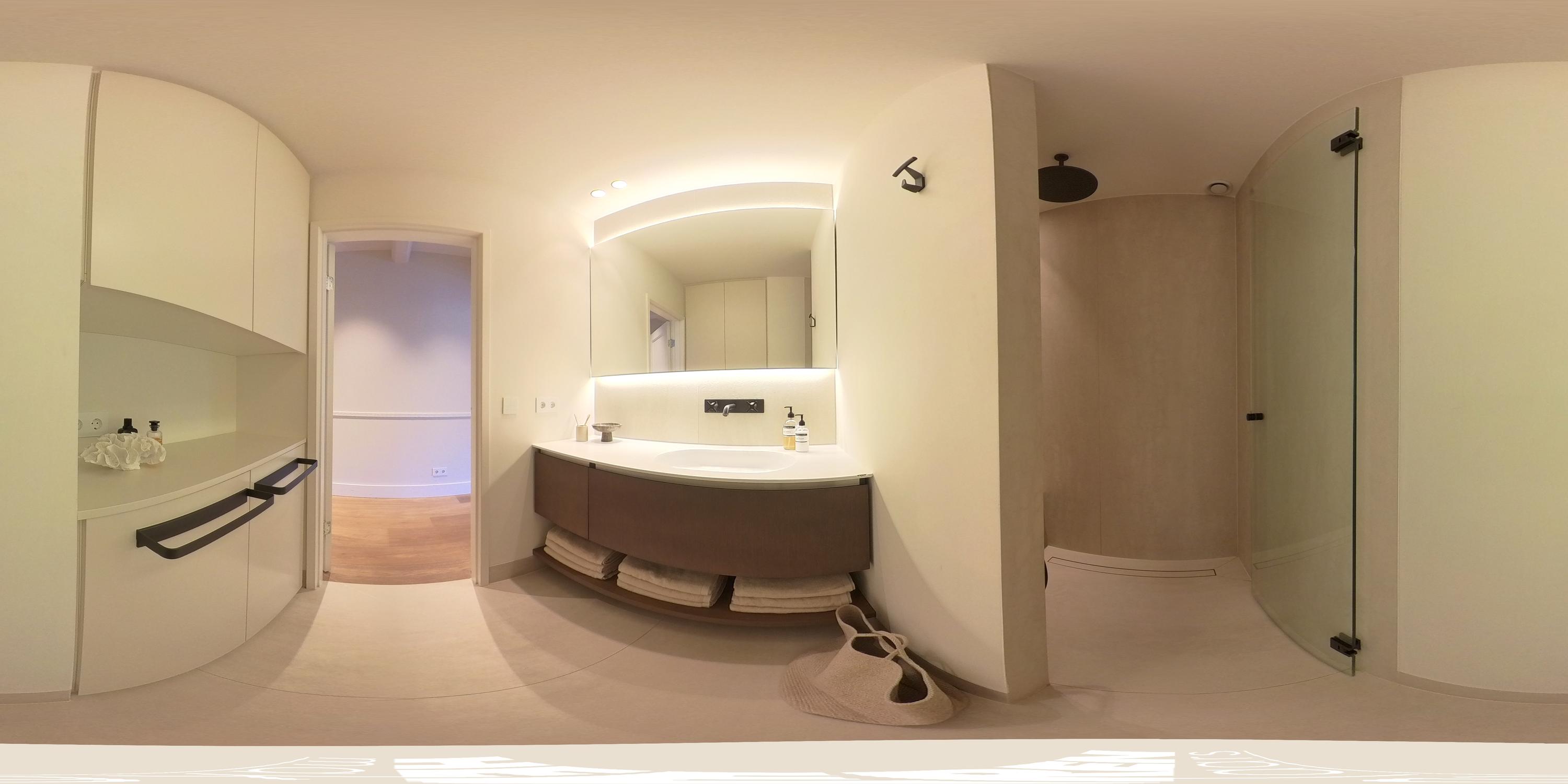 Aan de voorzijde bevindt zich daarnaast nog een ruime slaapkamer en een luxe badkamer voorzien van inloopdouche, wastafel met meubel en een separaat toilet met fontein.