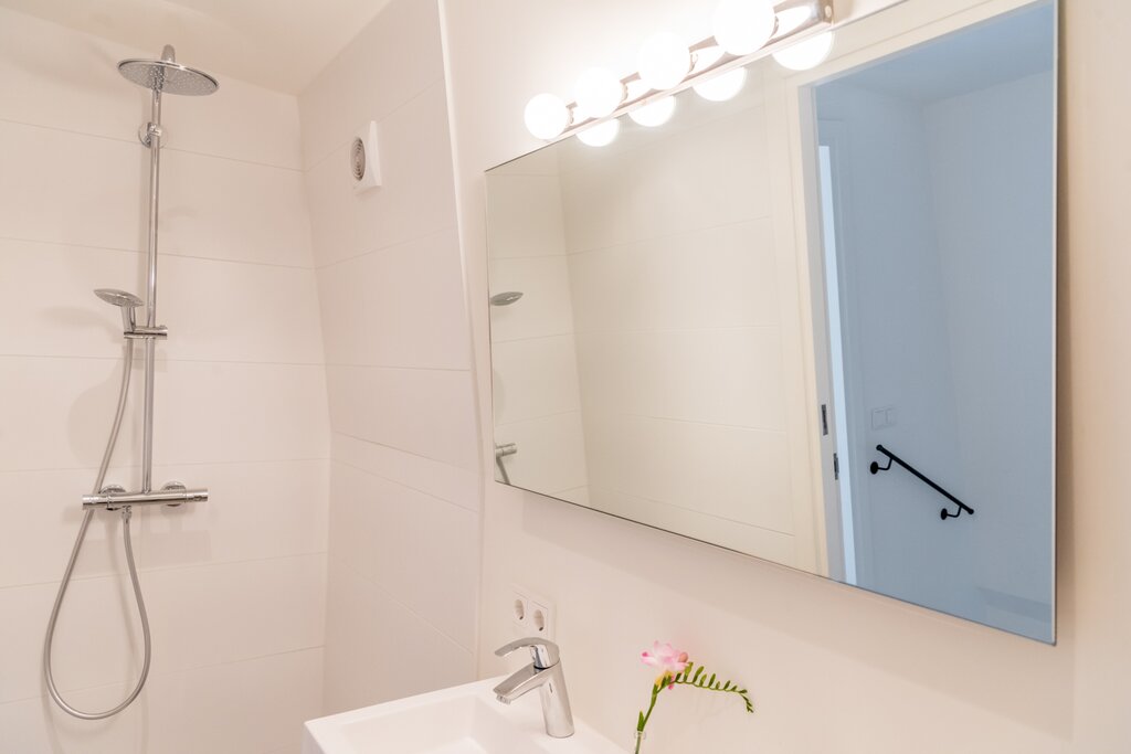 Overloop met toegang tot alle vertrekken. Aan de voorzijde bevindt zich de eerste slaapkamer met diverse ingebouwde kasten en voorzien van airconditioning. Aan de achterzijde is de masterbedroom gelegen en ook voorzien van airconditioning en met directe toegang tot het tweede terras. De centraal op deze verdieping gelegen badkamer is voorzien van een inloop rainshower, dubbele wastafel en toilet.