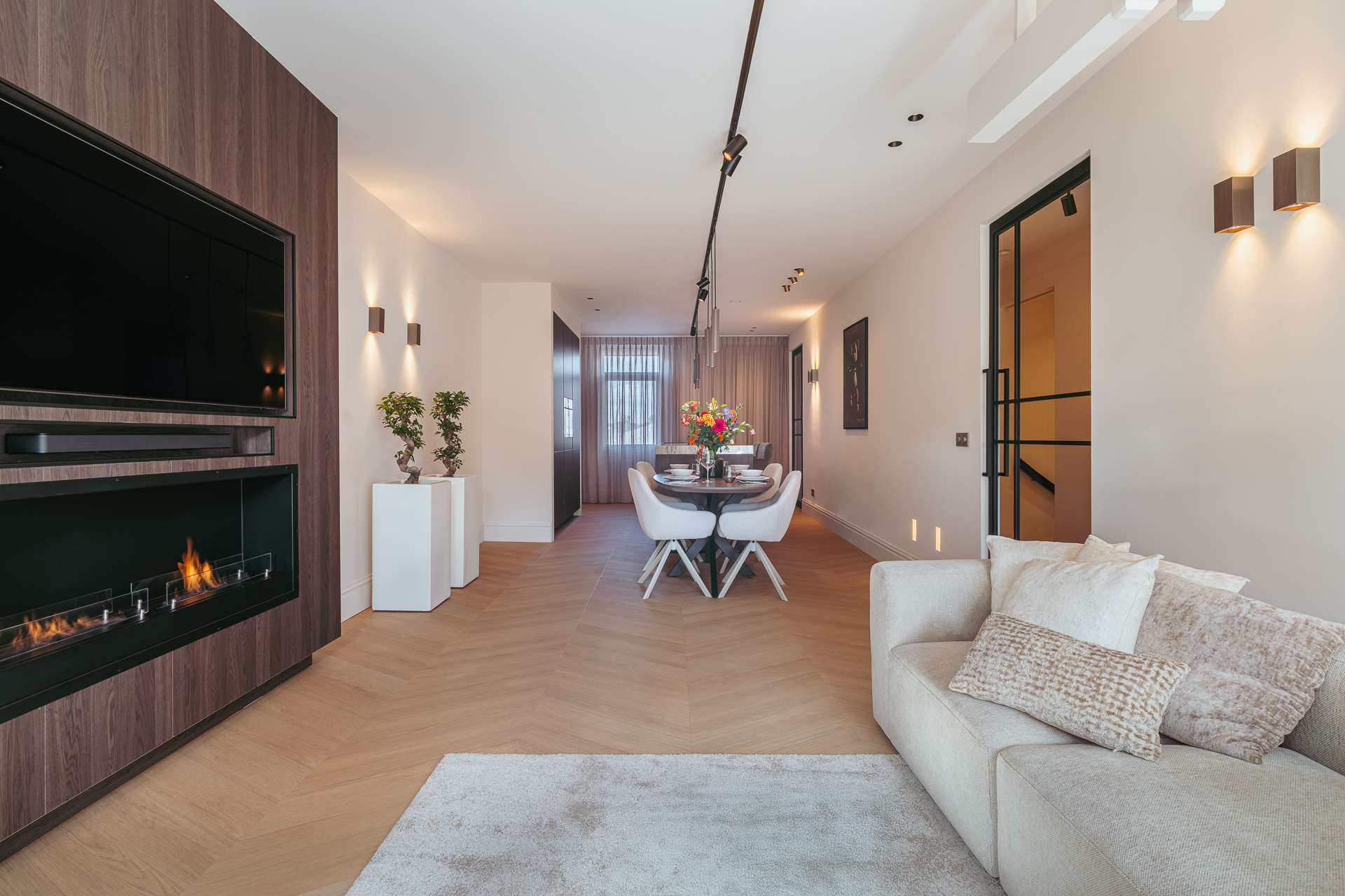 On the top floor, you enter through a sleek integrated sliding door into a beautiful, spacious hallway that provides access to all rooms. The heart of the home is the open-plan living and dining area, which spans the entire length of the apartment. With windows on both sides, the space is flooded with natural light. At the front is the sitting area, complete with a cozy bio-ethanol fireplace stylishly integrated into a built-in cabinet with TV. At the rear lies the modern open kitchen with a cooking island. Finished with a Dekton countertop, the kitchen is equipped with every luxury appliance imaginable, including a wine cooler, Quooker tap, dishwasher, fridge/freezer, Miele combi-oven, and a Miele induction hob with integrated extraction system. The bar section of the island also makes this a sociable spot to cook together or enjoy a glass of wine with family and friends.
