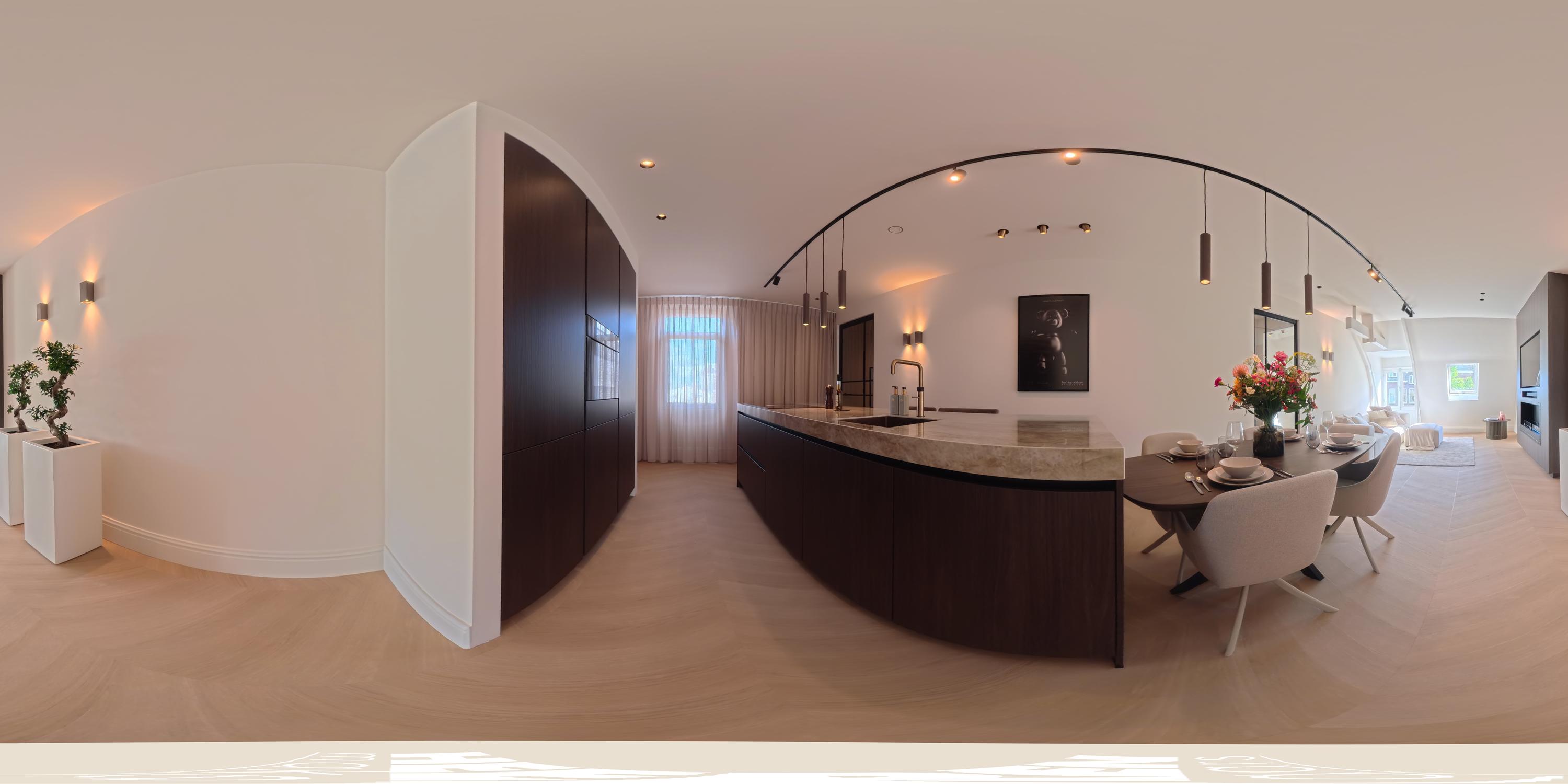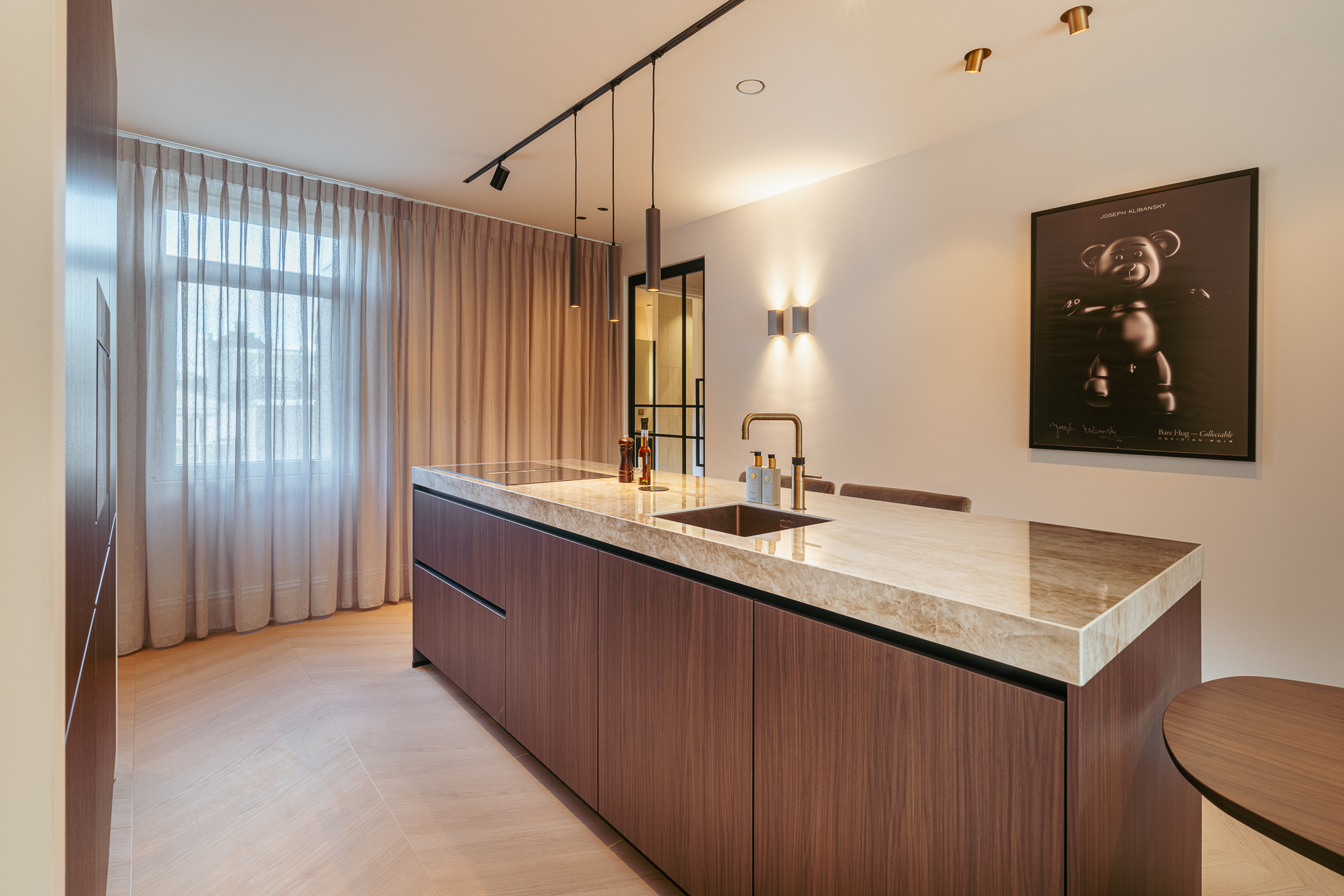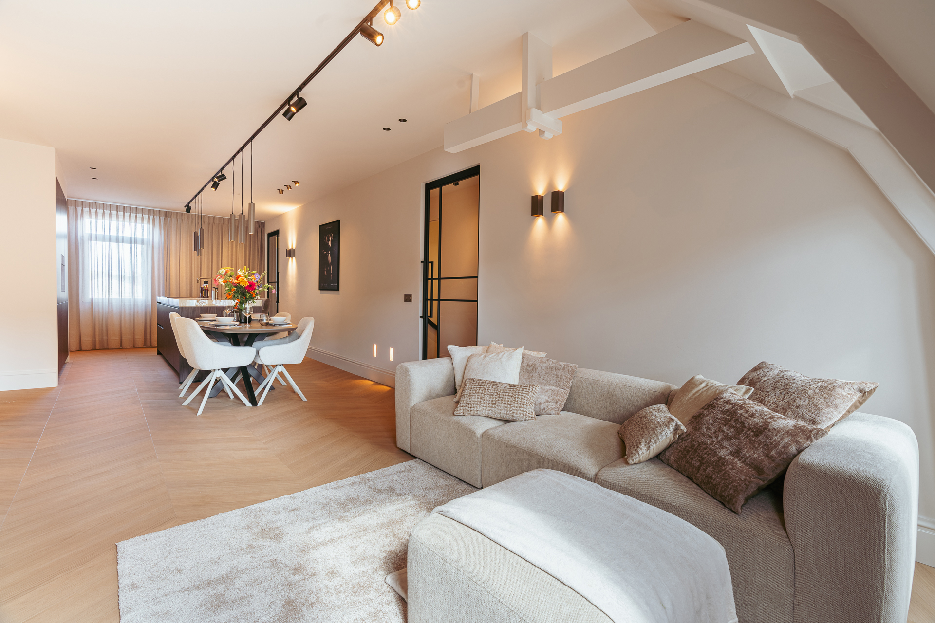 Via the communal staircase, you reach the entrance to the property on the third floor. From your private entrance, a neatly renovated staircase leads up to the apartment on the fourth floor. Upon entering, you immediately notice the warm and stylish ambiance, thanks to carefully chosen materials, atmospheric lighting, and impeccable finishes. The apartment has been renovated to a high and luxurious standard, with great attention to detail. Modern black steel doors combined with classic elements give the home a contemporary yet timeless feel, something that runs consistently throughout the property.
