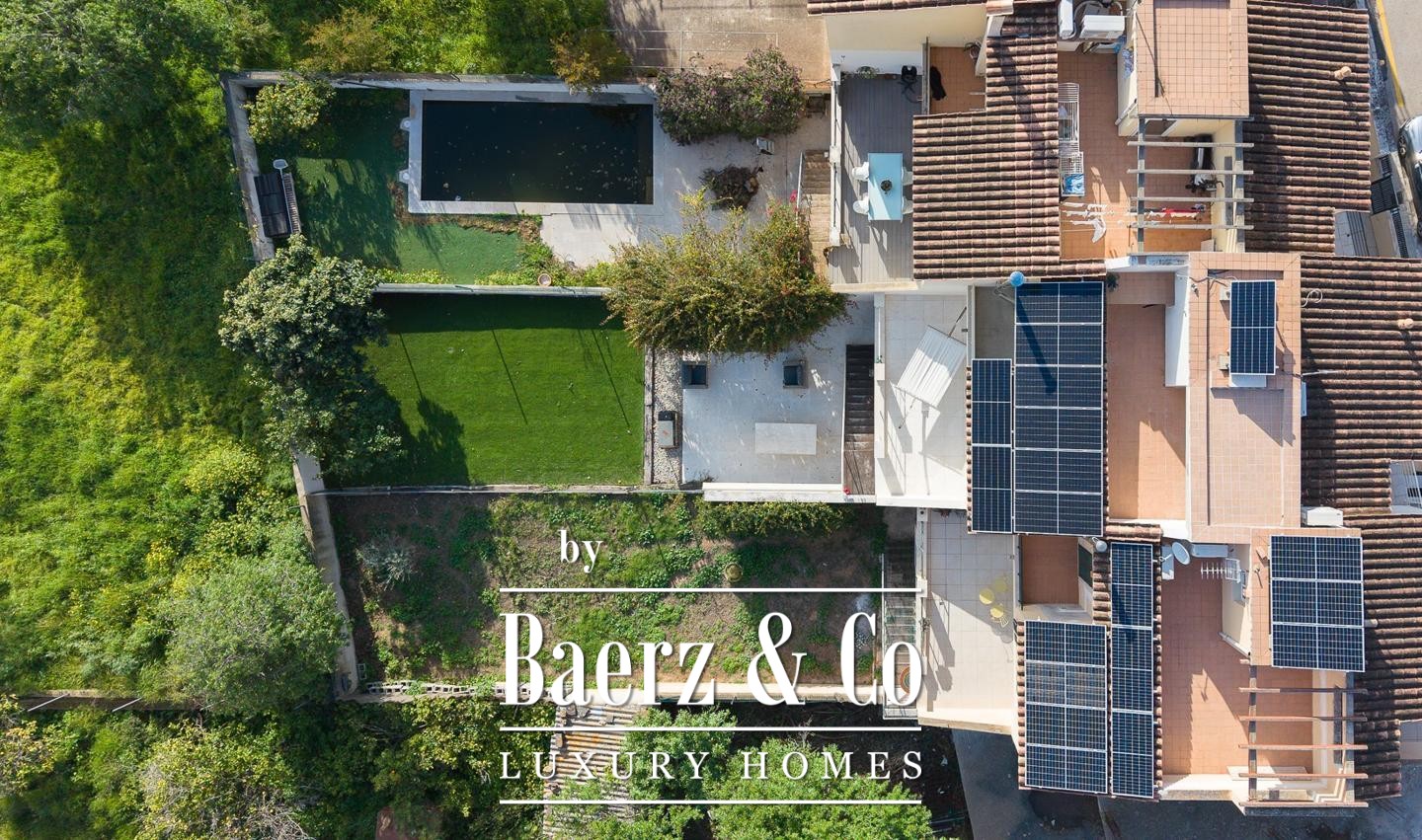 A main terrace frames gentle green views and glimpses of the Puerto de Andratx, while the rooftop terrace with photovoltaic system underscores a commitment to modern efficiency. The spacious underground garage includes a gym area, bathroom, and electric vehicle charging point. Ample garden space offers opportunity for further personalization.