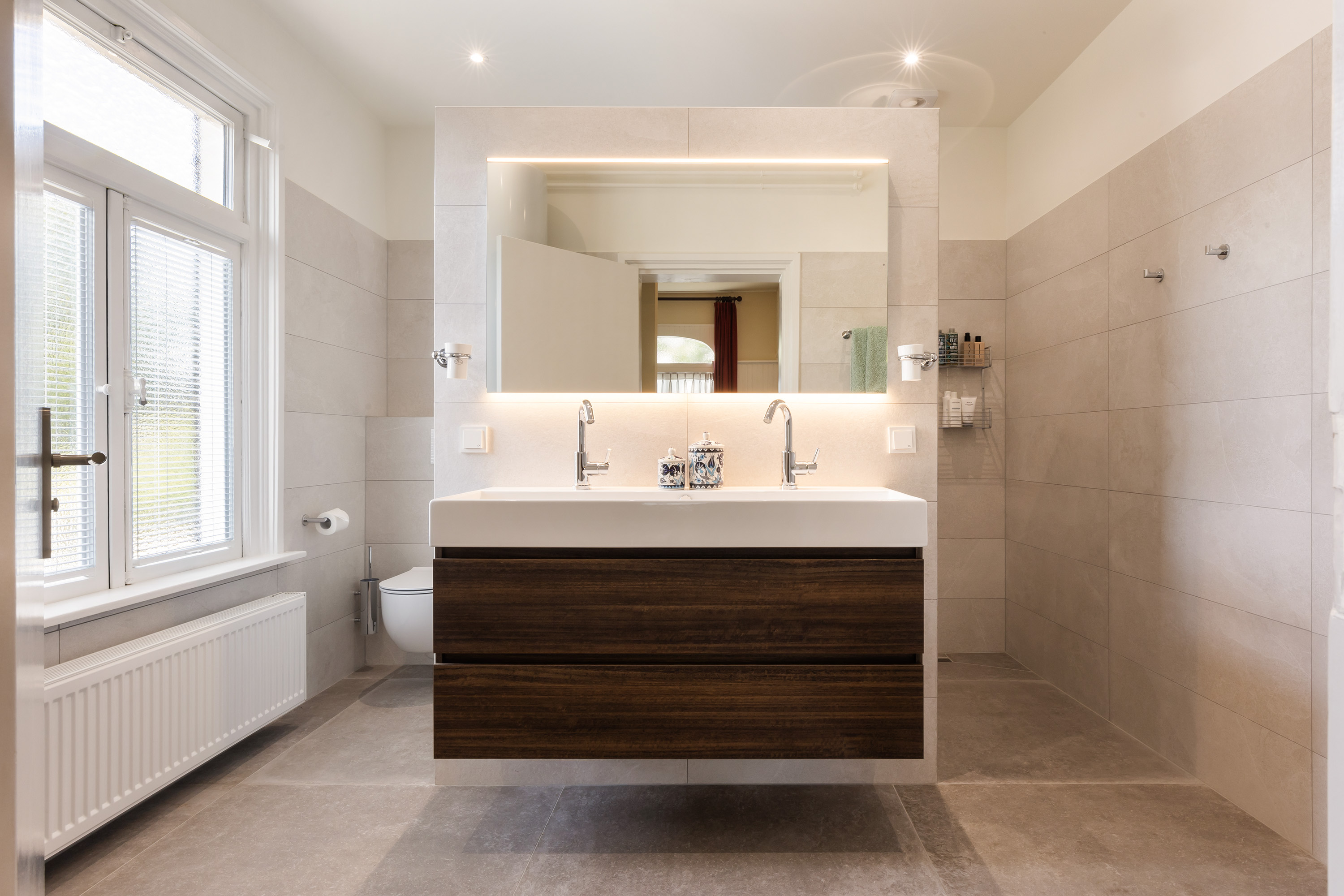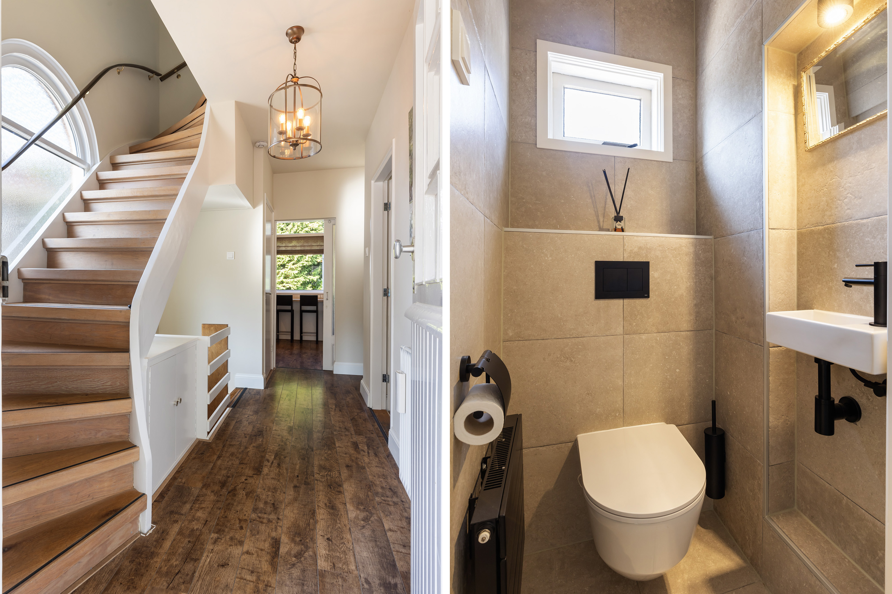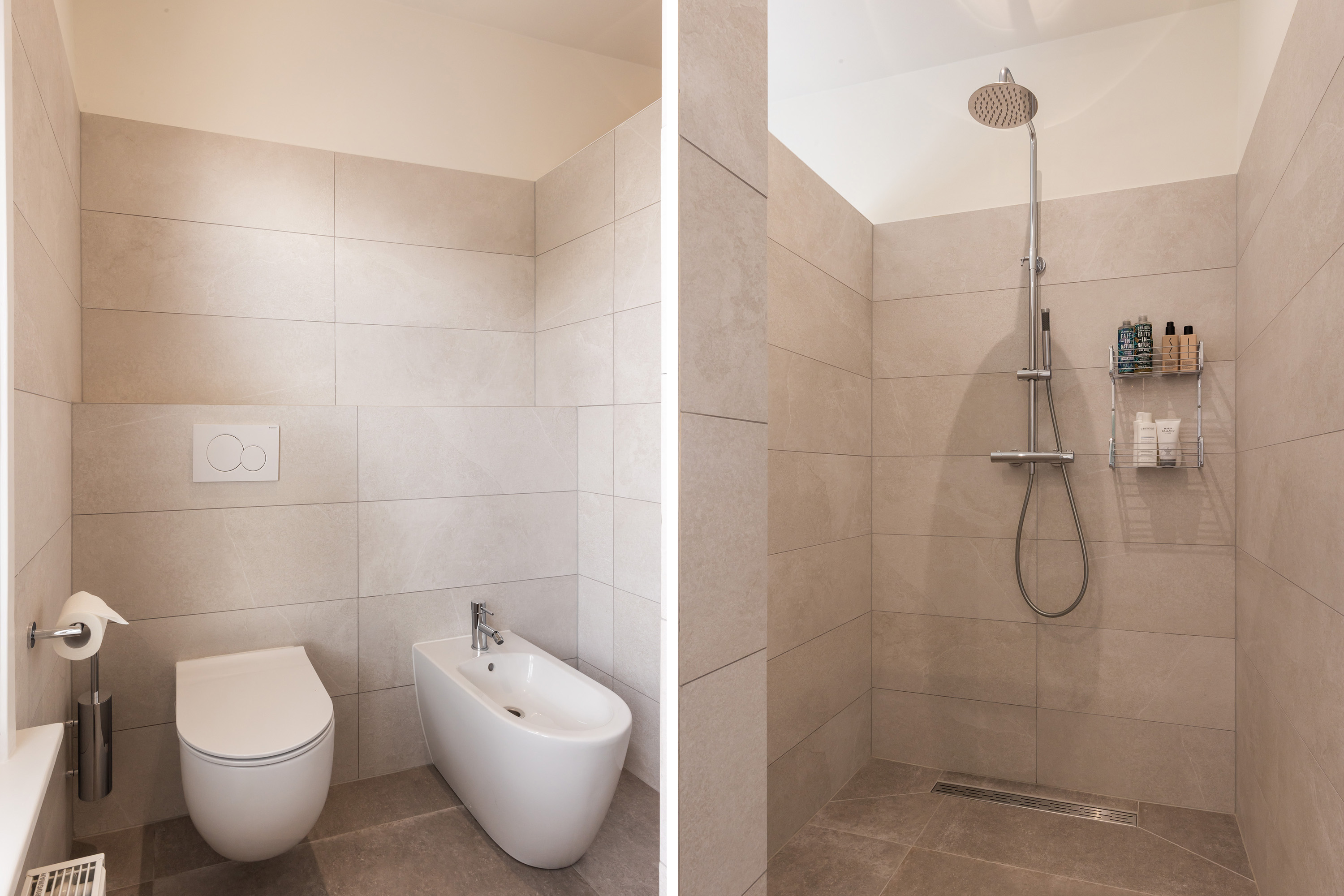 The newly refurbished bathroom includes a walk-in shower, double washbasin with illuminated mirror cabinet, wall-hung toilet and bidet. A separate third toilet is located on the landing.