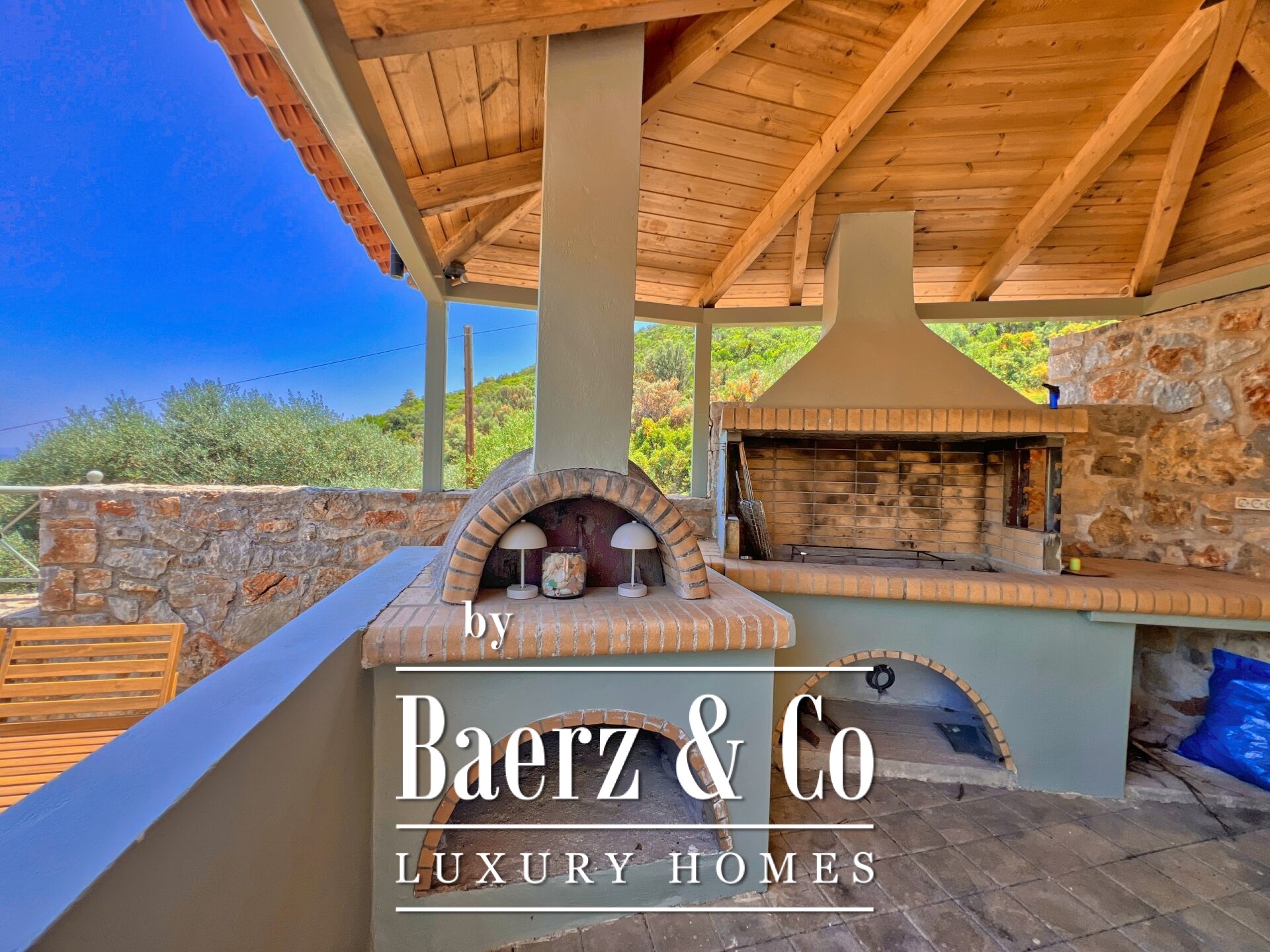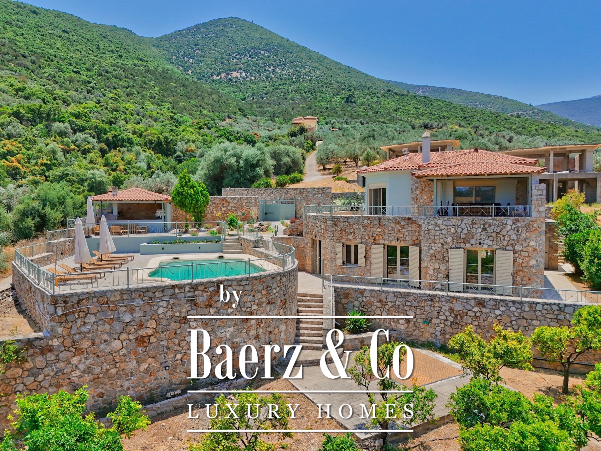 In a peaceful and lush location near Ancient Epidaurus, surrounded by olive groves and close to beaches and the historic ancient theater, a luxurious stone villa is for sale.