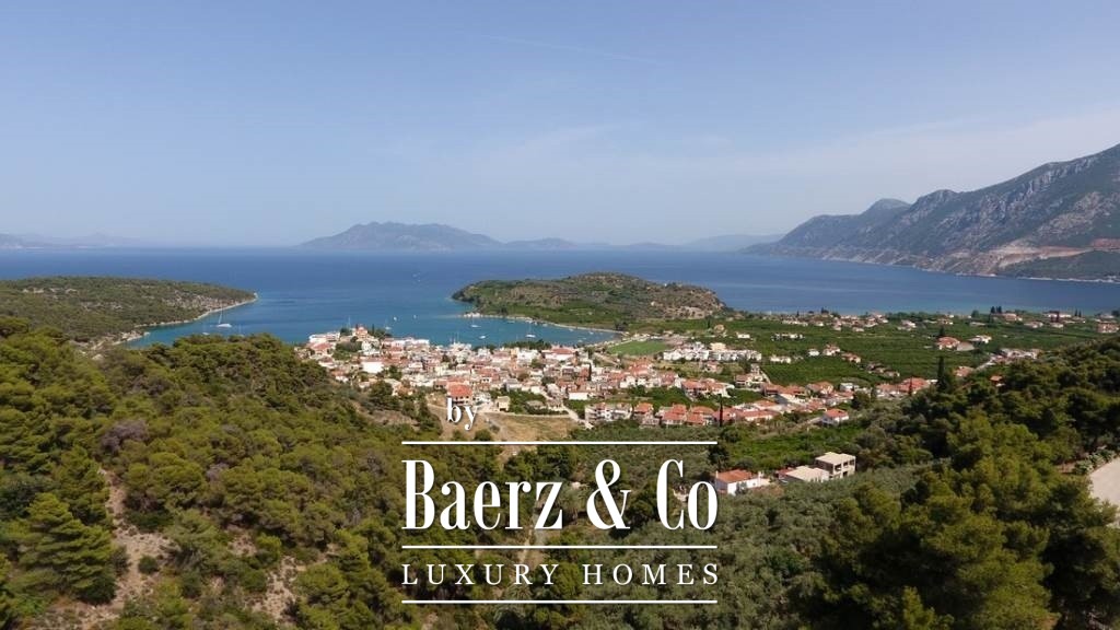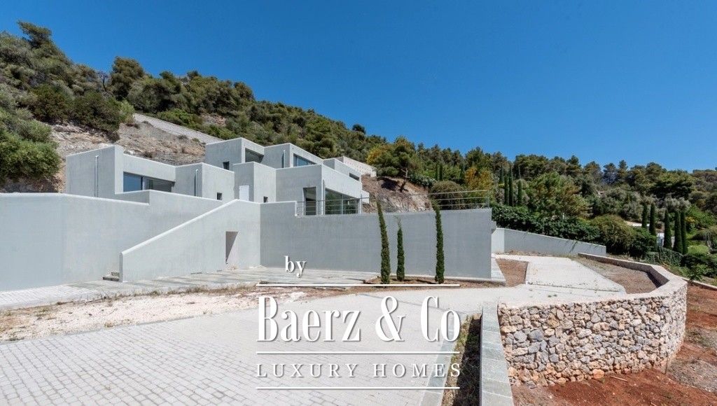 In the lush, pine-covered area of Epidaurus, on a privileged mountain slope, a luxurious villa of 568 sq m, of unique architecture, is offered for sale, offering panoramic and unobstructed views of the sea and the entire Ancient Epidaurus. The residence is built on a plot of 6,447 sq m, outside the plan, offering exclusive entrance, absolute privacy and a sense of harmony with the natural environment. The first level hosts an autonomous apartment with a kitchen, bathroom, one bedroom and three storage spaces. On the second level one finds an open-plan living room and kitchen area, a wc, a bedroom with a private dressing room and bathroom, while direct access to the outdoor pool and the impressive 230 sq m. terrace create the ideal atmosphere