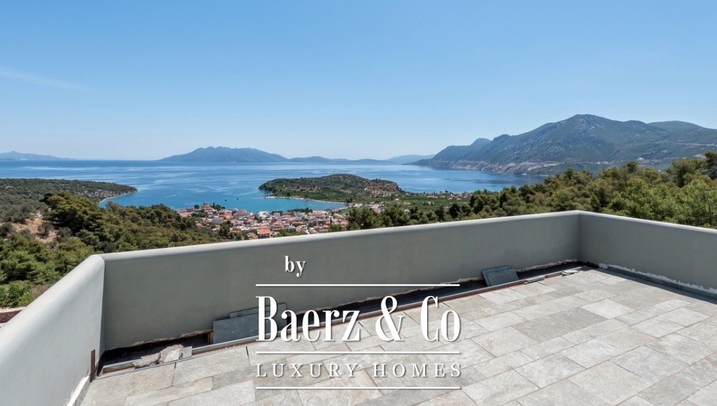 for relaxation and hospitality. The third level includes two spacious bedrooms, each with its own bathroom, as well as a 35 sq m terrace. with a magnificent view. The construction stands out for its marble floors made of Karystos stone, underfloor heating, central air conditioning, bulletproof double glazing, elevator, fireplace and private closed parking space. The outdoor area, fenced around, features an 84 sq.m. swimming pool with a waterfall-type overflow system, barbeque and drilling with a water tank, creating a fully autonomous and luxurious living environment. The distance from Athens is only 125 km, making it the ideal choice for a high-standard holiday home, in a place with rich history, natural beauty and rare tranquility.
