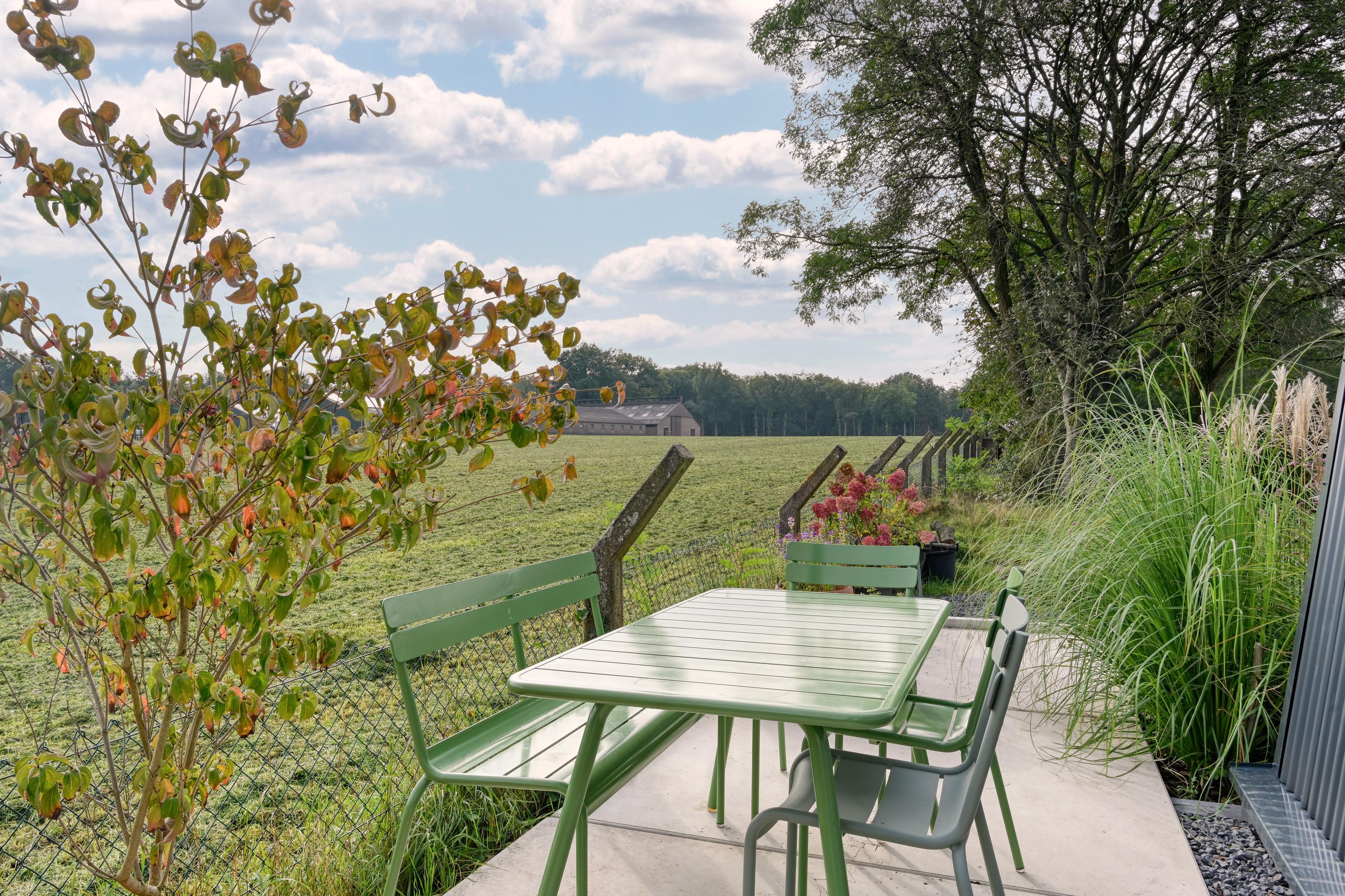 Entree, ruime hal met zicht op de vide. Deze ruimte is met het biljart in gebruik als hobbyruimte met terrasdeuren die geheel opengeschoven kunnen worden naar het terras. Dubbele stalen deuren bieden toegang tot de woonkeuken als ‘het kloppend hart’ van het huis. Het modern vormgegeven kookeiland met marmeren aanrecht staat centraal in de ruimte. Zodra de terrasdeuren over de gehele breedte zijn geopend is heerlijk om in de ochtend te genieten van de ochtendzon en het buitenleven met vrij zicht over een open veld. In combinatie met de groene kleurstelling van de keuken en de muur die tot aan het plafond is getegeld met Marrokkaanse tegeltjes is een geraffineerde mix van luxe materialen en sfeer ontstaan. Uiteraard is de keuken voorzien van de benodigde inbouwapparatuur. Een grote berging/bijkeuken doet dienst als provisieruimte en was- en linnenruimte. Een houten trap brengt u naar de woonkamer met ramen en deuren naar de vloer met vrij uitzicht over de natuur aan de zuidzijde van het huis. Een trap brengt u een niveau lager naar een gang met kledingkasten waaraan de slaapvertrekken en de badkamer zijn gesitueerd. 3 Ruime slaapkamers zijn voorzien van terrasdeuren naar het naastgelegen terras. Een luxe badkamer is gerealiseerd met ligbad, douche, toilet en een wastafel voor 2 personen. Een trap brengt u naar de 4e slaapkamer aan de zuidzijde van het huis. Deze kamer is voorzien van een wastafel. Omdat overal de ramen en deuren van glas tot de vloer doorlopen staat u in direct contact met de natuur. Vanuit de keuken is een vaste trap naar de vide.