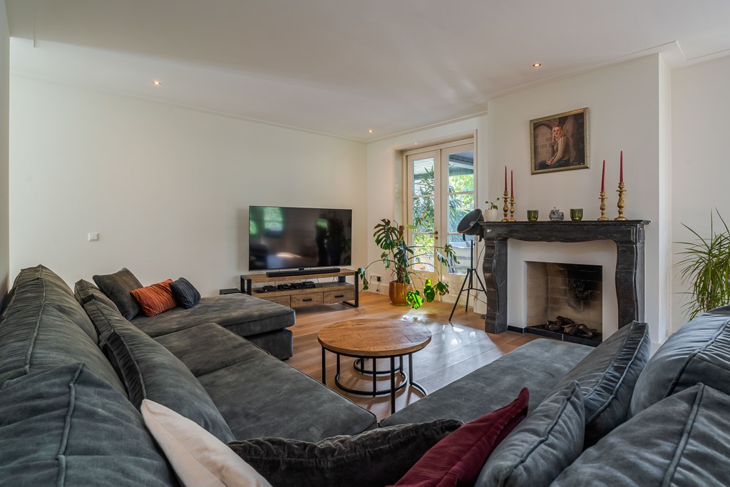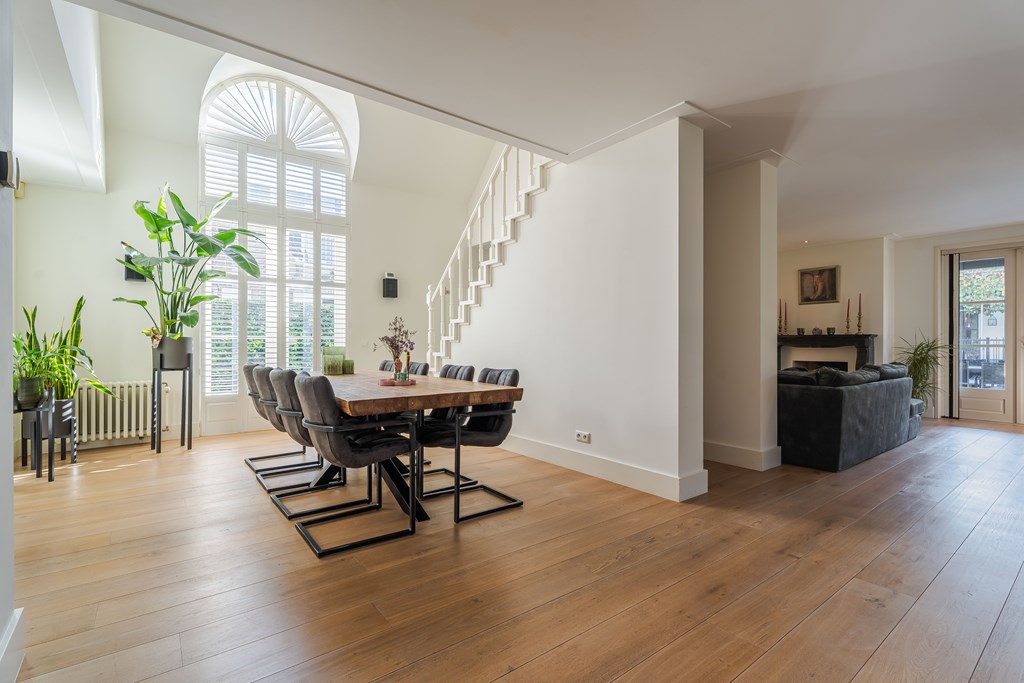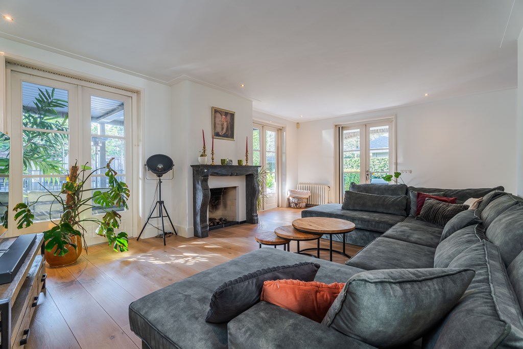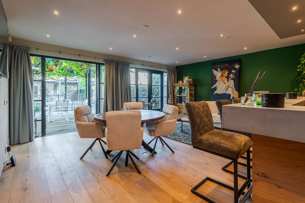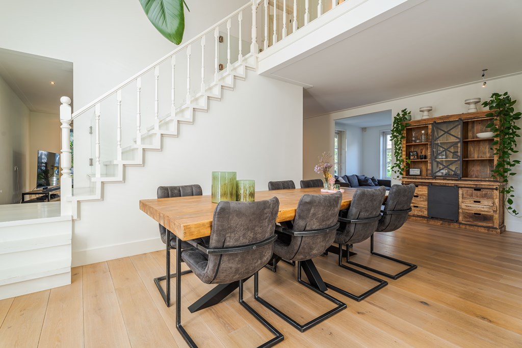 De living is onderverdeeld in een eetkamer, woonkamer en zitkamer. Opvallend zijn de grote en hoge raampartijen waardoor er veel natuurlijke daglichttoetreding in de woning is. De living is voorzien van een parketvloer, inbouwverlichting en een mooie gashaard met schouw. Er zijn maar liefst 3 openslaande tuindeuren waardoor u hier het absolute binnen-buiten gevoel kunt ervaren. De stijlvolle trapopgang is centraal geplaatst met uittreders richting zowel de woonkamer als eetkamer.