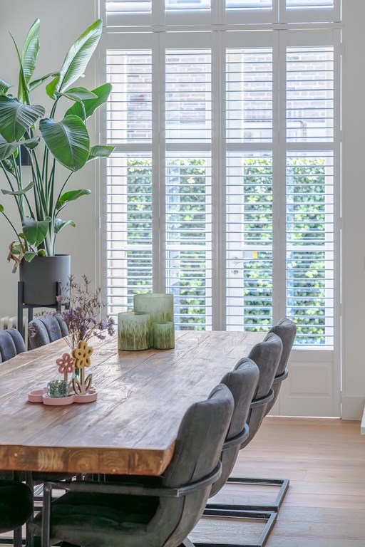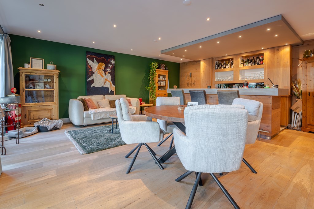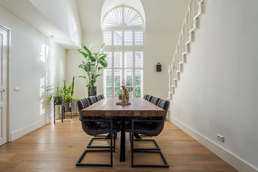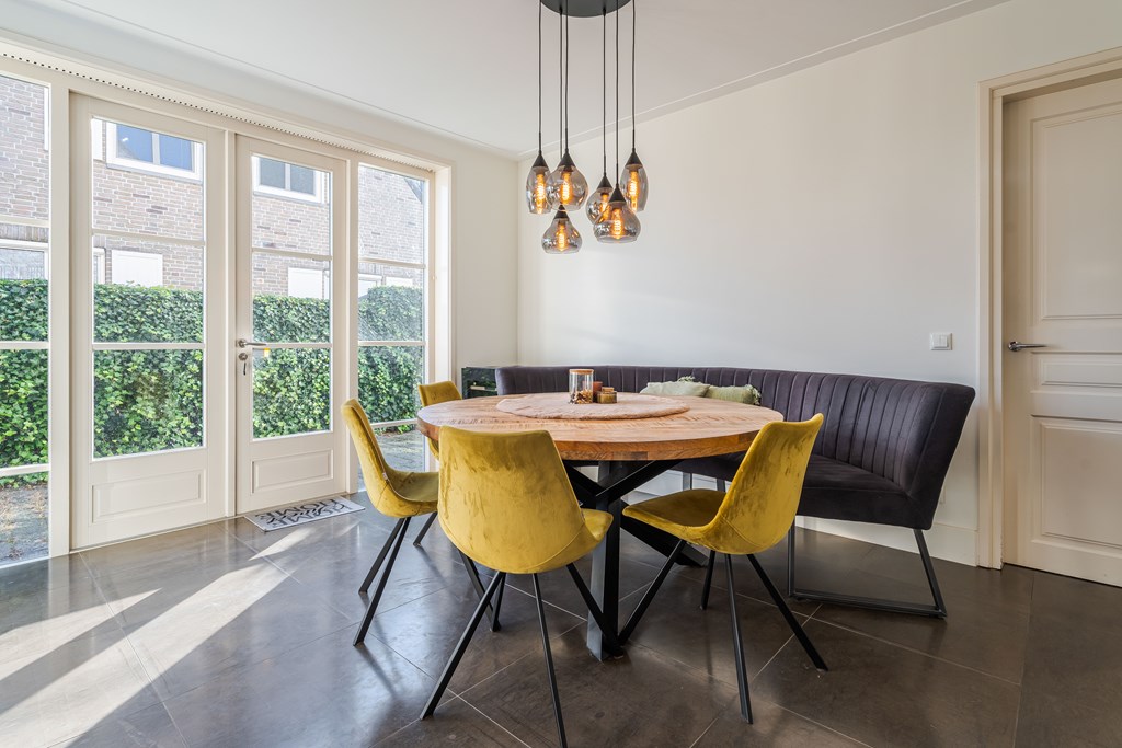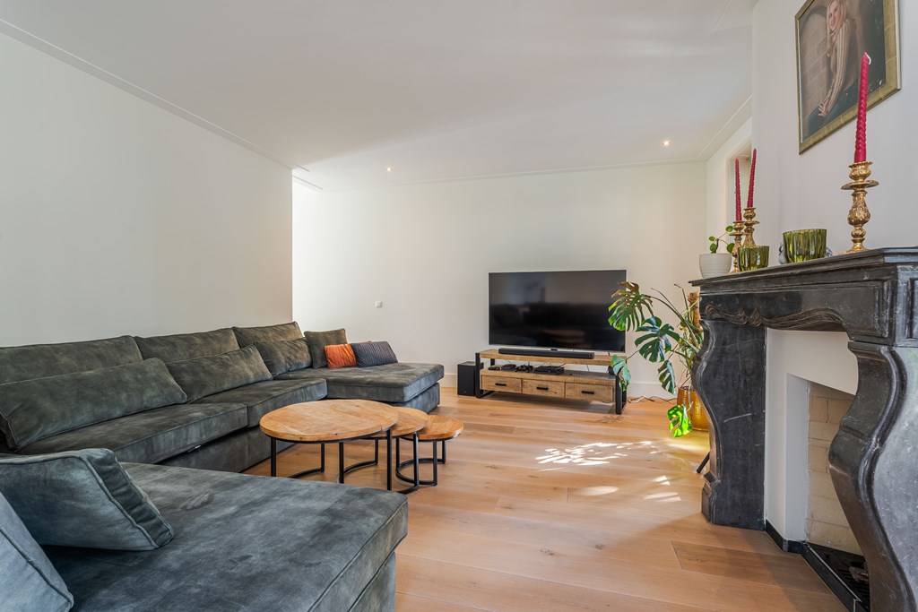De living is onderverdeeld in een eetkamer, woonkamer en zitkamer. Opvallend zijn de grote en hoge raampartijen waardoor er veel natuurlijke daglichttoetreding in de woning is. De living is voorzien van een parketvloer, inbouwverlichting en een mooie gashaard met schouw. Er zijn maar liefst 3 openslaande tuindeuren waardoor u hier het absolute binnen-buiten gevoel kunt ervaren. De stijlvolle trapopgang is centraal geplaatst met uittreders richting zowel de woonkamer als eetkamer.