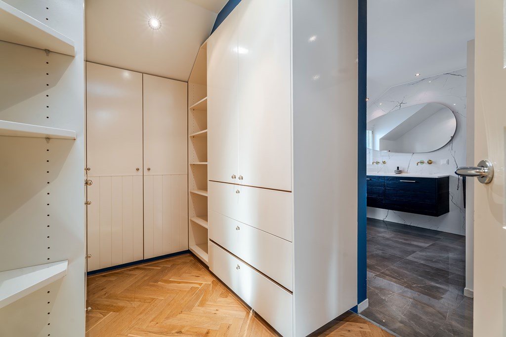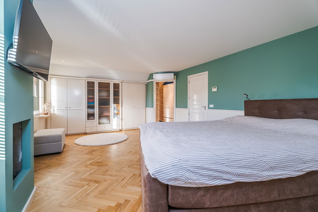 Slaapkamer 1 (master bedroom) is gelegen aan de achterzijde van de woning. Deze slaapkamer is voorzien van een gashaard, kastenwand en een airco. Aansluitend heeft u via de kleedkamer toegang tot de badkamer ensuite.