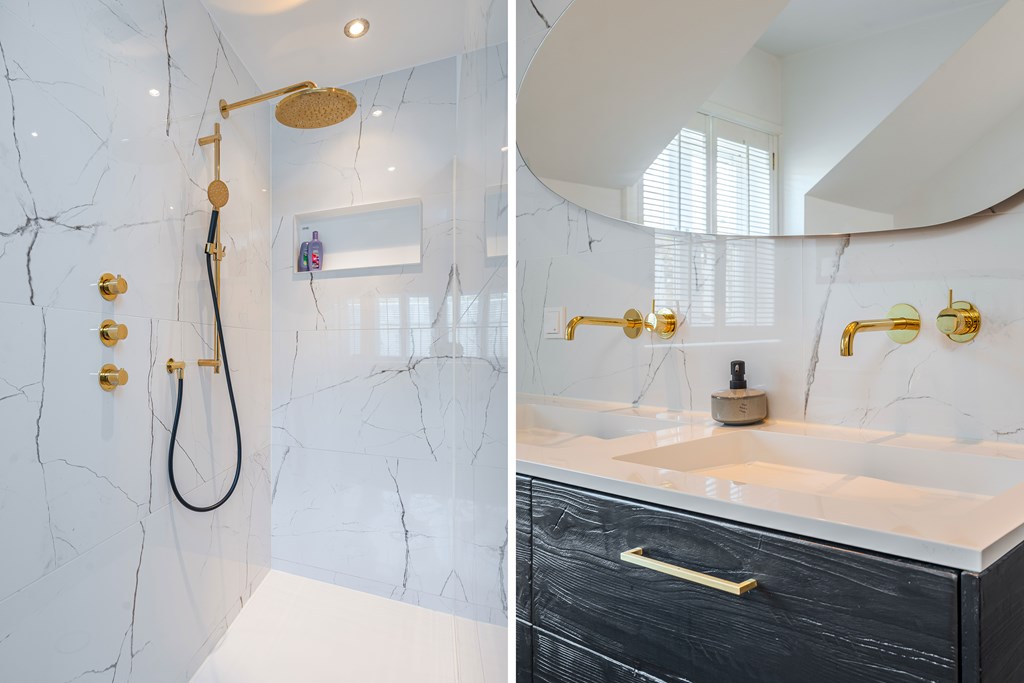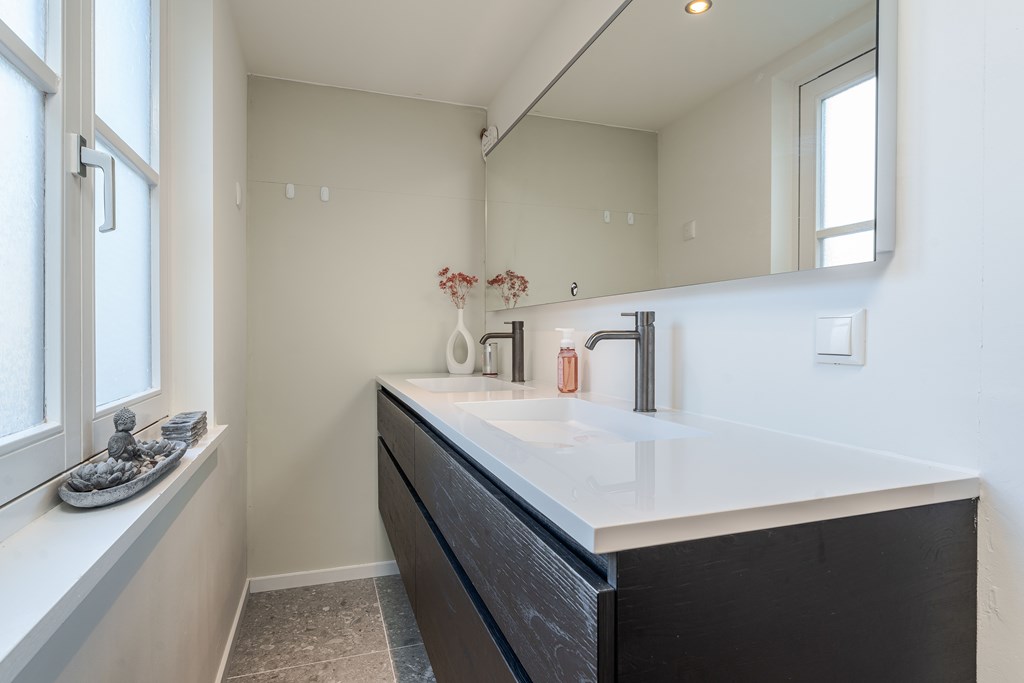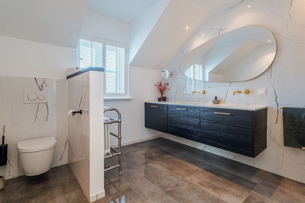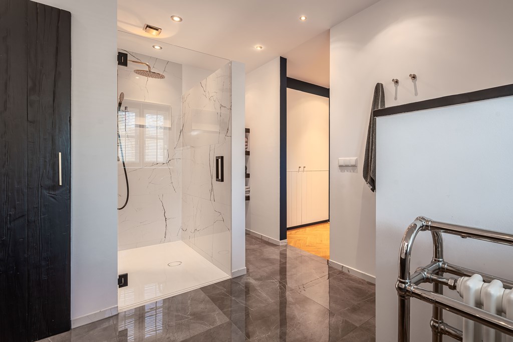 De tweede badkamer is voorzien van een vloertegels, deels betegelde wanden, een inloopdouche, een ligbad en 3 wastafels die geplaatst zijn op kinderhoogte. Op de overloop bevindt zich een separate toiletruimte.