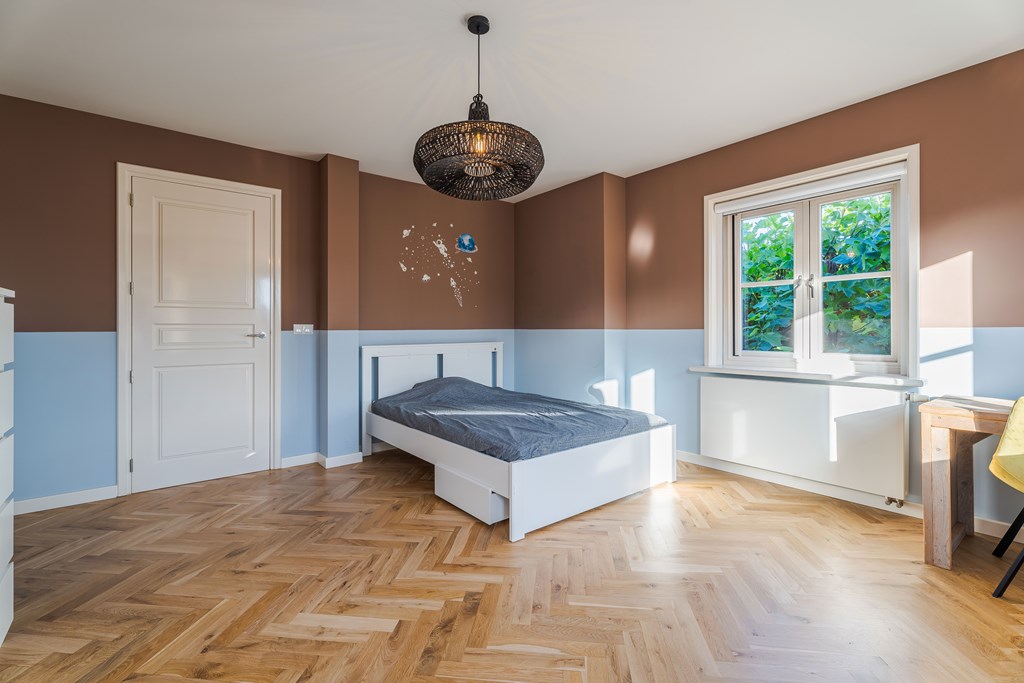 De slaapkamers alsmede de overloop zijn voorzien van dezelfde in visgraat gelegde parketvloer.