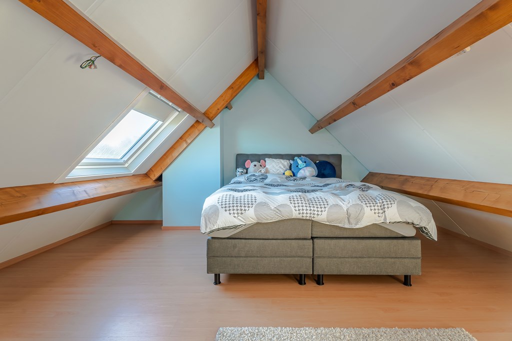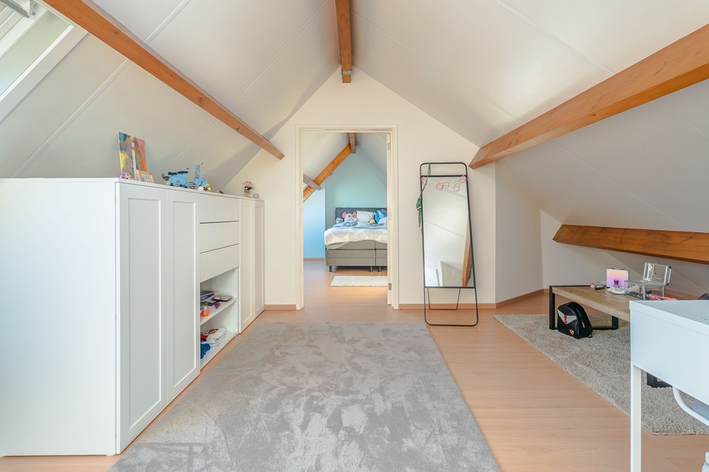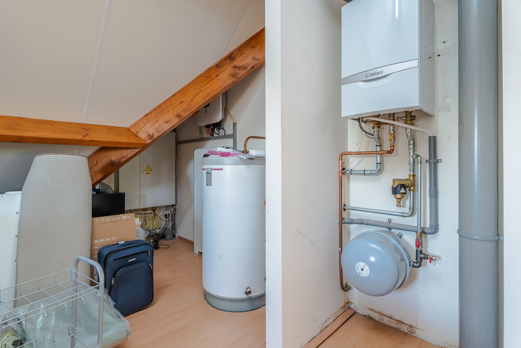 De zolderkamer is voorzien van een airco en biedt plaats aan de technische installatie van de woning. Zo is hier de opstelplaats van de cv-ketel, omvormer van de zonnepanelen, 3 thuisbatterijen, groepenkast en warmwaterboiler geplaatst. De zonnepanelen en thuisbatterijen zijn in december 2023 geplaatst.