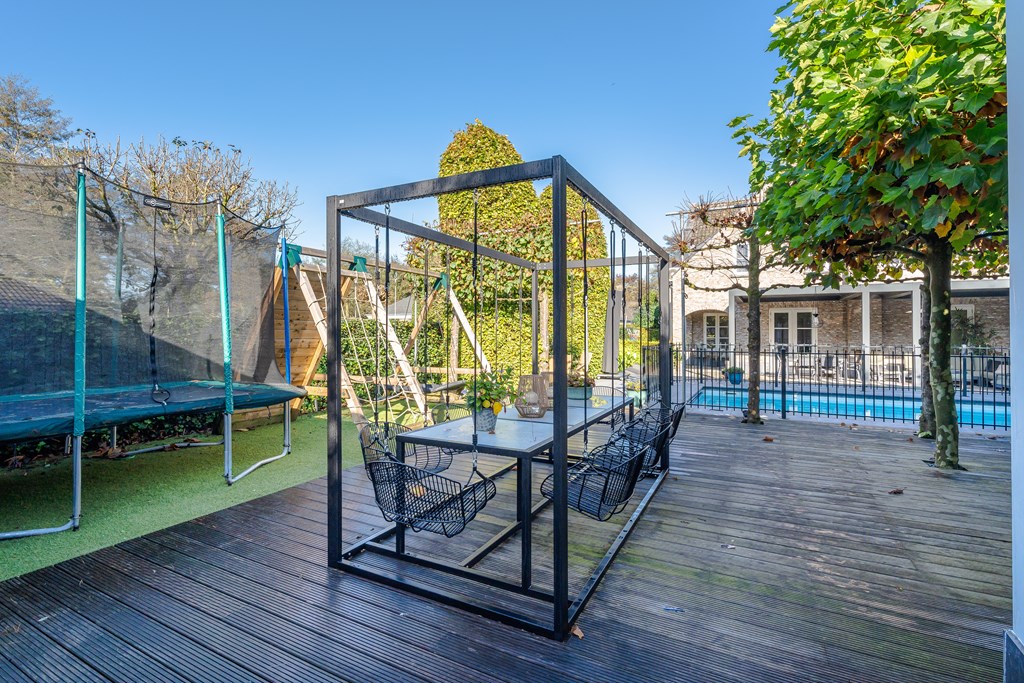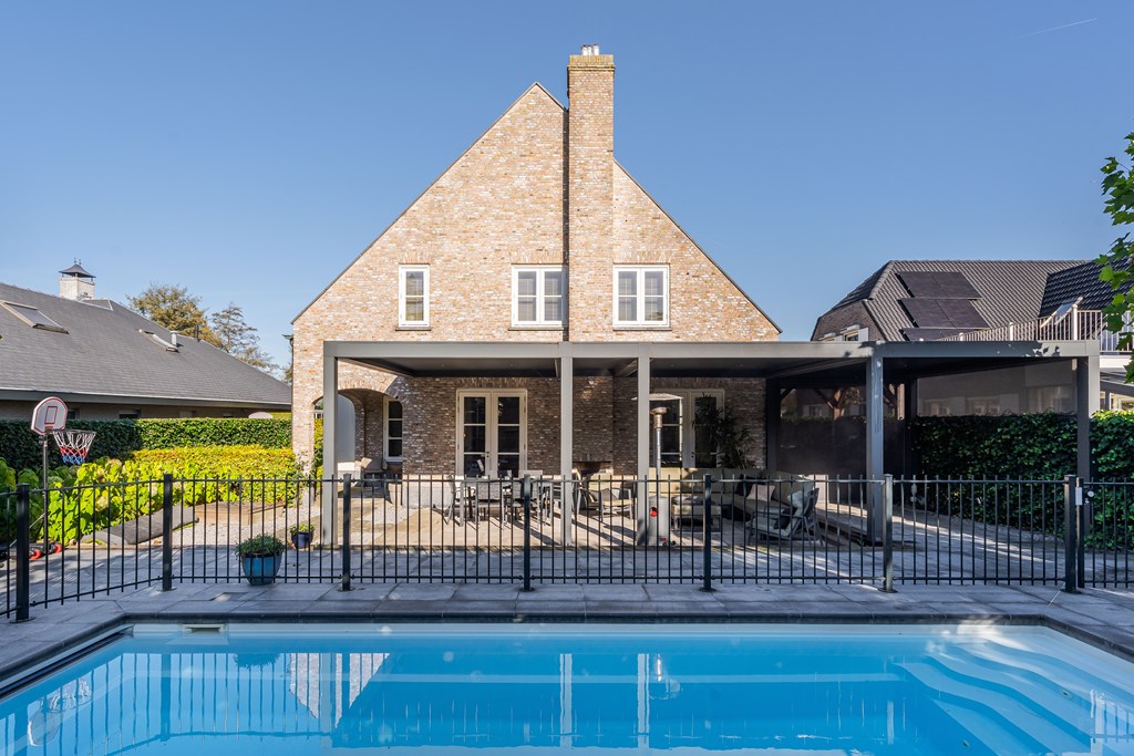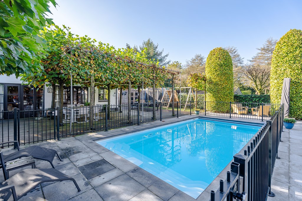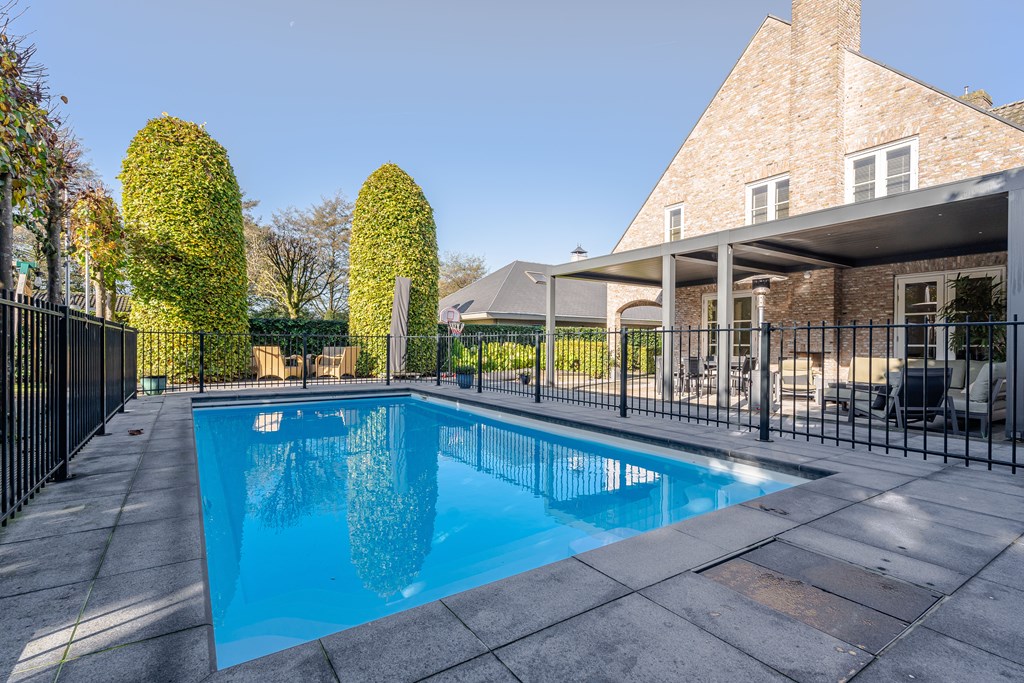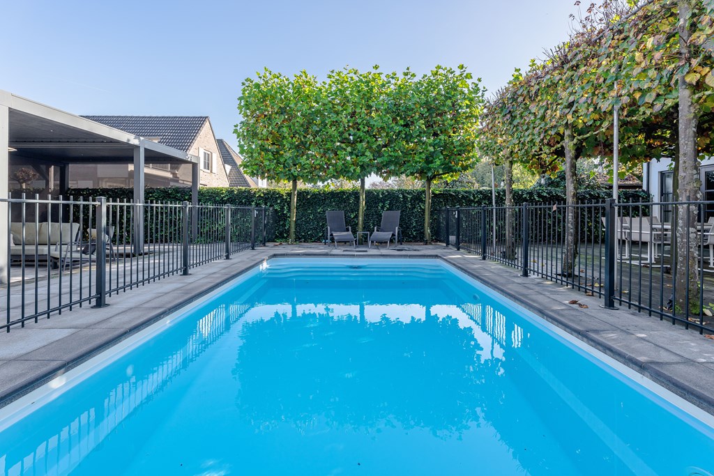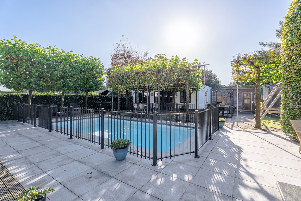In het midden van de tuin ligt een verwarmd zwembad (Starline) met een elektrisch bedienbaar afdekscherm en verlichting. Het daaromheen geplaatste hekwerk kan relatief simpel verwijderd worden.
