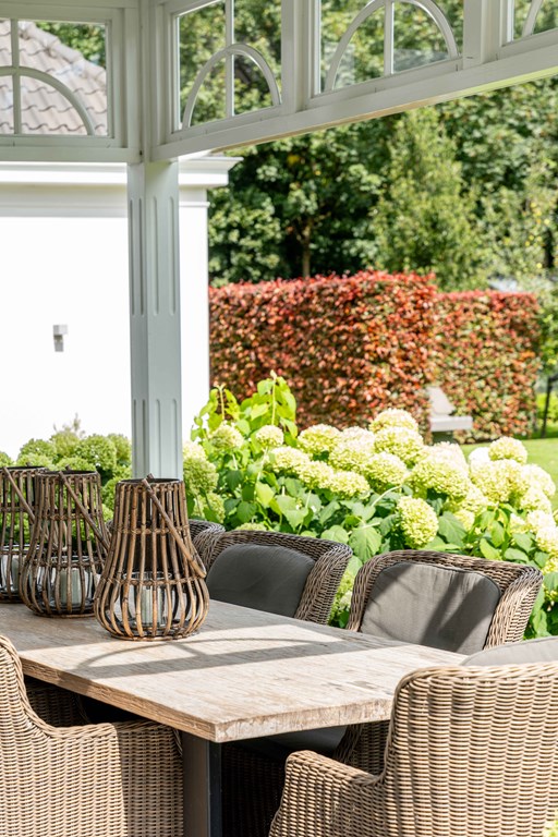 The beautifully landscaped garden surrounds the house and is perfect for those who love outdoor living. It features a spacious lawn, borders with mature planting, fruit trees, lighting, a terrace with veranda, an irrigation system, and various cozy seating areas. There is also space to install a greenhouse. Additionally, the property includes a driveway with ample parking, preparations for a charging station, and a garage with double doors.