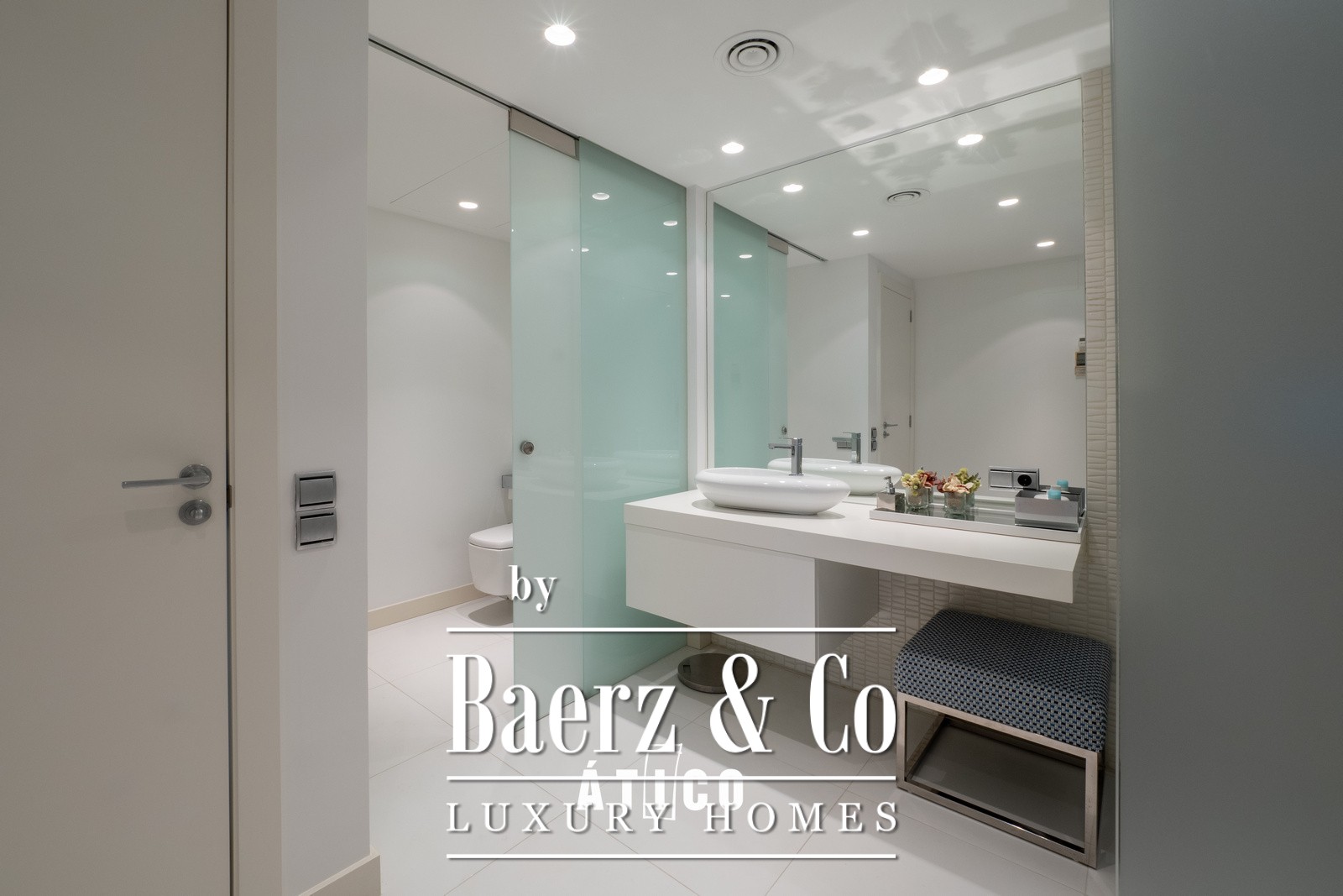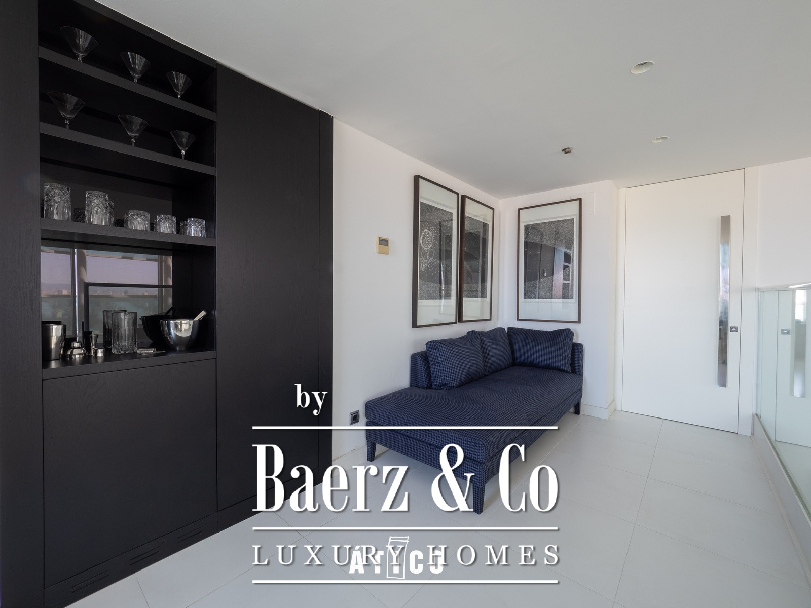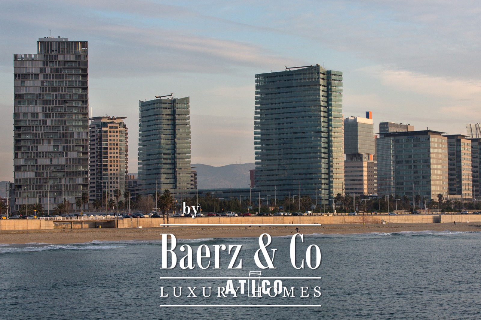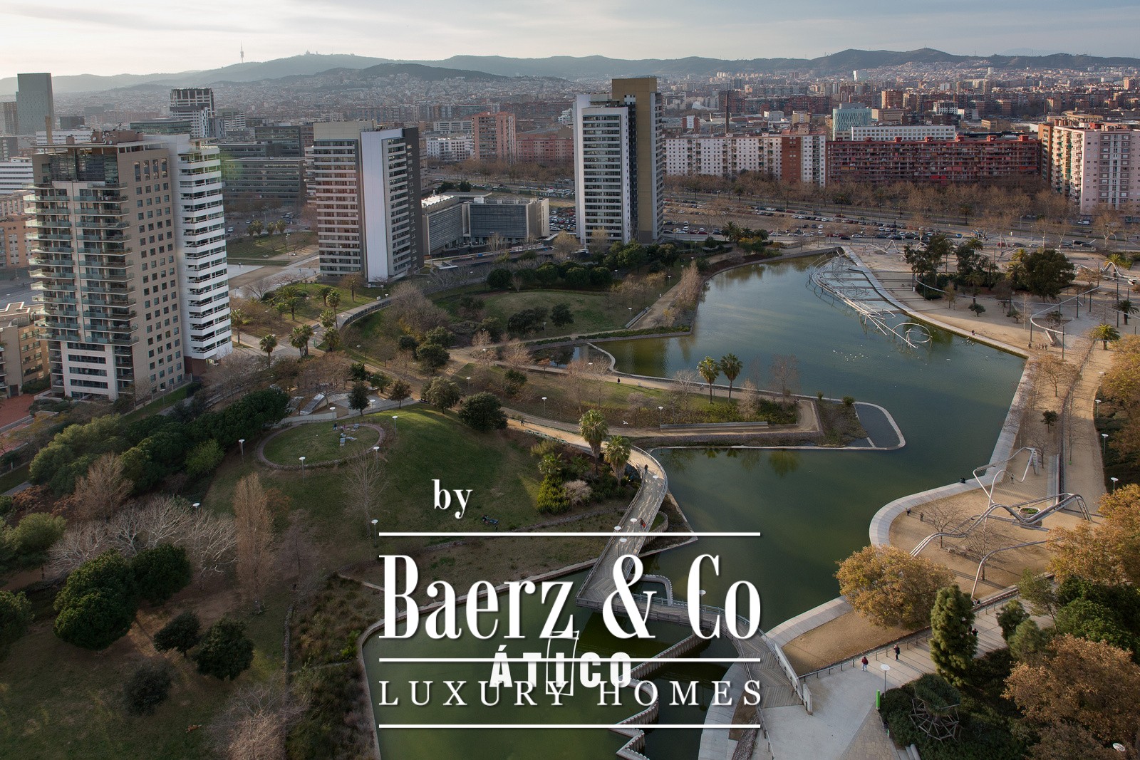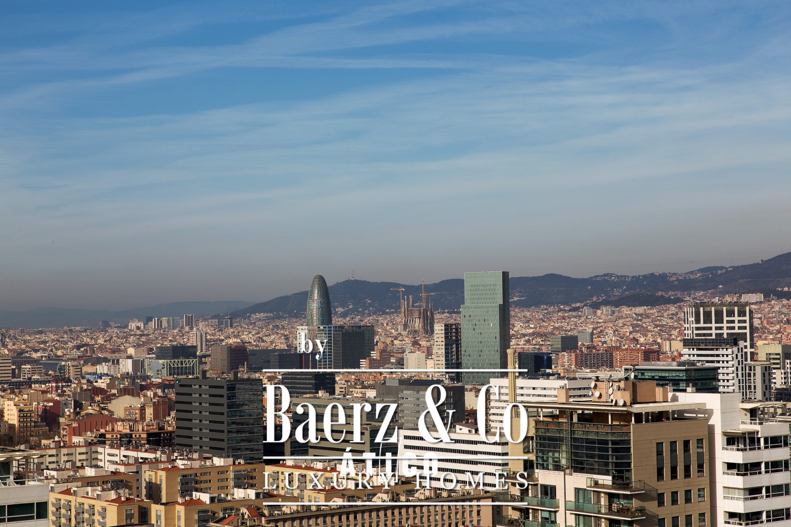 Upon entering, you will be greeted by a bright, open-plan space that maximises the views of the sea and the park with its surrounding waterfalls. The modern and sophisticated design, together with high-quality materials, creates a welcoming and elegant atmosphere. The spacious living room, bathed in natural light thanks to its large windows, offers stunning panoramic views of the vibrant city of Barcelona, as well as access to a terrace that surrounds the entire apartment and features a private pool.