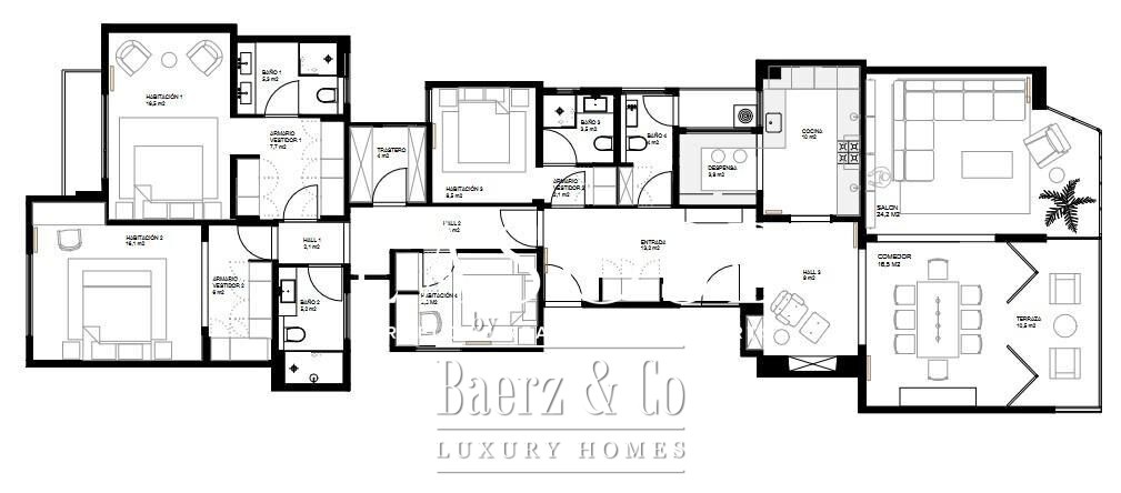 LASOSE is pleased to present this spectacular 226 sqm apartment on Aribau street, with parking, storage room and partial sea and Sagrada Familia views.. . The apartment is currently under renovation, and the renderings in the ad show the final design planned for the property.. . Located on the seventh floor of a building with elevator, the apartment has 4 bedrooms in total: 2 large bedrooms of 16 m² each, with private bathroom and built-in closets, and 2 interior rooms of 9 m² each. One of the large bedrooms has access to a balcony overlooking the sea and the Sagrada Familia, as well as enjoying natural light in the morning. The spacious living room opens onto a terrace of 10 m², overlooking Aribau street and sun in the afternoon.. . The property has 4 bathrooms, 2 of them en suite, and fitted closets. It also has natural gas heating and air conditioning.. . The price includes a storage room and a parking space in the same building. The building has concierge service on